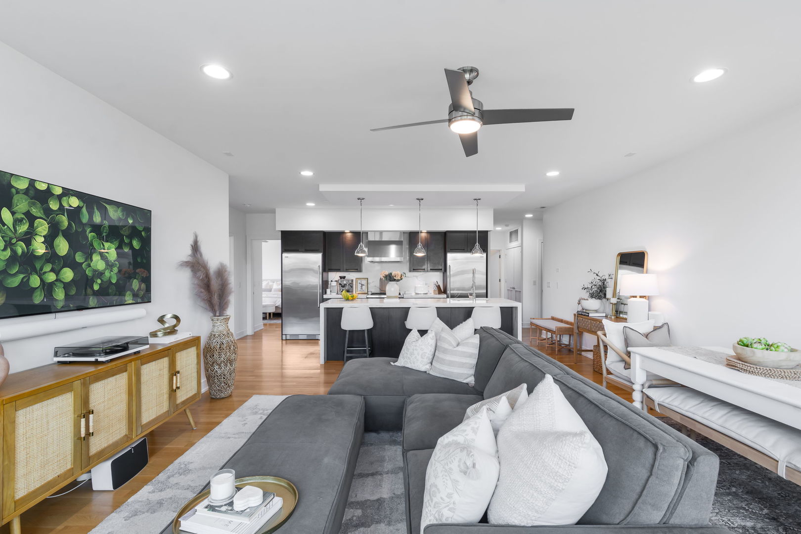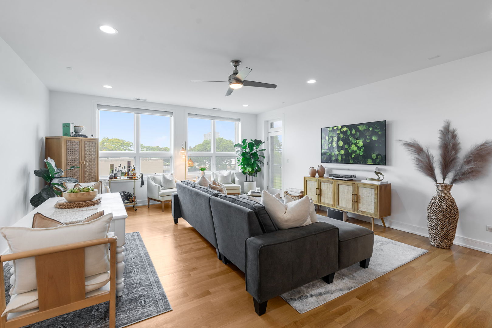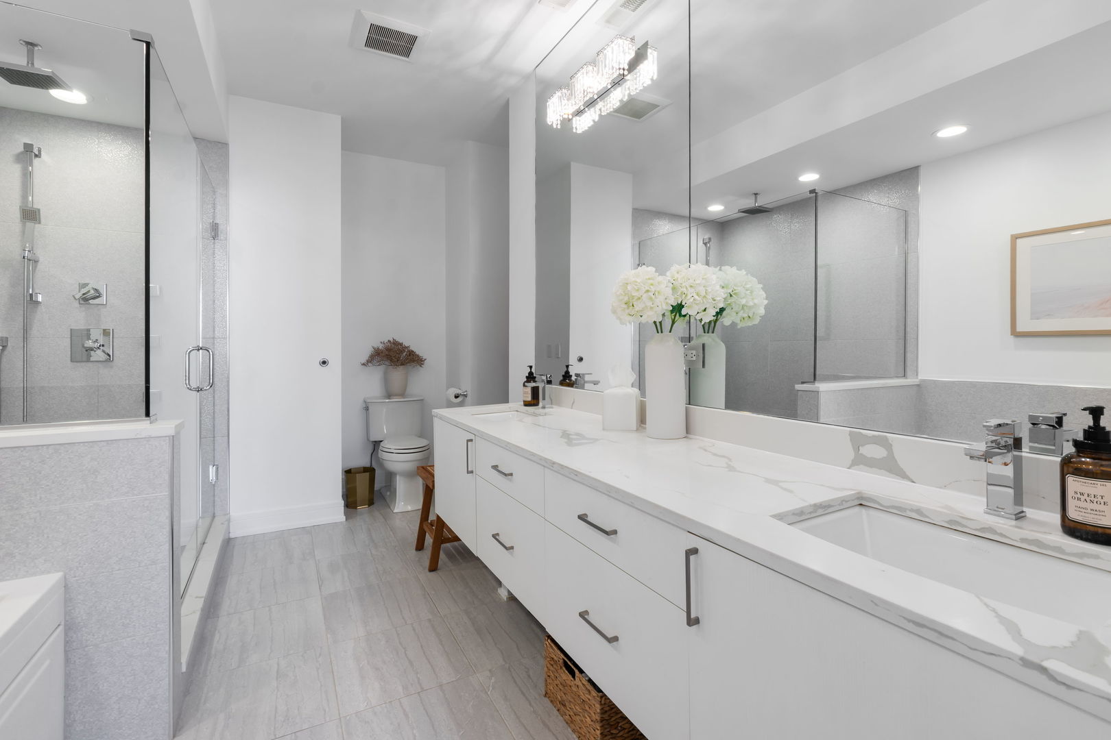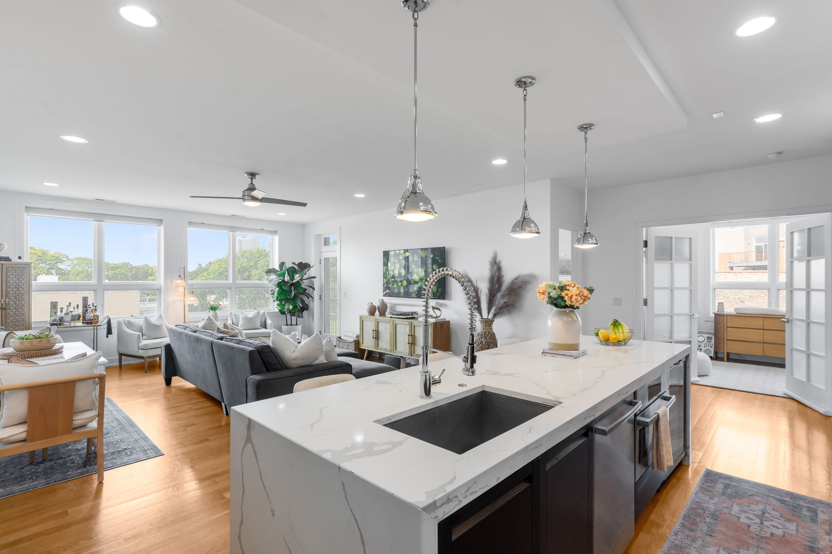 Welcome to your new home at the intersection of Old Town and River North, The Stanton! Built in 2016, this 3-bedroom, 2-bathroom home offers soaring 9′ ceilings, expansive windows with west and north exposure, and an airy open-concept layout designed for both everyday living and entertaining. The chef’s kitchen features sleek European soft-close cabinetry, high-end stainless-steel appliances, quartz countertops, and a dramatic waterfall island that anchors the space. The living and dining areas flow seamlessly onto a private balcony-perfect for enjoying your morning coffee or evening sunsets. The massive primary suite is a true retreat, complete with a walk-in closet and a spa-inspired en-suite bath boasting heated floors, a dual vanity, a soaking tub, and a separate glass-enclosed shower. Two additional bedrooms offer flexibility for a guest room, home office, or fitness space. Additional highlights include hardwood floors throughout, in-unit laundry, and 2 heated garage parking spaces. With its unbeatable Old Town location, you’re just minutes from Wells Street dining, Lincoln Park, boutique shopping, the lakefront, and easy access to public transit. This home checks every box for modern city living-style, comfort, and convenience in one of Chicago’s most desirable neighborhoods.