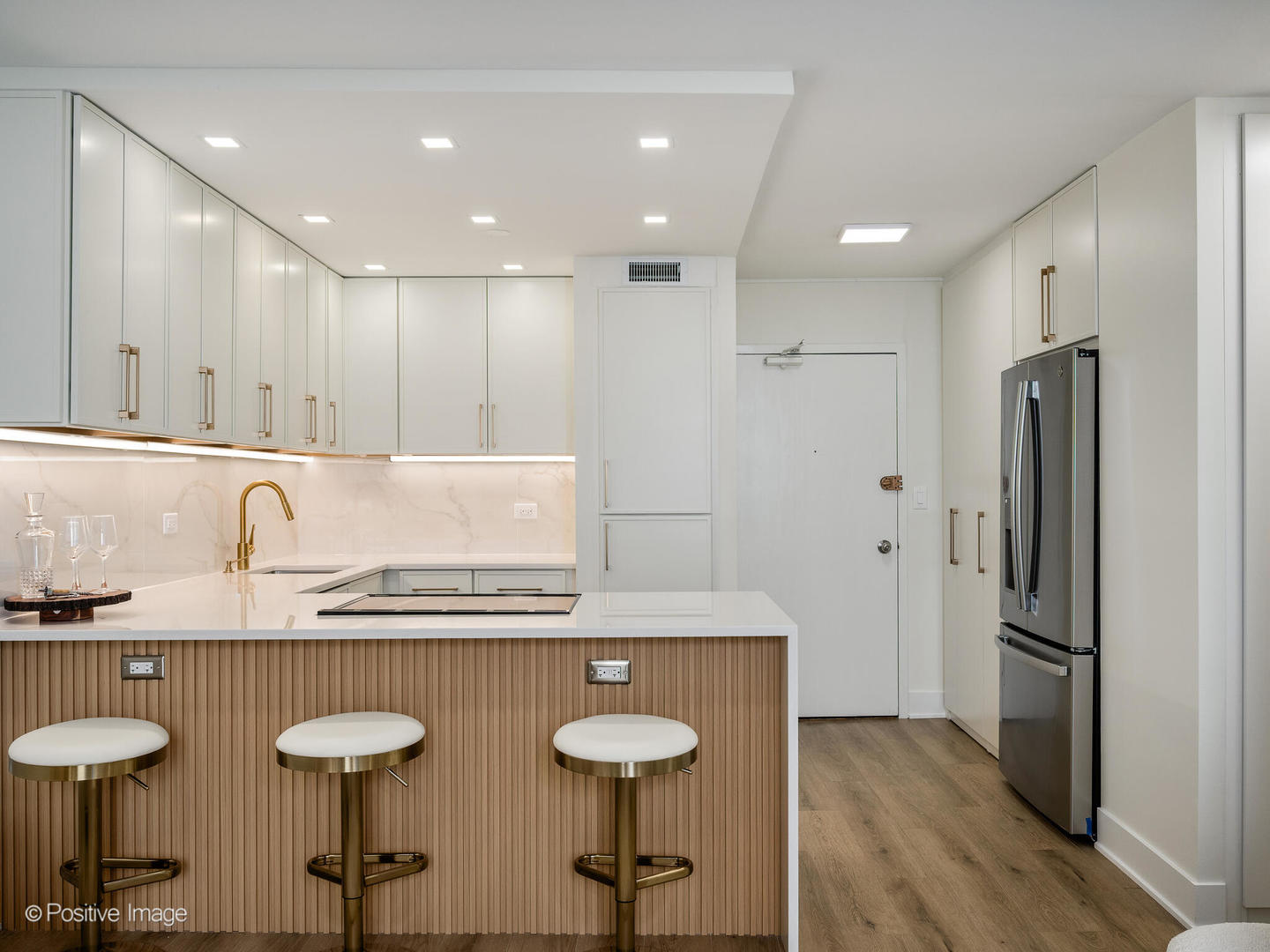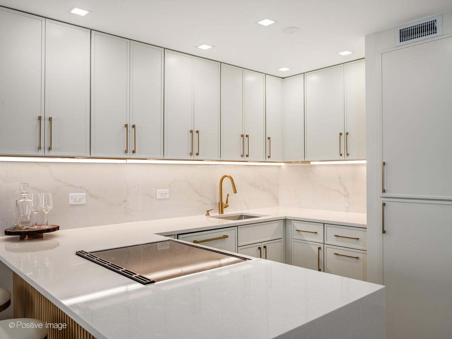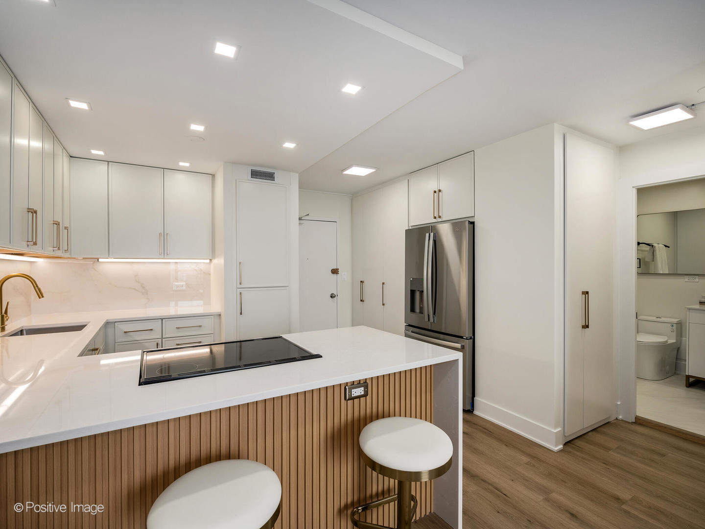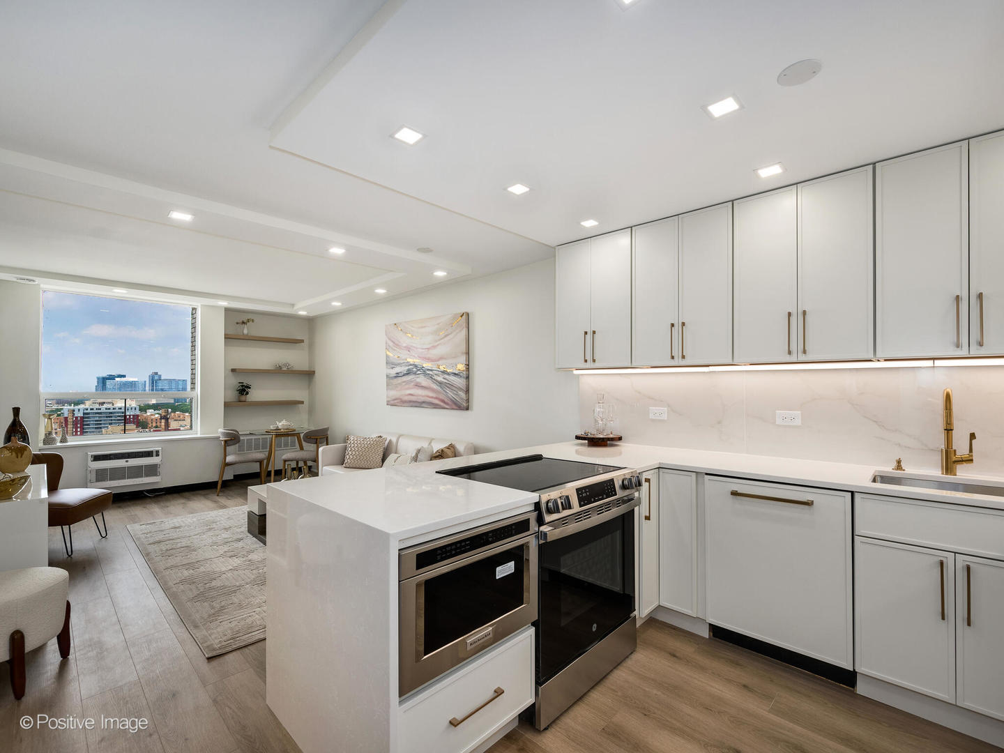 Presenting this stunning brand new gut rehabbed one bedroom condo in Dickinson House, Sandburg Village – Ideally located between Old Town & Gold Coast. The 17th floor unobstructed western exposure provides lots of natural light and vast open views over the city and stunning sunsets. Be the first to live in this unit that has been meticulously renovated and is very well appointed with top quality and tasteful finishes- The kitchen has custom white slim shaker cabinets with gold accent hardware and fixtures, under cabinet led lighting, quartz counters & peninsula with breakfast bar and waterfall end, overhead recessed lights. High end appliances including Bosch built-in panel dishwasher, french-door refrigerator, microwave drawer. Bathroom has a new walk-in shower with sliding glass door, black/gold accented hardware & fixtures, finished with contemporary tiles. Throughout the unit there are wide plank natural wood color floors, specialized paint used with air sanitizing technology. There are plentiful closets, all are professionally organized. New electrical and plumbing. Monthly assessment includes heat, Direct TV (200+ channels) and internet service (1GB!), everything except electricity. Dickinson House is a well run building with good reserves, many recent major updates completed including new elevators and renovated hallways and building facade work. No specials. Great amenities- Sandburg Village has 2 Olympic size outdoor heated swimming pools with sundecks, tennis courts & pickle ball. The landscaped courtyards, play lot, commercial facilities provide a welcoming community environment. The building has door-person, onsite maintenance team and management, a rooftop deck, additional storage cage (provided with unit), bike room. Garage parking in this building is all leased and currently has a waitlist. Convenient for transportation – 1 block to train/subway, buses, Lake Shore Dr, bike path. Close to Old Town, downtown, Lincoln Park. Enjoy all attractions of the neighborhood – restaurants, nightlife, shopping/grocery, Lakefront trail, beach, parks. Pets allowed.