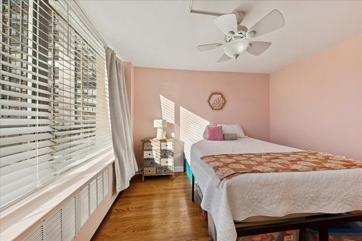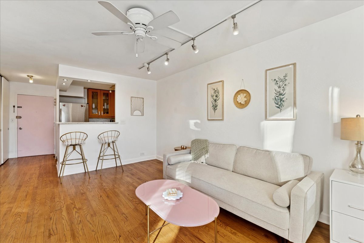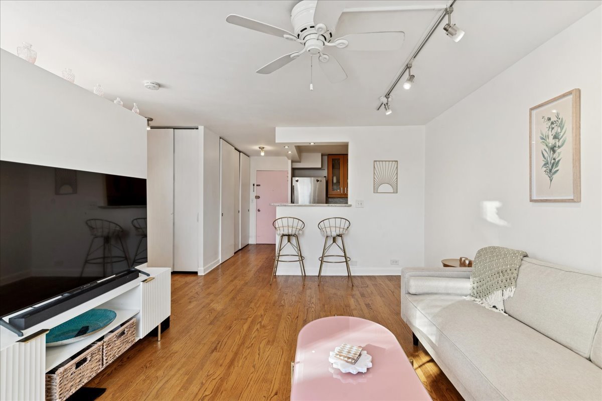 Welcome to one of Chicago’s most sought-after locations, where the Gold Coast meets Old Town. This spacious junior one-bedroom is ideally situated in desirable Sandburg Village and offers west-facing views of the beautifully landscaped courtyard and stunning sunsets! Freshly painted in 2025, this move-in-ready home features hardwood floors throughout, a generously sized bedroom with faux wood blinds and blackout window treatments, and a newly updated full bath (2025). The open kitchen is well-appointed with 42″ maple cabinetry, stainless steel appliances, a breakfast bar, and generous storage-perfect for both everyday living and entertaining. The unit includes a dedicated additional storage space and access to an array of exceptional amenities, including a rooftop deck, hospitality rooms, a package receiving room, Tide Laundry Service, 24/7 door staff and security, bike room, tennis courts, and two swimming pools. Monthly assessments cover heat, water, cable, and internet. Heated indoor parking is available (subject to wait list) for an additional monthly fee. Pet friendly and investor friendly, this prime location is just steps from public transportation, parks, great restaurants, shopping (Jewel Osco is just two blocks away), Lincoln Park Zoo, and North Avenue Beach. Enjoy quick access to the lakefront with miles of biking and running paths. – Here’s your opportunity to live in an unbeatable location-move right in and enjoy the best of city living. Being sold AS IS & $500 Credit at Closing!