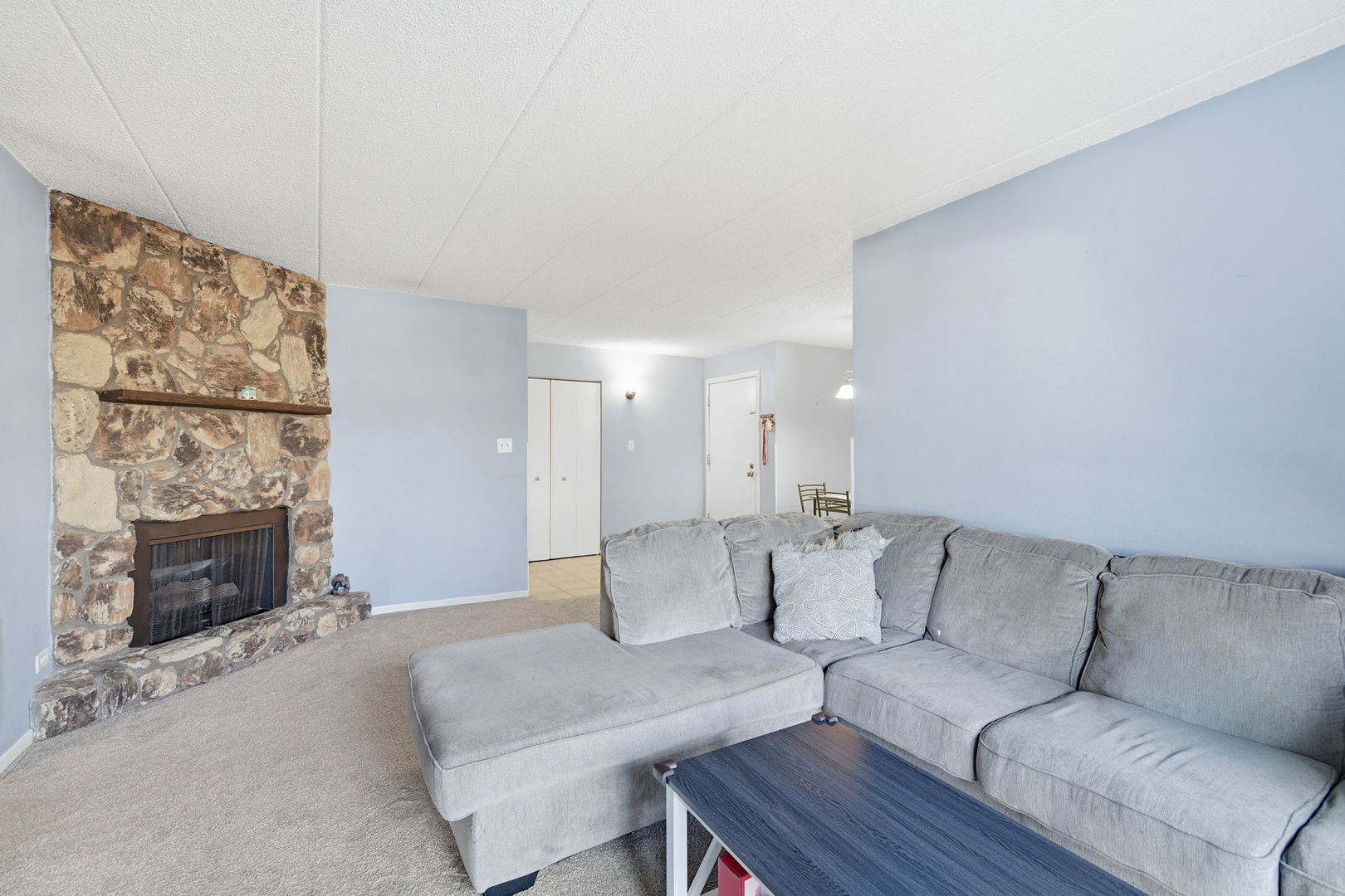 Imagine winding down by the stone fireplace after a long day, then stepping out onto your private balcony overlooking the pond for a quiet breath of fresh air. It’s the perfect place to reset when the rest of the home (or the day) gets a little busy. This warm and inviting condo offers a bright, open layout with generous living and dining spaces designed for both everyday comfort and entertaining. New carpet in the living and dining rooms creates a fresh, move-in-ready feel, and the living room opens directly to the balcony for easy indoor-outdoor flow – coffee in the morning, wind-down in the evening. The kitchen features ample cabinetry and counter space, with a dedicated dining area just off the kitchen for casual meals or gatherings. Two spacious bedrooms offer flexibility for a primary suite, guest room, nursery, or home office; because life needs options. Features include a new A/C unit in 2025, in-unit laundry (no trips down the hall or to the laundromat), and a detached garage space. The well-maintained community offers an in-ground seasonal outdoor pool, so consider your summer plans officially covered. Low taxes add even more value. Conveniently located near I-294 and I-57, as well as shopping, dining, and walking paths, this condo delivers comfort, convenience, and a peaceful setting you’ll be happy to come home to. Call today to schedule your private tour!
