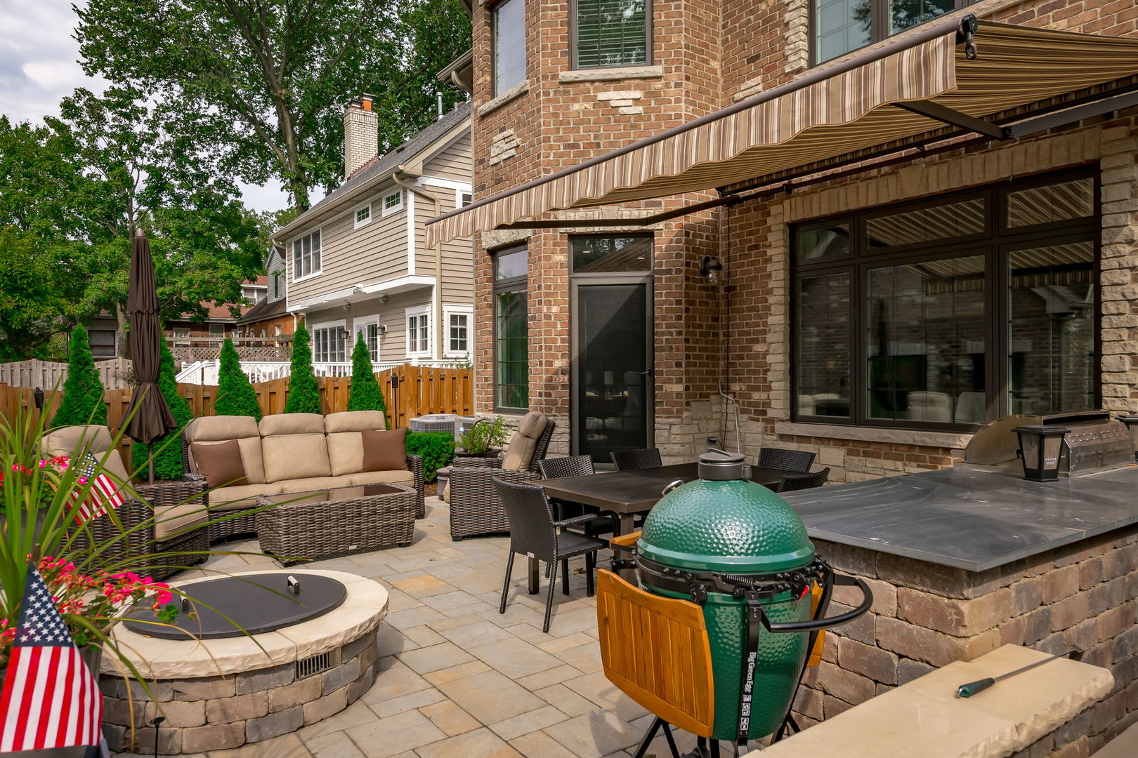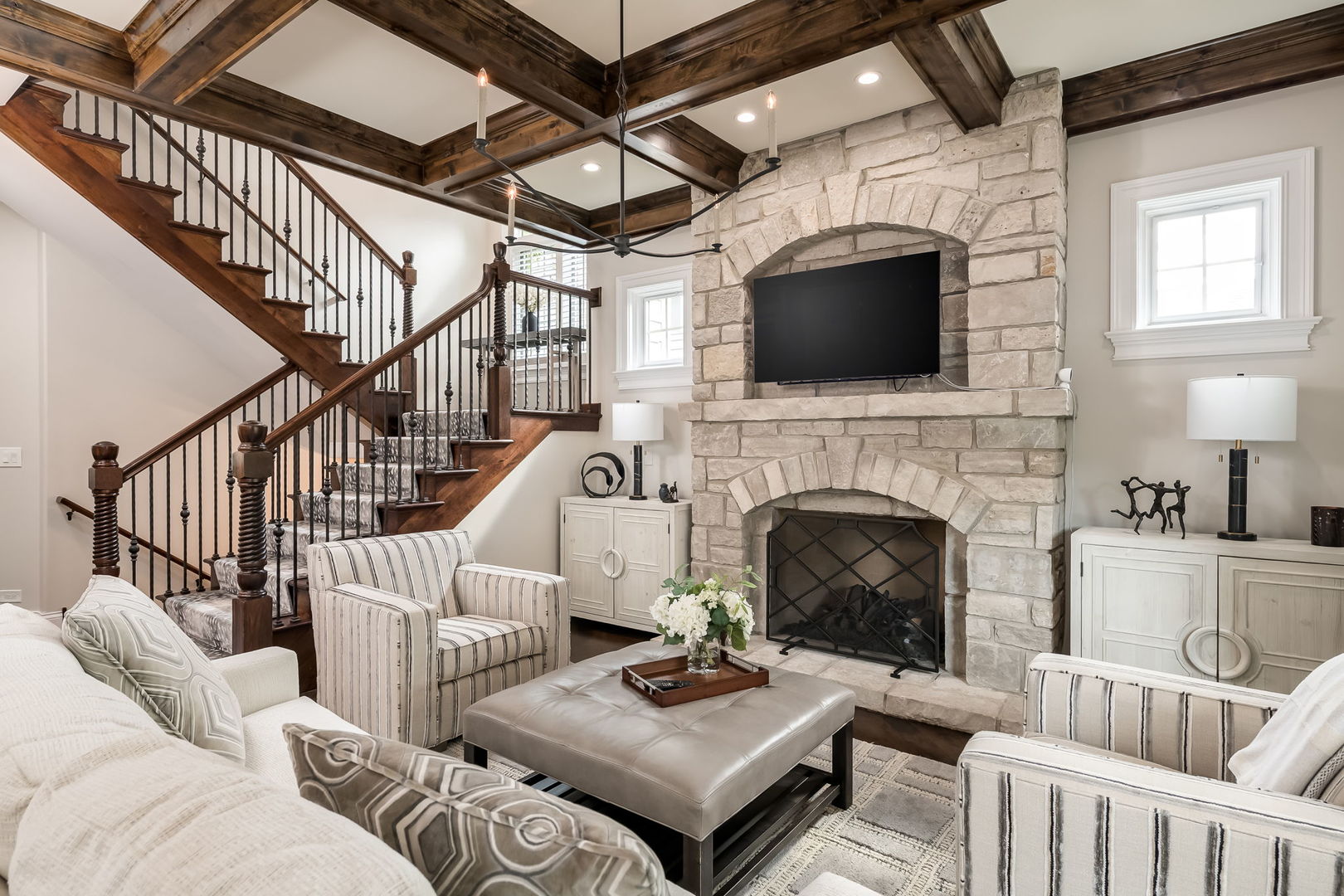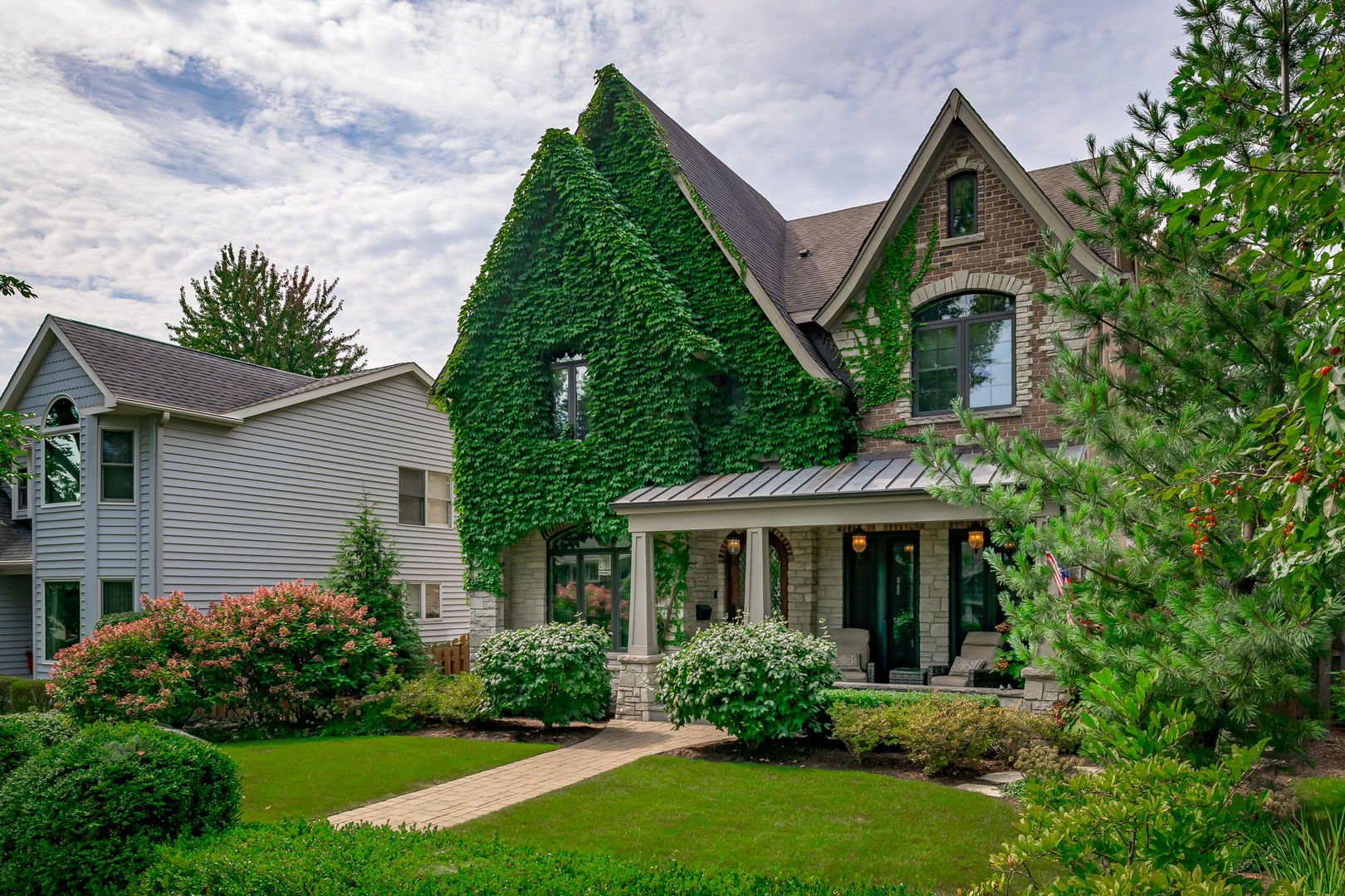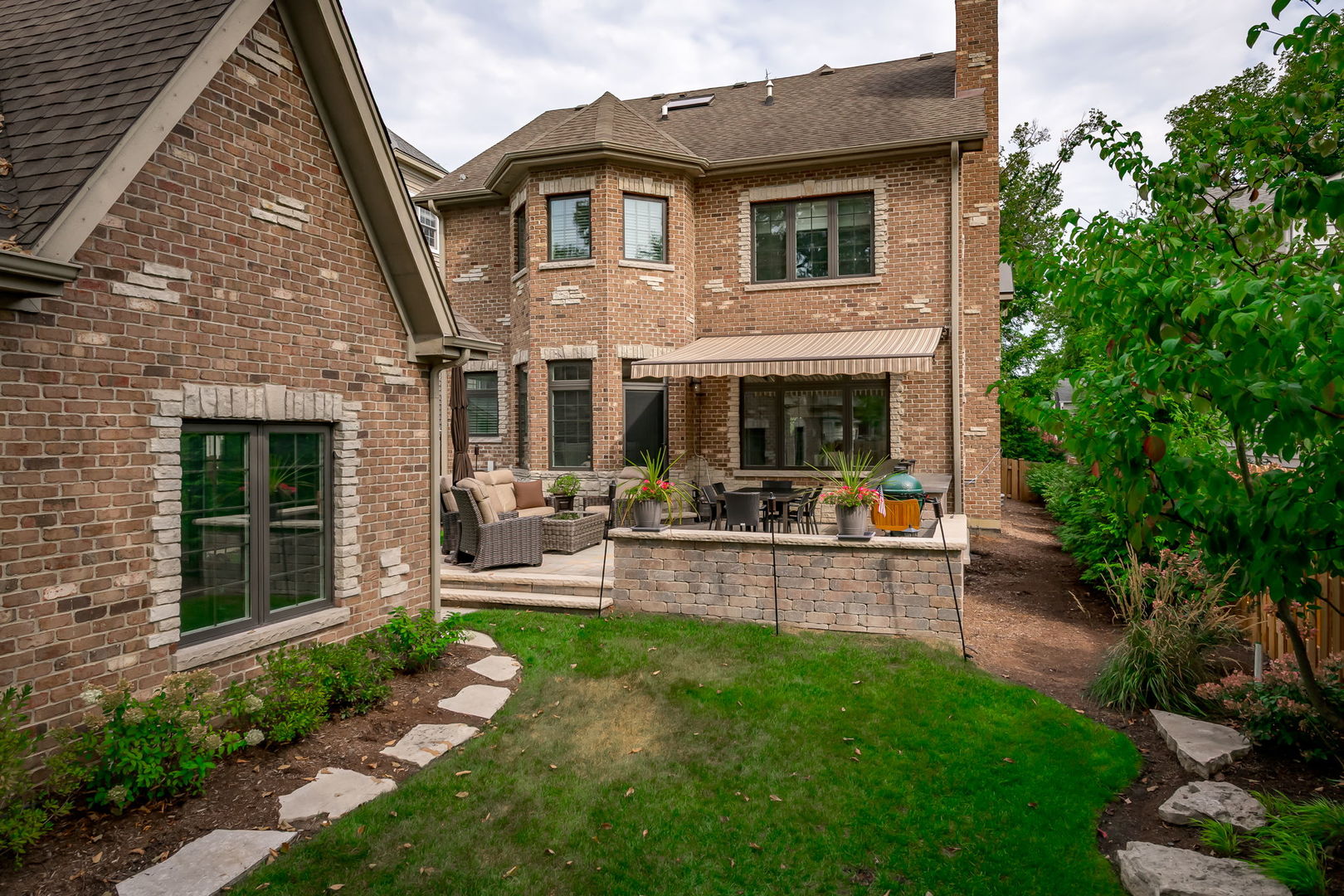 Fall in love with this enchanting brick and stone English Tudor, where timeless elegance meets modern luxury. From the moment you arrive, you’ll be charmed by the beautifully landscaped yard and welcoming front porch-perfect for morning coffee and soaking in the neighborhood’s serene charm. Step inside to a thoughtfully curated interior featuring soaring ceilings, exquisite millwork, and impeccable finishes throughout. The main level boasts a separate formal dining room with French doors that open to a lovely front veranda, a cozy sitting room, and a designer powder room. The heart of the home is the modern white kitchen, outfitted with high-end Sub-Zero and Wolf stainless steel appliances, granite countertops, and a stylish backsplash. Nestled between the kitchen and dining room, a sleek butler’s pantry offers custom cabinetry, a mini wine fridge, and additional prep space. The sunlit family room is a true showstopper, showcasing a striking stone fireplace, wood beam coffered ceiling, and an effortless flow to the rest of the home-perfect for both everyday living and entertaining. Just off the kitchen, you’ll find a well-appointed mudroom with a custom bench, hall tree, and a pantry closet. Upstairs, the second level features a convenient laundry closet, four spacious bedrooms, and three full bathrooms, including a serene primary suite. The primary retreat impresses with a tray ceiling, spa-like bath featuring separate vanities, a soaking tub, large walk-in shower, and a generous walk-in closet. The second bedroom enjoys its own ensuite bath, while the third and fourth bedrooms share a Jack & Jill bath with dual vanities and a tub/shower combo. The third floor offers incredible versatility with a spacious flex room-ideal as a guest suite, private office, or playroom-complete with a full bath featuring a skylight and walk-in shower. The fully finished lower level is designed for both relaxation and recreation. Enjoy a cozy stone fireplace surrounded by custom built-ins, a stylish full bar, expansive rec and dining areas, a workout room, and a full secondary laundry room with utility sink, side-by-side washer/dryer, and custom cabinetry. Step outside and prepare to be wowed. The newly designed patio includes a gourmet outdoor kitchen with a built-in grilling station, beverage fridge, honed black granite countertops, deck lighting, fire pit and a motorized awning for added comfort. The fully fenced backyard offers privacy and tranquility on a quiet, tree-lined street. With four levels of beautifully finished living space, this exceptional home is a rare opportunity-offering the perfect blend of character, craftsmanship, and comfort. Don’t miss your chance to make it yours!