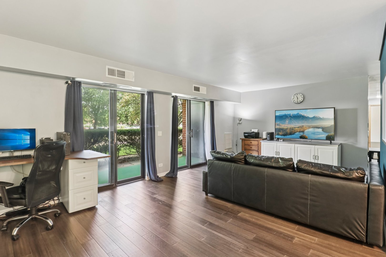 Welcome to Dana Point Condominiums, where modern upgrades meet everyday convenience in a prime Arlington Heights location. This fully updated end-unit ground-level home offers 3 spacious bedrooms, 2 refreshed bathrooms, and a thoughtfully designed layout. Immediately upon entry, the kitchen is to your left, featuring sleek new cabinetry, countertops, and appliances. From here, the floor plan flows into a dining and living room area, creating a seamless space for both gatherings and quiet evenings. Sliding doors open to the private patio and outdoor space, a cozy extension of the home that’s perfect for crisp fall mornings with coffee or winding down on cool evenings. The hallway to the right leads to the home’s private wing. Here, you’ll find two generously sized bedrooms, a full updated hall bath, and at the end of the hall, the primary suite with a walk-in closet and its own refreshed en-suite bathroom, plus additional exterior access. New flooring and fresh paint run throughout, giving the home a crisp, modern feel. Community amenities include a pool and exercise facilities, plus shared laundry. This unit comes with one interior garage space and two exterior parking spots. Conveniently located near shopping, dining, schools, and commuter routes, Dana Point combines modern comfort with practical living.