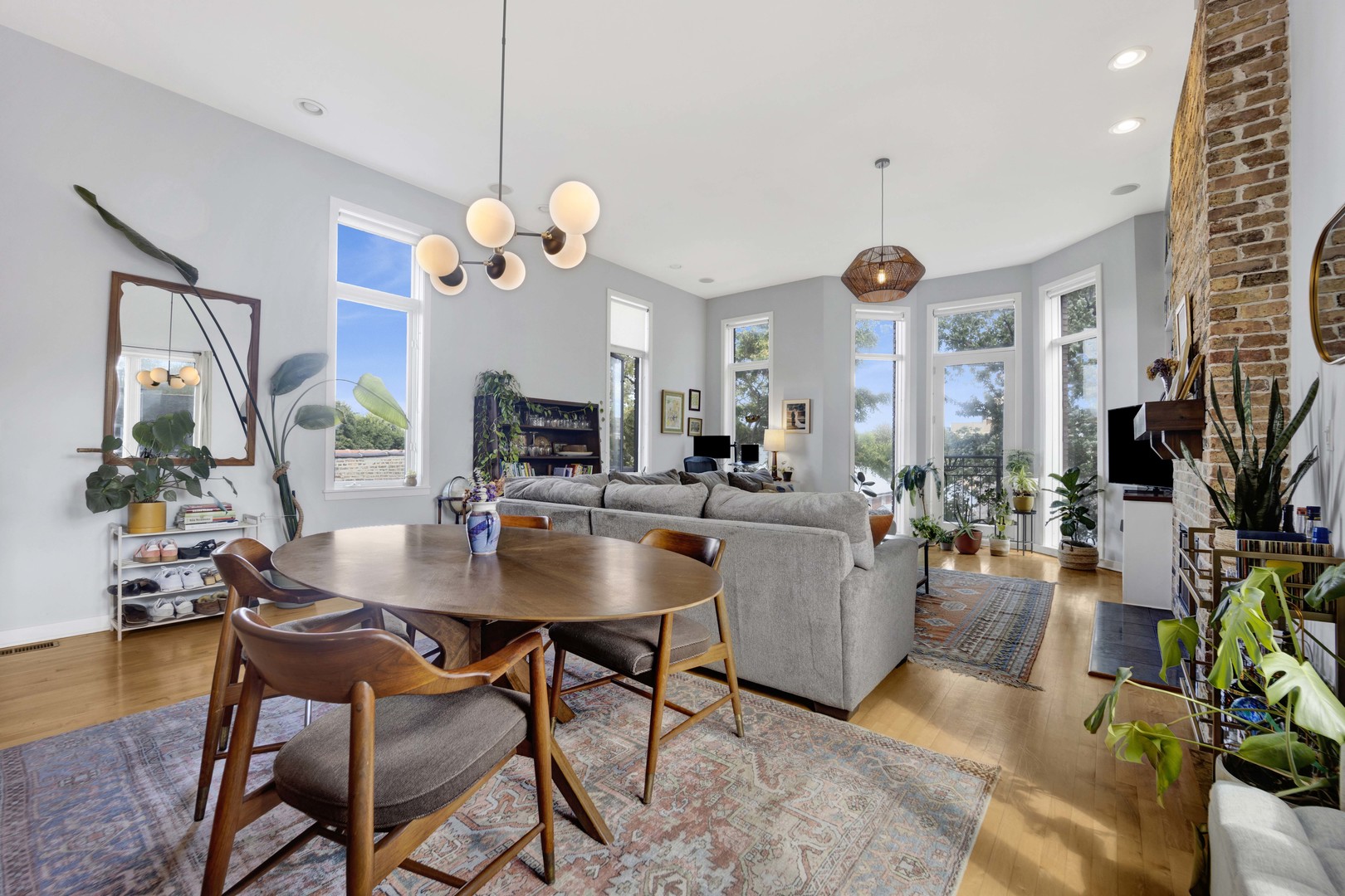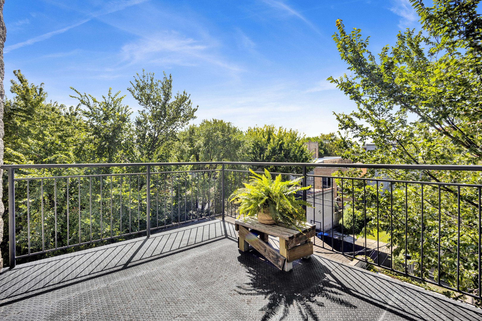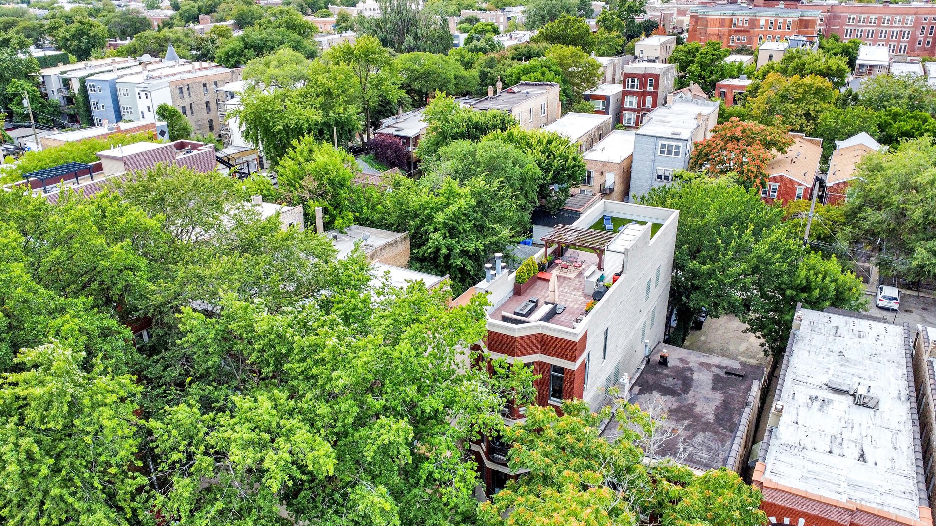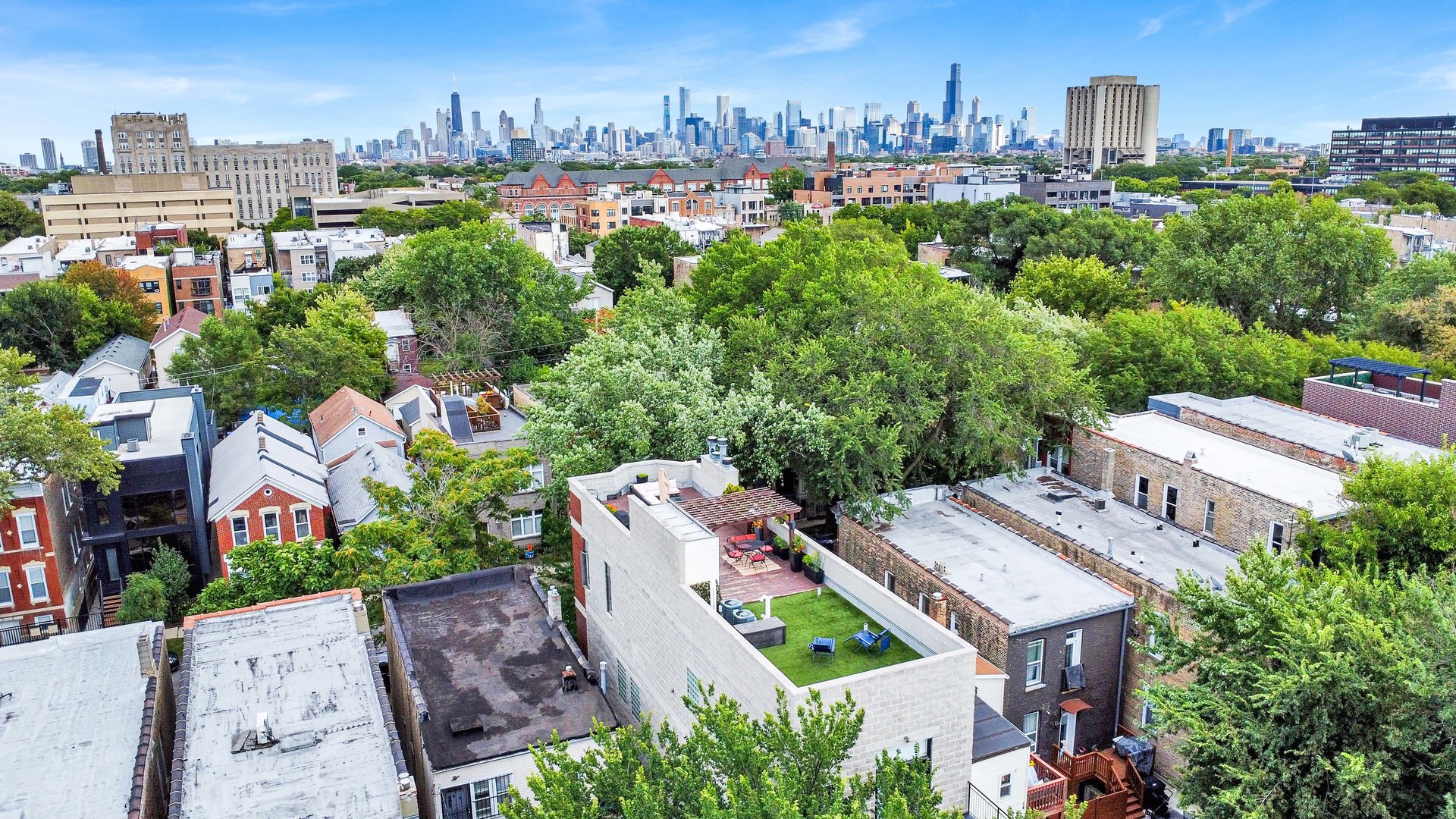 Step inside this sun-drenched home located on a tree-lined block in Chicago’s vibrant West Town! This exceptional residence is a rare blend of architectural volume and relaxed elegance. Soaring ceilings, surrounded by oversized windows on all four walls, set the stage for a space that feels like you’re living inside a luxurious treehouse. Designed with entertaining in mind, the expansive living area is anchored by a striking brick fireplace and built-in shelving and features built-in surround sound throughout (including rooftop). The open-concept layout flows seamlessly from living to dining to kitchen, where you’ll find honed granite counters, stainless appliances, and a generous peninsula, perfect for pouring cocktails or perching with your morning coffee. The primary suite is tucked privately in the back and features a walk-in closet, oversized windows, and direct access to a quiet balcony. Its spa bath is equipped with a dual vanity, deep soaking tub, and glass-enclosed shower. A second full bath and bedroom complete the main level, offering ample flexibility for guests, work, or winding down. Take your interior staircase to a private rooftop oasis, complete with a pergola, built-in bar, gas and water hookups, and turf designed with both lounging and four-legged friends in mind. There’s even a dedicated doggy door for easy access. With no neighboring roof decks on either side, you’ll enjoy an unmatched sense of privacy by day and unobstructed skyline views by night. The home is complete with garage parking, a storage room, and a shared backyard.