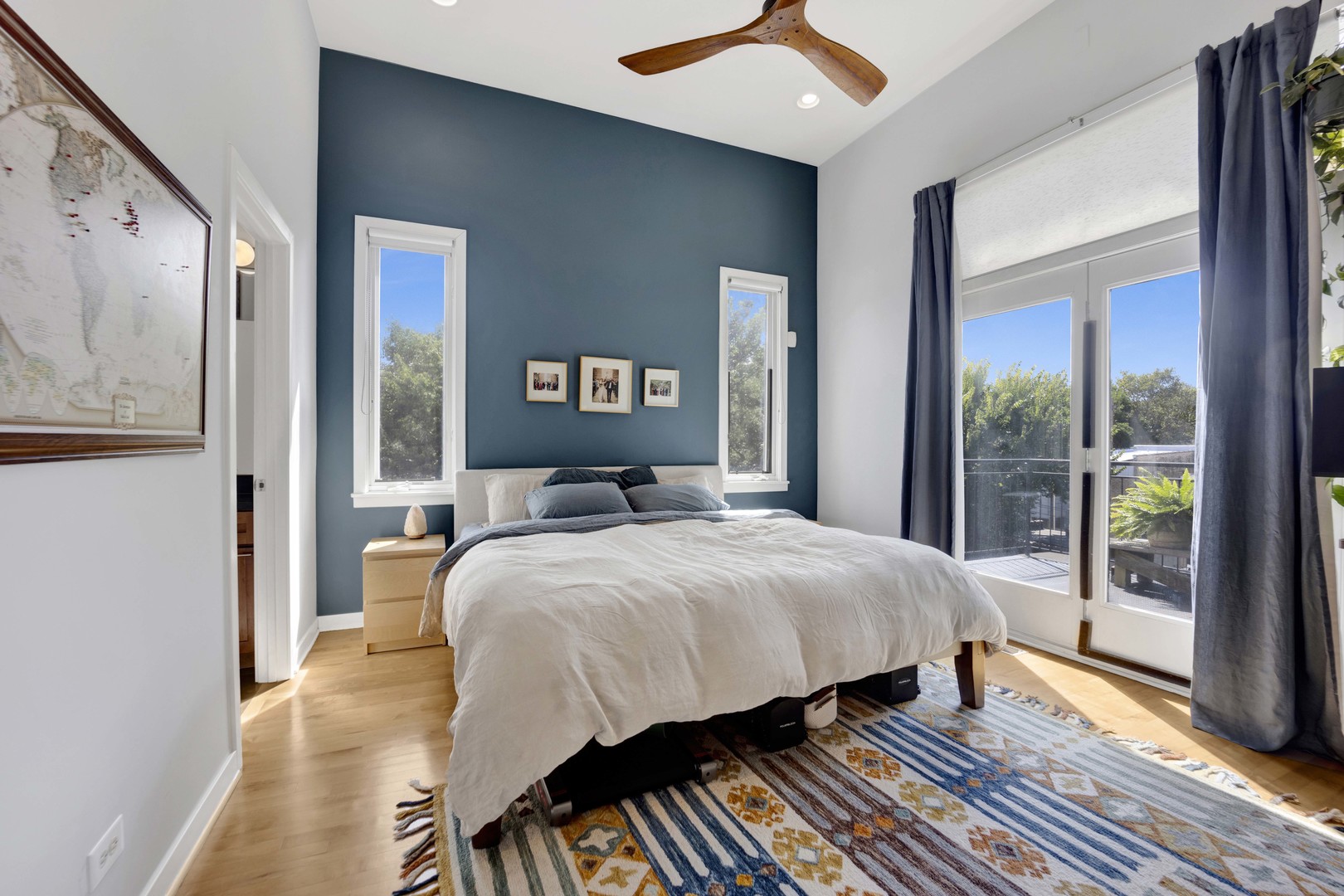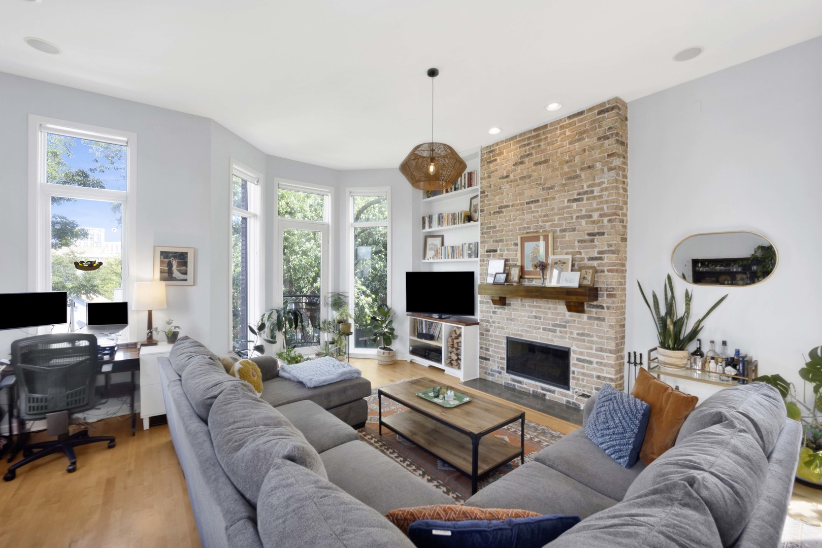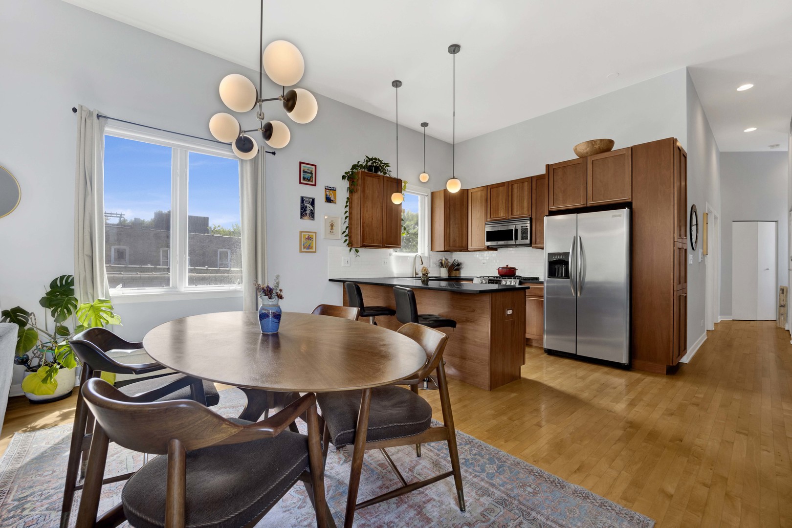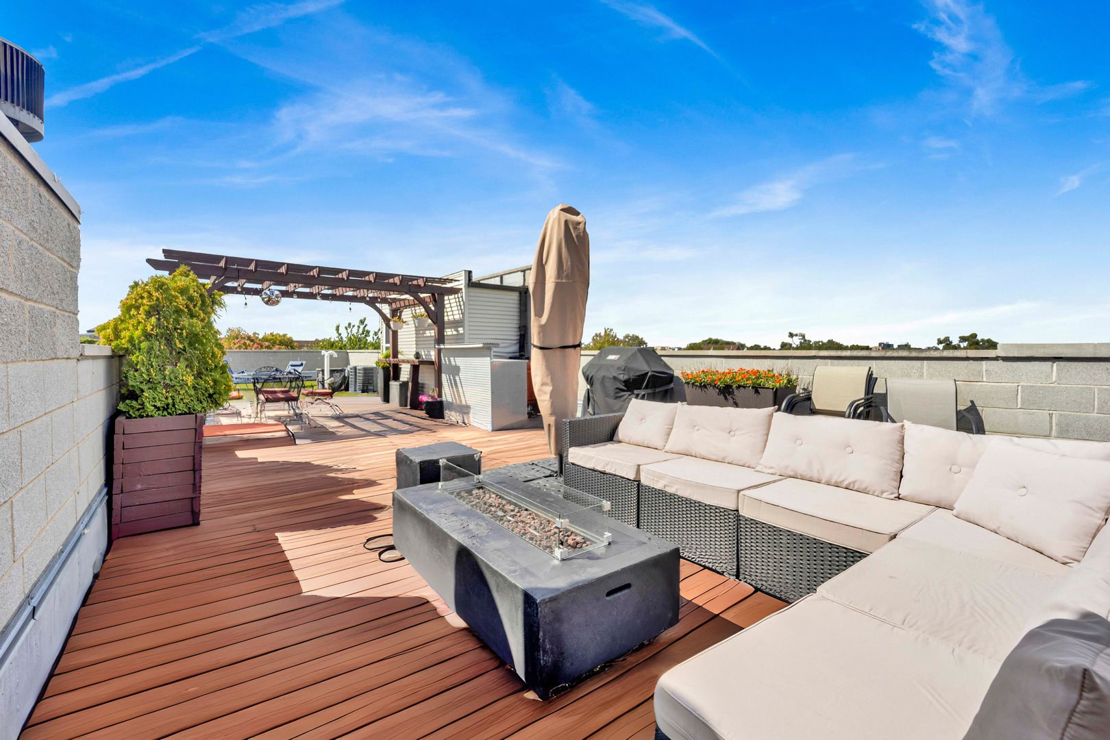 Step inside this sun-drenched home located on a tree-lined block in Chicago’s vibrant West Town! This exceptional residence is a rare blend of architectural volume and relaxed elegance. Soaring ceilings, surrounded by oversized windows on all four walls, set the stage for a space that feels like you’re living inside a luxurious treehouse. Designed with entertaining in mind, the expansive living area is anchored by a striking brick fireplace and built-in shelving and features built-in surround sound throughout (including rooftop). The open-concept layout flows seamlessly from living to dining to kitchen, where you’ll find honed granite counters, stainless appliances, and a generous peninsula, perfect for pouring cocktails or perching with your morning coffee. The primary suite is tucked privately in the back and features a walk-in closet, oversized windows, and direct access to a quiet balcony. Its spa bath is equipped with a dual vanity, deep soaking tub, and glass-enclosed shower. A second full bath and bedroom complete the main level, offering ample flexibility for guests, work, or winding down. Take your interior staircase to a private rooftop oasis, complete with a pergola, built-in bar, gas and water hookups, and turf designed with both lounging and four-legged friends in mind. There’s even a dedicated doggy door for easy access. With no neighboring roof decks on either side, you’ll enjoy an unmatched sense of privacy by day and unobstructed skyline views by night. The home is complete with garage parking, a storage room, and a shared backyard.
