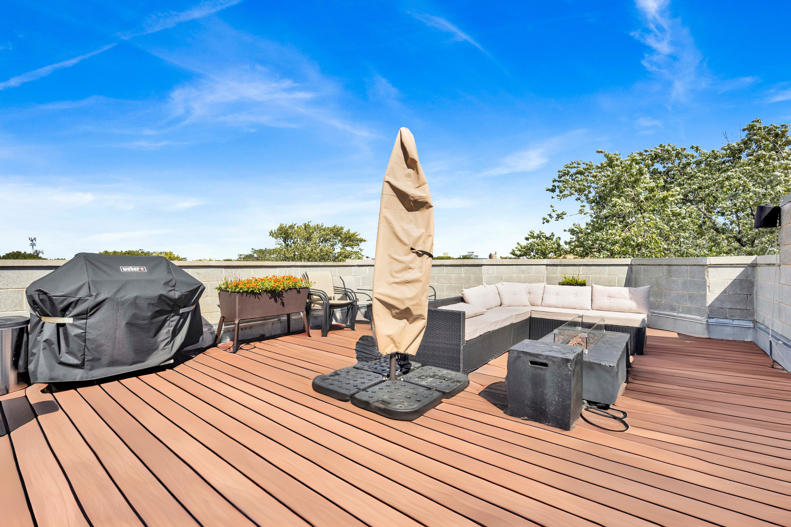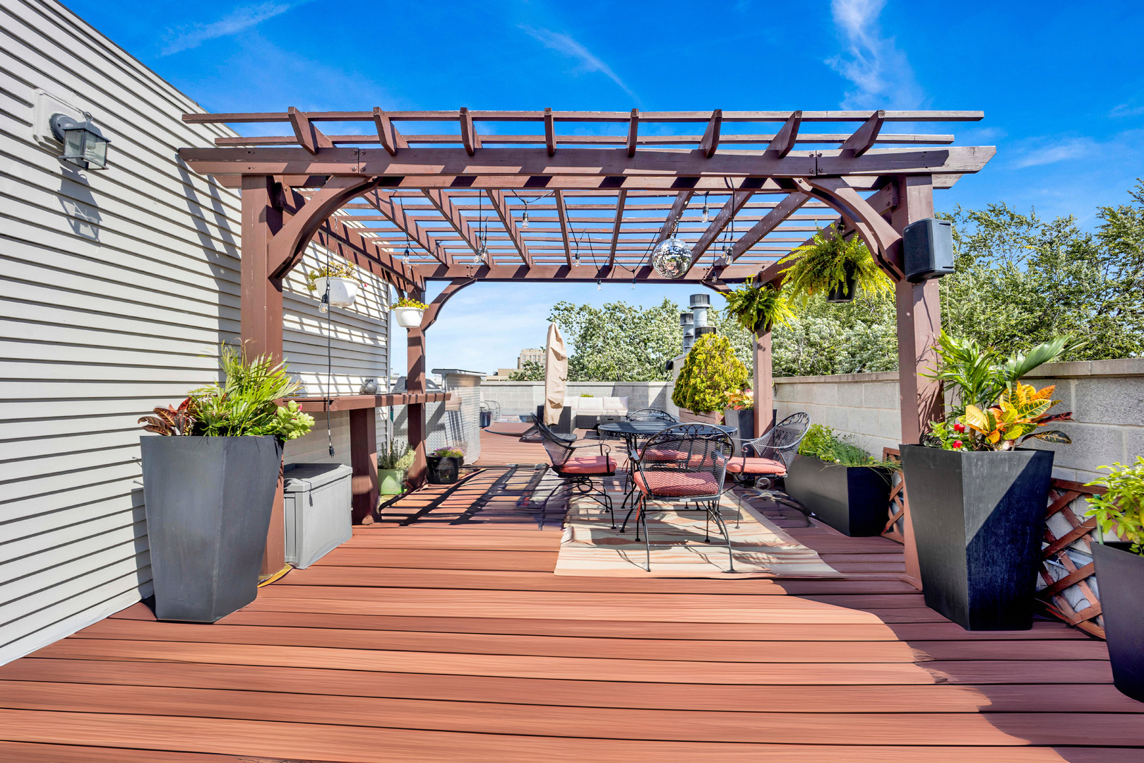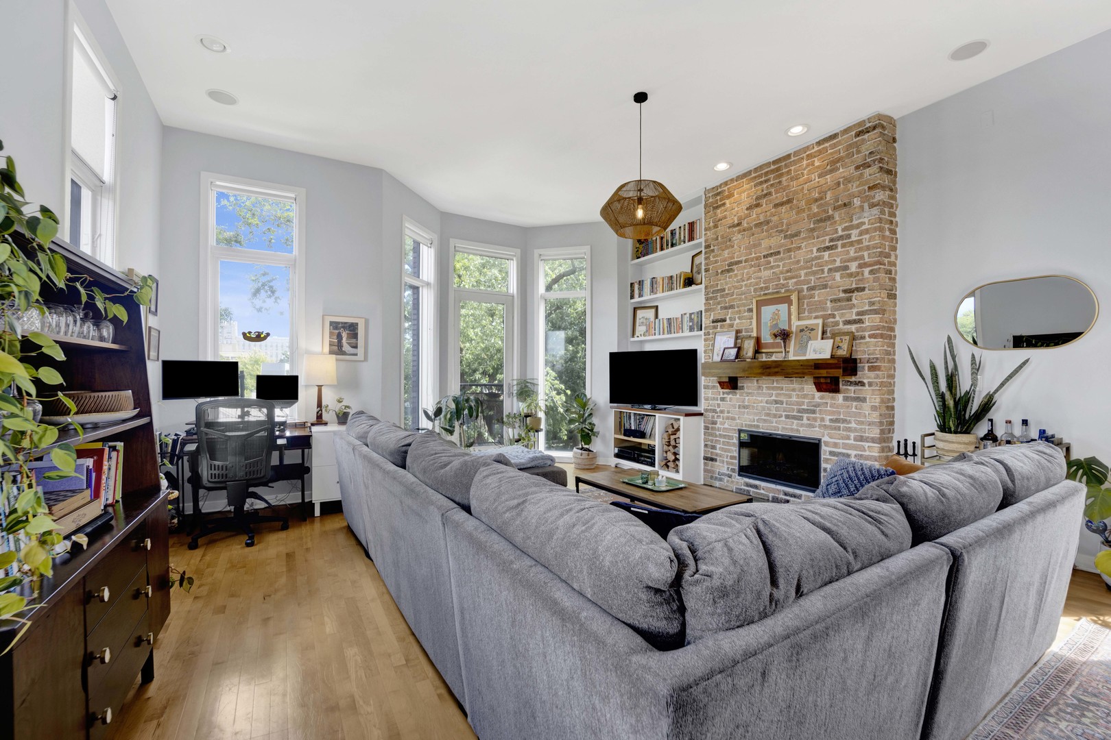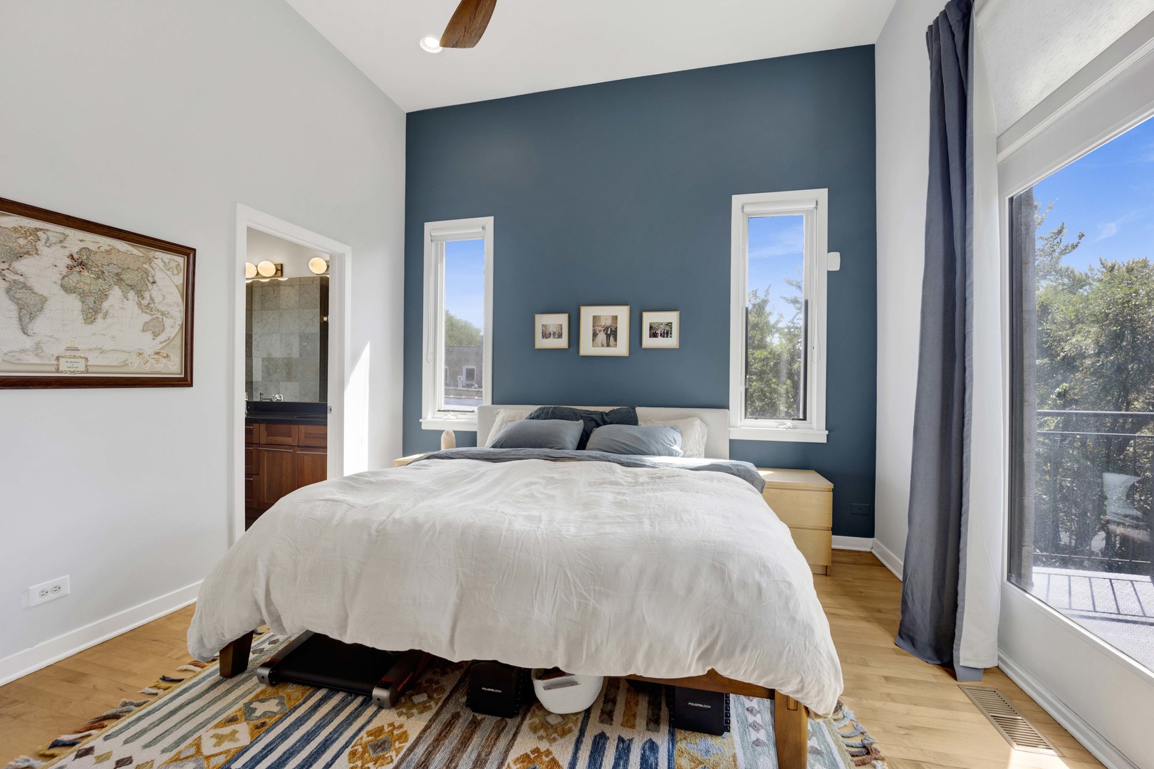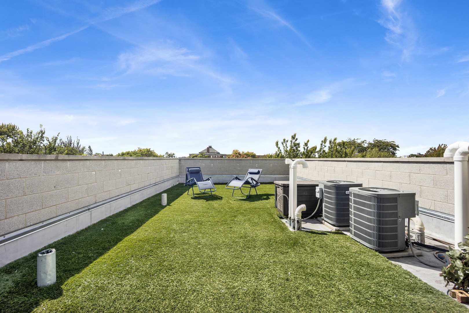 Step inside this sun-drenched home located on a tree-lined block in Chicago’s vibrant West Town! This exceptional residence is a rare blend of architectural volume and relaxed elegance. Soaring ceilings, surrounded by oversized windows on all four walls, set the stage for a space that feels like you’re living inside a luxurious treehouse. Designed with entertaining in mind, the expansive living area is anchored by a striking brick fireplace and built-in shelving and features built-in surround sound throughout (including rooftop). The open-concept layout flows seamlessly from living to dining to kitchen, where you’ll find honed granite counters, stainless appliances, and a generous peninsula, perfect for pouring cocktails or perching with your morning coffee. The primary suite is tucked privately in the back and features a walk-in closet, oversized windows, and direct access to a quiet balcony. Its spa bath is equipped with a dual vanity, deep soaking tub, and glass-enclosed shower. A second full bath and bedroom complete the main level, offering ample flexibility for guests, work, or winding down. Take your interior staircase to a private rooftop oasis, complete with a pergola, built-in bar, gas and water hookups, and turf designed with both lounging and four-legged friends in mind. There’s even a dedicated doggy door for easy access. With no neighboring roof decks on either side, you’ll enjoy an unmatched sense of privacy by day and unobstructed skyline views by night. The home is complete with garage parking, a storage room, and a shared backyard.
