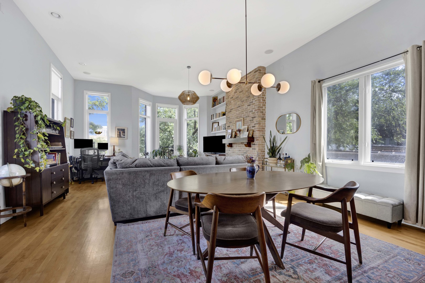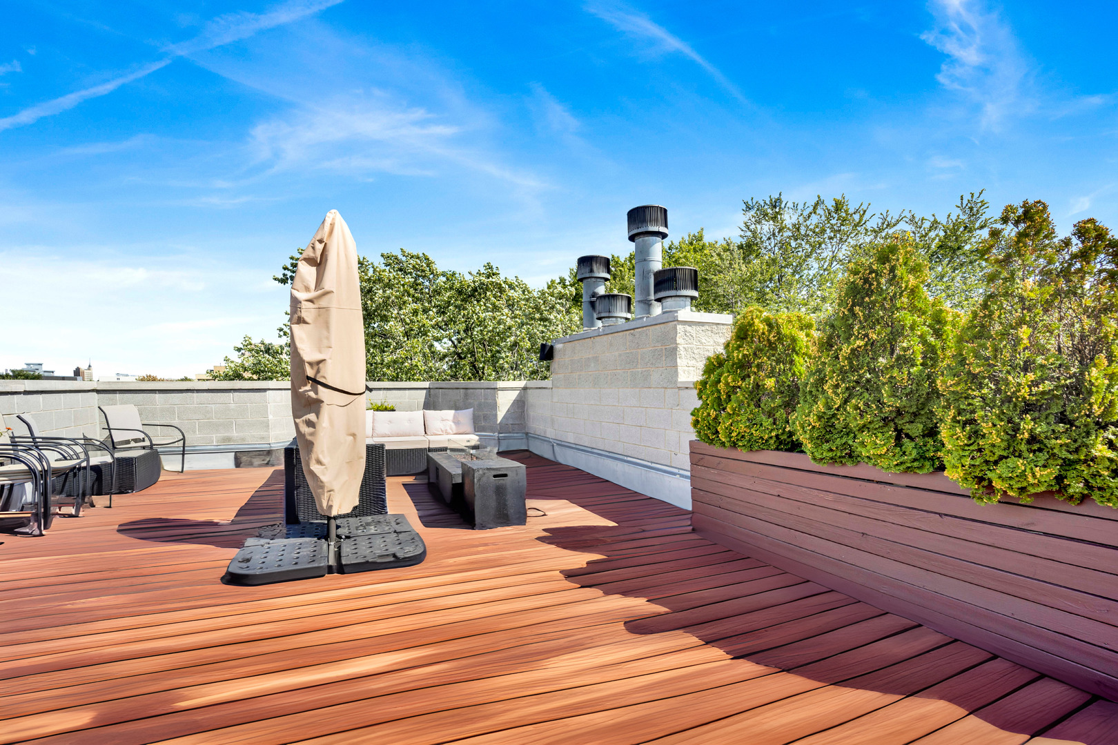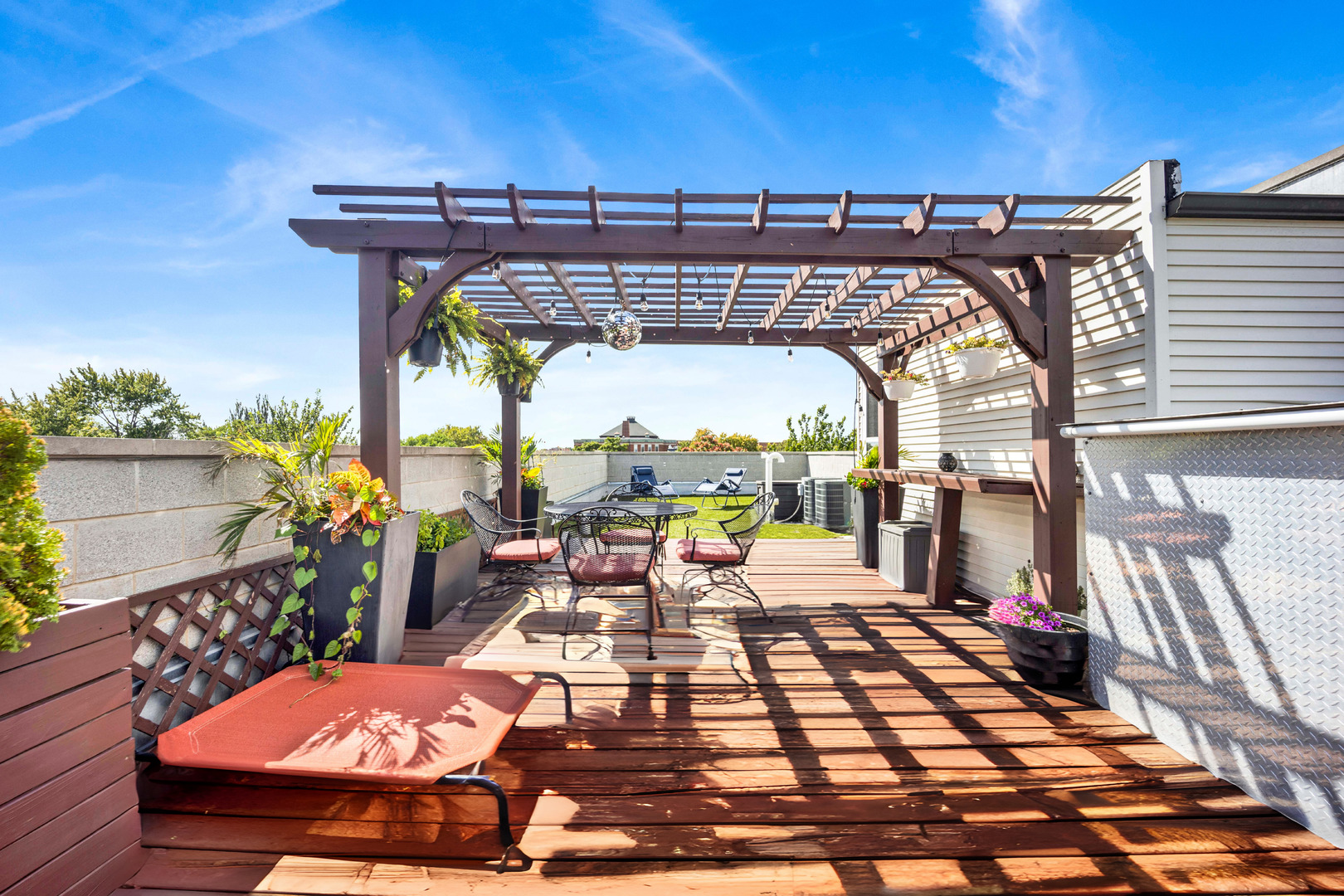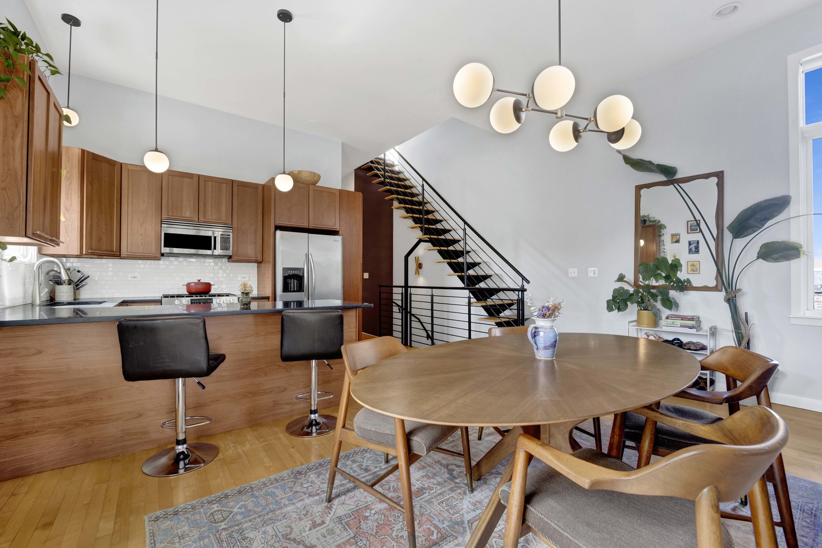 Step inside this sun-drenched home located on a tree-lined block in Chicago’s vibrant West Town! This exceptional residence is a rare blend of architectural volume and relaxed elegance. Soaring ceilings, surrounded by oversized windows on all four walls, set the stage for a space that feels like you’re living inside a luxurious treehouse. Designed with entertaining in mind, the expansive living area is anchored by a striking brick fireplace and built-in shelving and features built-in surround sound throughout (including rooftop). The open-concept layout flows seamlessly from living to dining to kitchen, where you’ll find honed granite counters, stainless appliances, and a generous peninsula, perfect for pouring cocktails or perching with your morning coffee. The primary suite is tucked privately in the back and features a walk-in closet, oversized windows, and direct access to a quiet balcony. Its spa bath is equipped with a dual vanity, deep soaking tub, and glass-enclosed shower. A second full bath and bedroom complete the main level, offering ample flexibility for guests, work, or winding down. Take your interior staircase to a private rooftop oasis, complete with a pergola, built-in bar, gas and water hookups, and turf designed with both lounging and four-legged friends in mind. There’s even a dedicated doggy door for easy access. With no neighboring roof decks on either side, you’ll enjoy an unmatched sense of privacy by day and unobstructed skyline views by night. The home is complete with garage parking, a storage room, and a shared backyard.