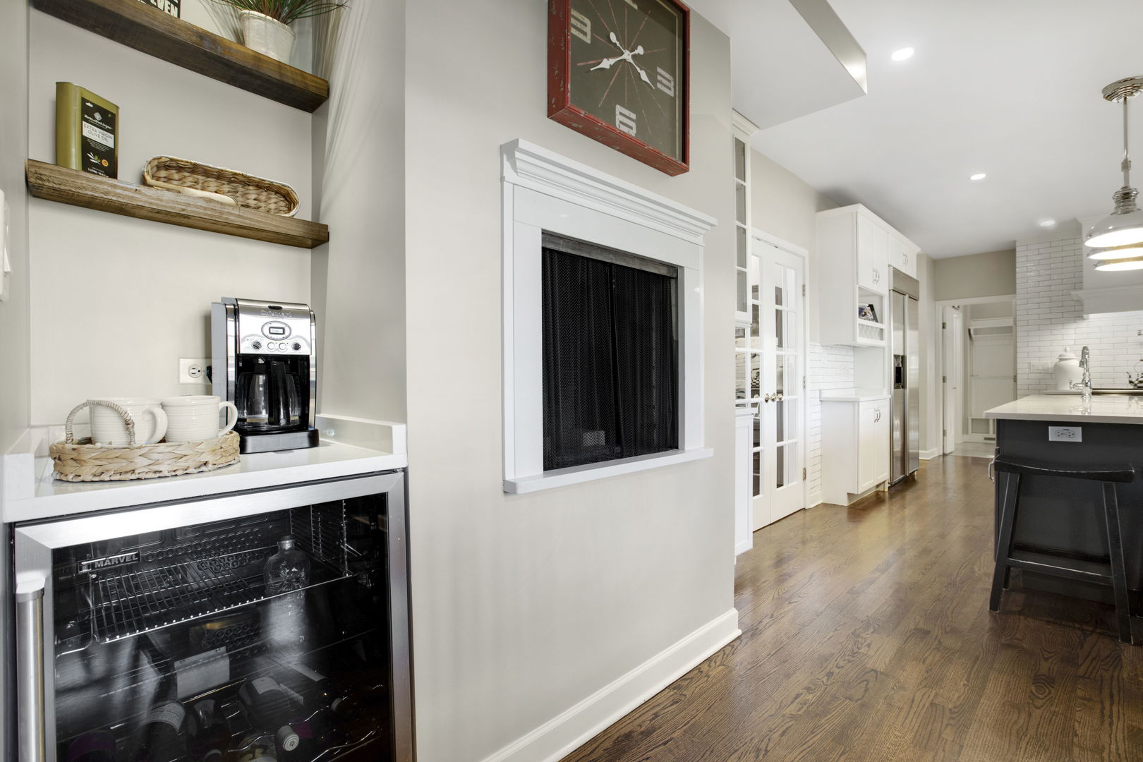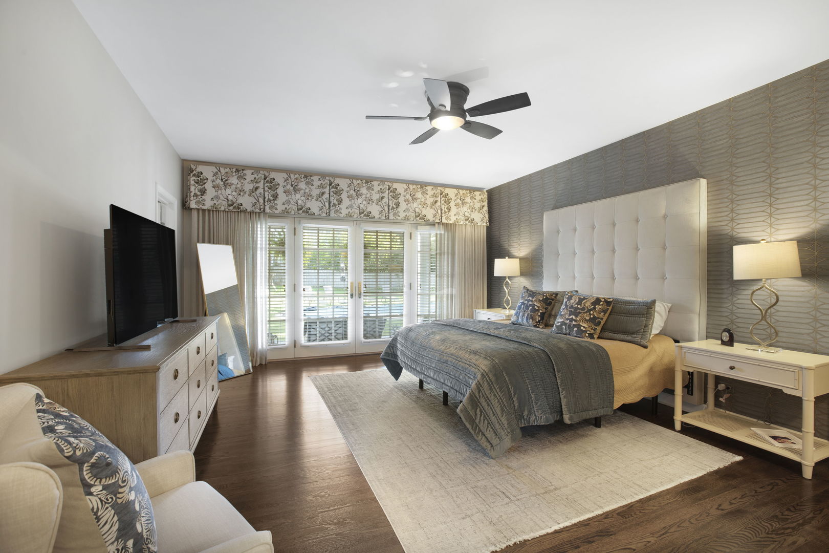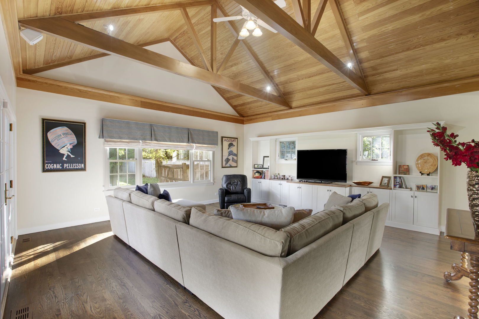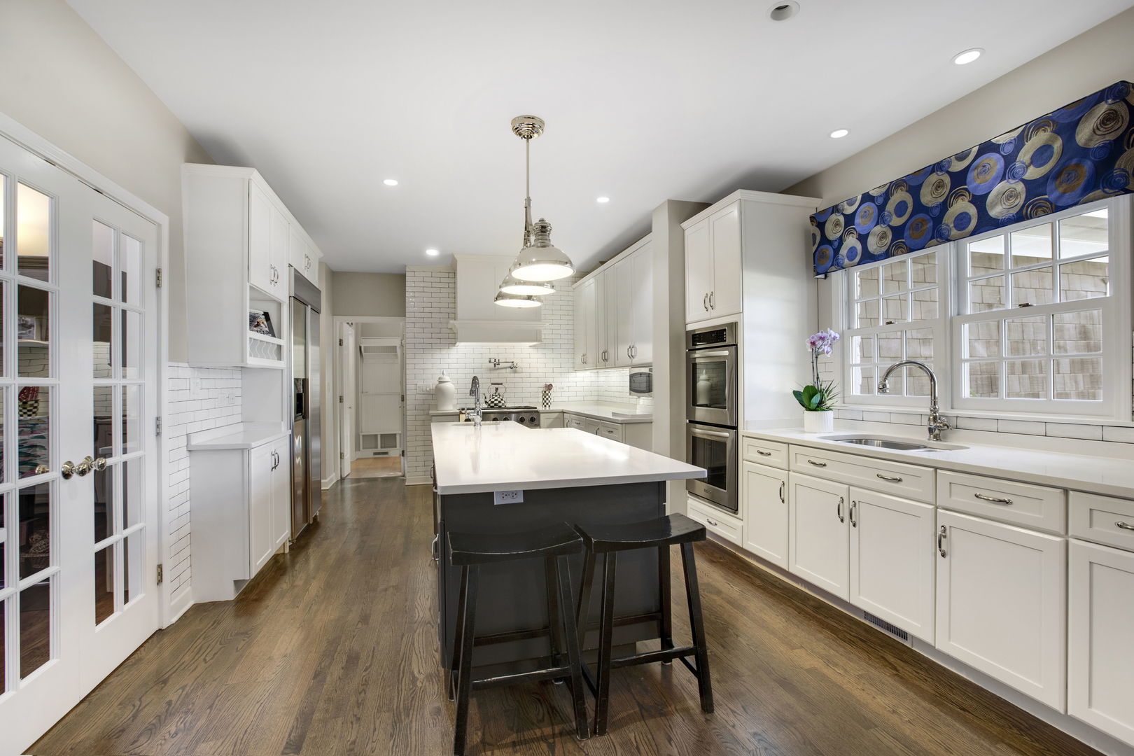 Welcome to this sprawling, beautifully updated Nantucket-style home, perfectly positioned on a prestigious .4 of an acre lot in East Glenview’s coveted Pleasant Lane – surrounded by multi-million-dollar properties. With mature landscaping, a fully fenced yard, and a stunning in-ground pool, this home offers the perfect blend of timeless charm and modern amenities. Step inside from the charming covered front porch with vaulted beadboard ceiling into a dramatic two-story foyer. Rich dark hardwood floors flow throughout the main level, setting the stage for refined living. At the front of the home, an updated eat-in kitchen features white cabinetry, a sleek black island, quartz countertops, subway tile backsplash, and high-end stainless-steel appliances including a double oven and wine fridge. The breakfast area is perfect for casual meals. The kitchen opens into a breathtaking two-story living room with a cozy gas fireplace, designer light fixture, and large windows offering serene views of the backyard oasis. French doors lead to a formal dining room with elegant lighting – ideal for hosting holiday dinners or special occasions. A spacious family room at the back of the home stuns with vaulted oak ceilings, a custom built-in entertainment center, and walls of windows that flood the space with natural light and lush views. The first-floor primary suite is a true retreat with direct access to a covered patio, custom wallpaper accent wall, and dual walk-in closets with built-ins. The spa-like en-suite bathroom was recently renovated and features a large walk-in shower, separate whirlpool tub, double sink vanity with quartz countertop, and abundant built-in storage. Additional main floor features include a stylish powder room with elegant wallpaper, a well-appointed laundry room, and a custom mudroom with built-in lockers – perfectly designed for today’s busy lifestyle. Upstairs, a loft-style sitting room with a whitewashed brick gas fireplace offers cozy flex space for reading or relaxing. Four additional rooms provide maximum versatility – including a second en-suite bedroom, two more spacious bedrooms, and a flex room ideal for a home office, playroom, or fifth bedroom. The large hall bathroom features a unique dual-vanity layout with a central wet room – complete with tub and dual showerheads. The finished basement expands your living space even further with a large recreation room and bonus flex area perfect for a gym, office, or guest accommodations. Step outside and entertain in style with both covered and open-air patios, all overlooking the show-stopping newer fiber glass pool with cement surround and meticulously landscaped yard.