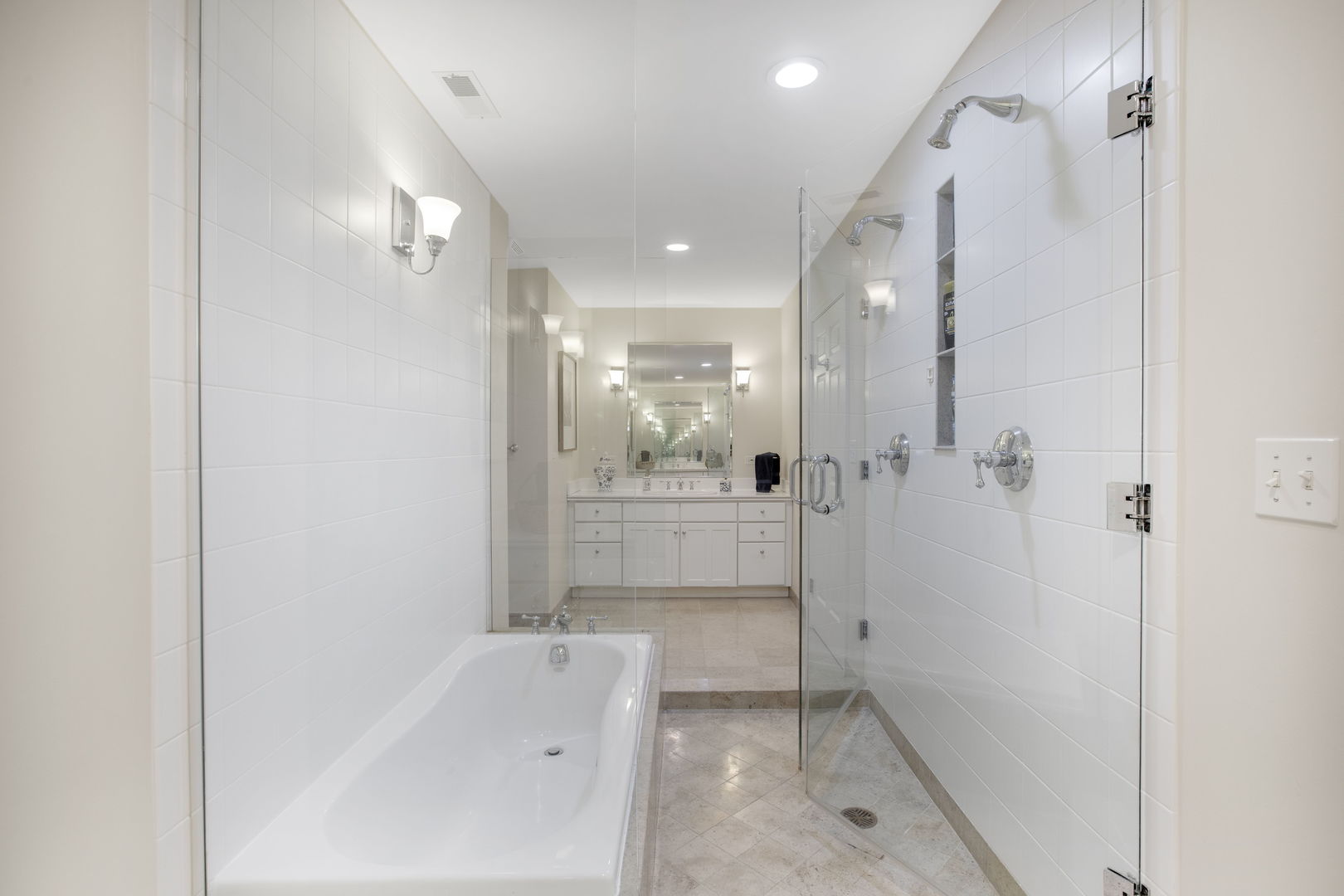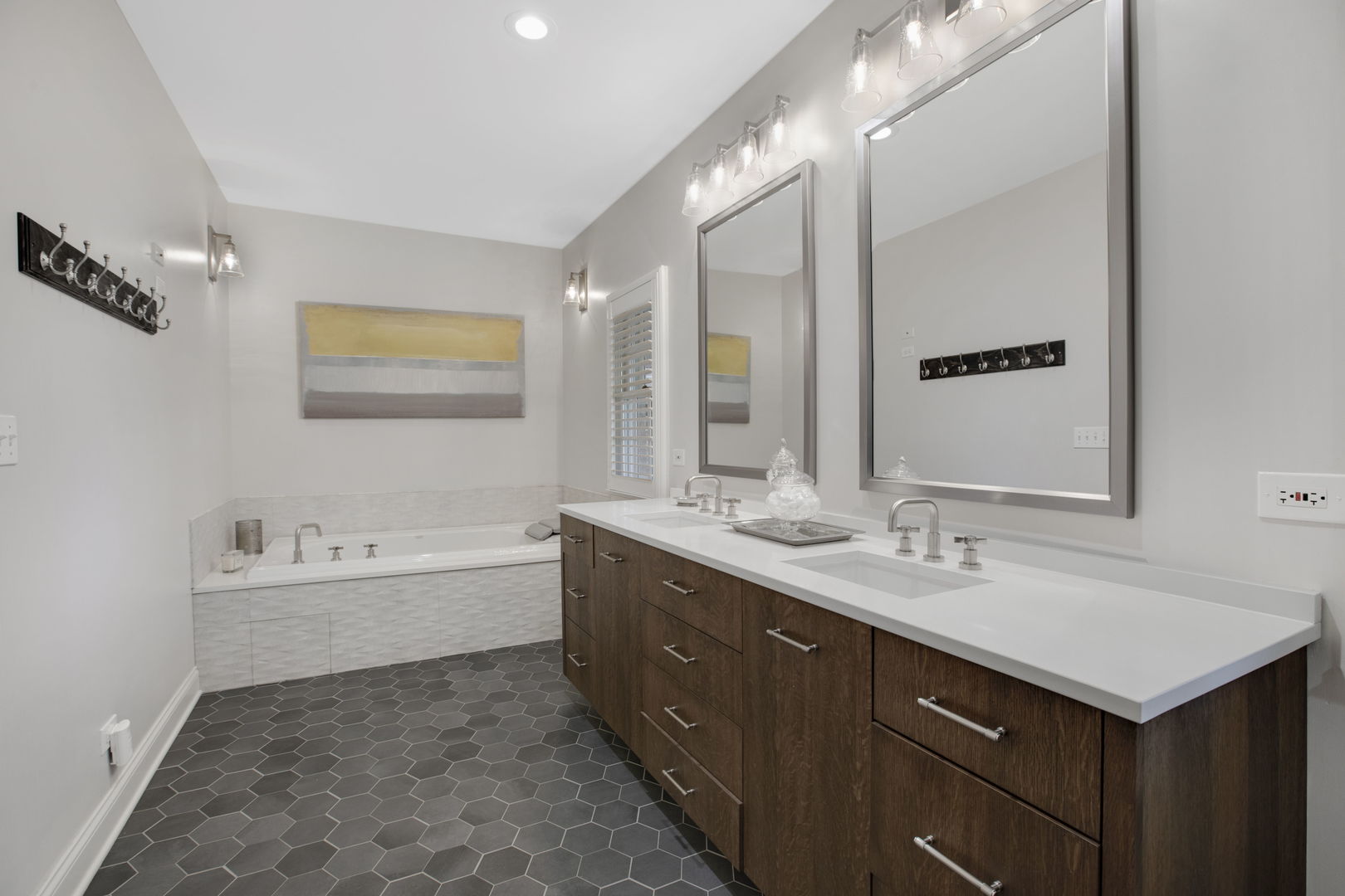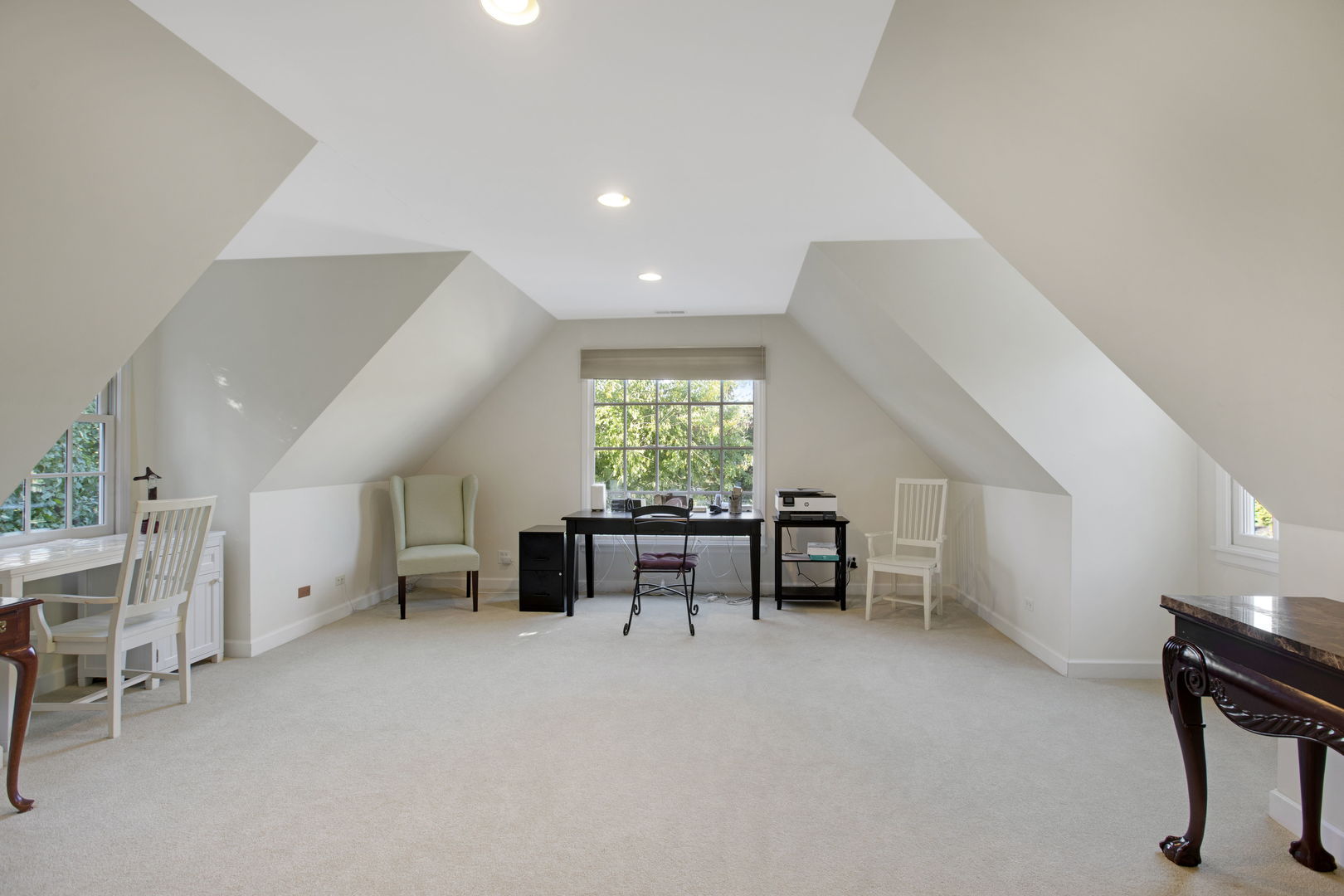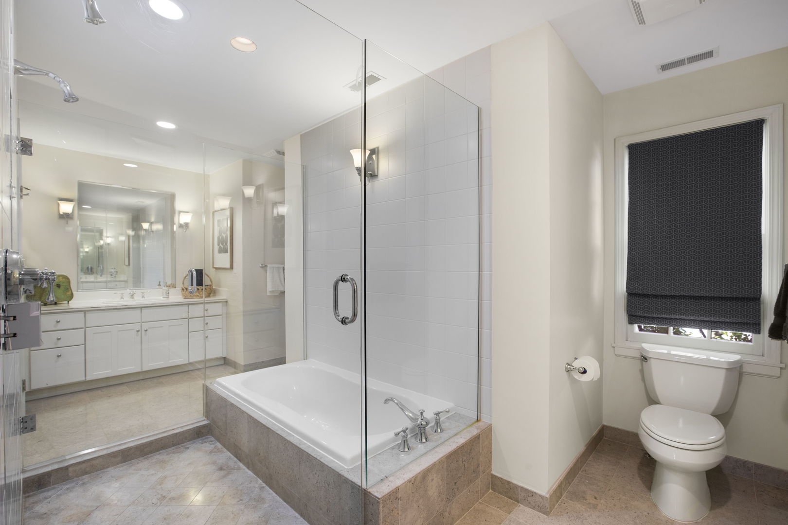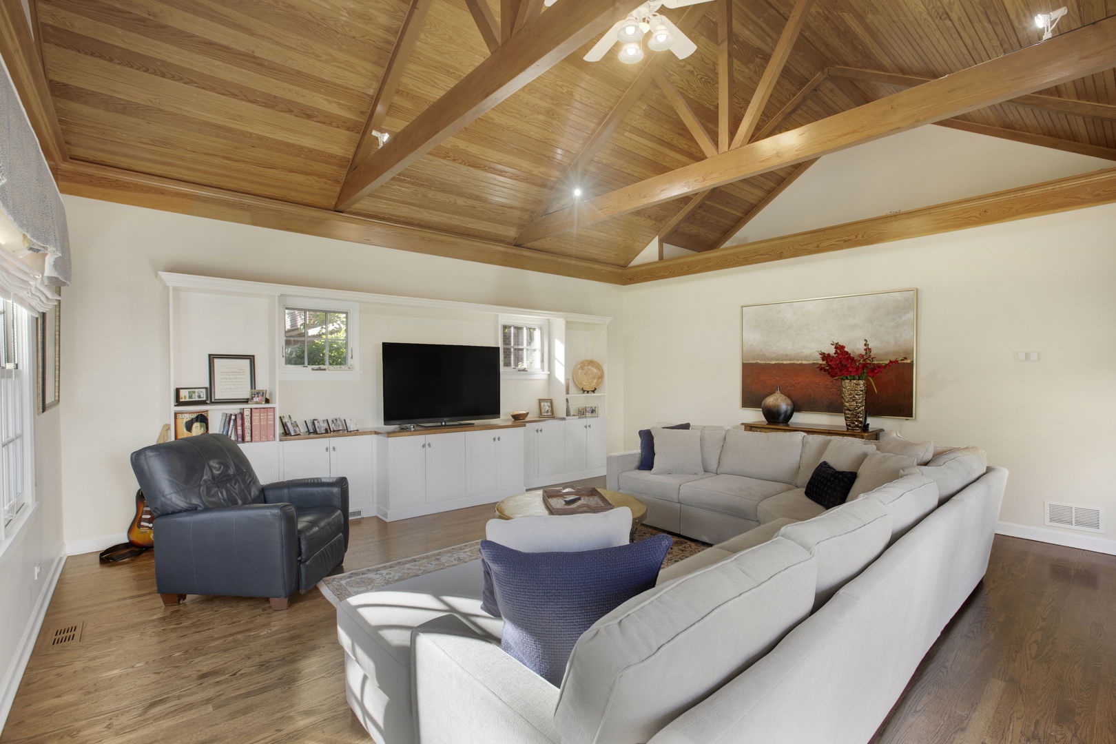 Welcome to this sprawling, beautifully updated Nantucket-style home, perfectly positioned on a prestigious .4 of an acre lot in East Glenview’s coveted Pleasant Lane – surrounded by multi-million-dollar properties. With mature landscaping, a fully fenced yard, and a stunning in-ground pool, this home offers the perfect blend of timeless charm and modern amenities. Step inside from the charming covered front porch with vaulted beadboard ceiling into a dramatic two-story foyer. Rich dark hardwood floors flow throughout the main level, setting the stage for refined living. At the front of the home, an updated eat-in kitchen features white cabinetry, a sleek black island, quartz countertops, subway tile backsplash, and high-end stainless-steel appliances including a double oven and wine fridge. The breakfast area is perfect for casual meals. The kitchen opens into a breathtaking two-story living room with a cozy gas fireplace, designer light fixture, and large windows offering serene views of the backyard oasis. French doors lead to a formal dining room with elegant lighting – ideal for hosting holiday dinners or special occasions. A spacious family room at the back of the home stuns with vaulted oak ceilings, a custom built-in entertainment center, and walls of windows that flood the space with natural light and lush views. The first-floor primary suite is a true retreat with direct access to a covered patio, custom wallpaper accent wall, and dual walk-in closets with built-ins. The spa-like en-suite bathroom was recently renovated and features a large walk-in shower, separate whirlpool tub, double sink vanity with quartz countertop, and abundant built-in storage. Additional main floor features include a stylish powder room with elegant wallpaper, a well-appointed laundry room, and a custom mudroom with built-in lockers – perfectly designed for today’s busy lifestyle. Upstairs, a loft-style sitting room with a whitewashed brick gas fireplace offers cozy flex space for reading or relaxing. Four additional rooms provide maximum versatility – including a second en-suite bedroom, two more spacious bedrooms, and a flex room ideal for a home office, playroom, or fifth bedroom. The large hall bathroom features a unique dual-vanity layout with a central wet room – complete with tub and dual showerheads. The finished basement expands your living space even further with a large recreation room and bonus flex area perfect for a gym, office, or guest accommodations. Step outside and entertain in style with both covered and open-air patios, all overlooking the show-stopping newer fiber glass pool with cement surround and meticulously landscaped yard.