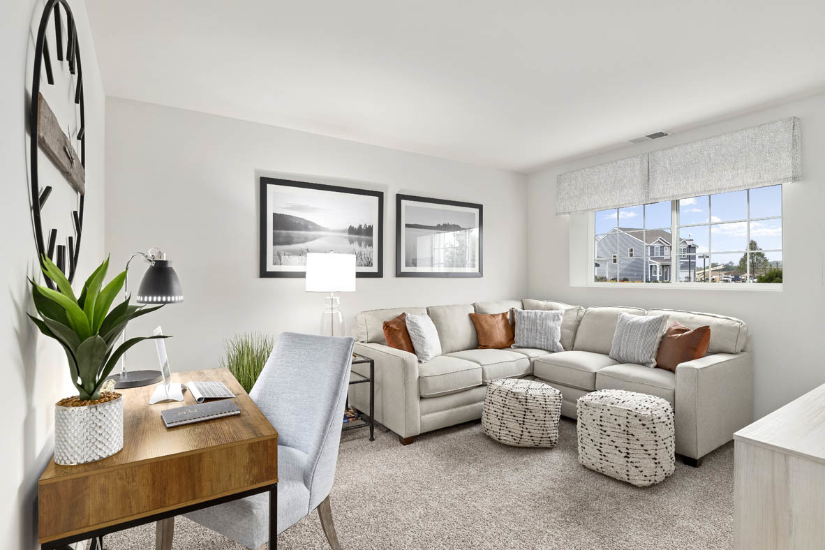 Picture yourself at 1441 Oakfield Lane in Pingree Grove, Illinois, a modern, new townhome in our scenic Cambridge Lakes North community. This end unit townhome will be ready late winter! Homesite includes a fully sodded yard that is maintained throughout the year as well as snow removal in the winter. This Garfield townhome is a captivating open floor plan with over 1,700 square feet of living space which includes 3 bedrooms, 2.5 baths and a finished flex space. As soon as you step inside from the garage, you’ll be greeted by a finished flex space, perfect for an office or playroom. Walking up the stairs, you will find this home’s open concept main level living space centered around a large kitchen island. The expansive kitchen overlooks both the front dining and back great room areas, making it the ideal space to entertain. Additionally, your kitchen features designer cabinetry, quartz countertops, stainless-steel appliances, and pantry. Arriving at the top floor, you’ll find our 3 bedrooms. Enjoy a spacious primary bedroom suite which includes a large walk-in closet lit up by its own private bathroom with dual sinks and a walk-in shower. The rest of the upper level features a laundry room, secondary bedrooms with a full second bath and linen closet. You’ll find luxury vinyl plank flooring throughout the main level kitchen and dining, bathrooms, and laundry. Impressive innovative ERV furnace system, Rheia ductwork delivery system and tankless water heater round out the amazing features this home has to offer! All Chicago homes include our America’s Smart Home Technology. Photos are of similar home. Actual home built may vary