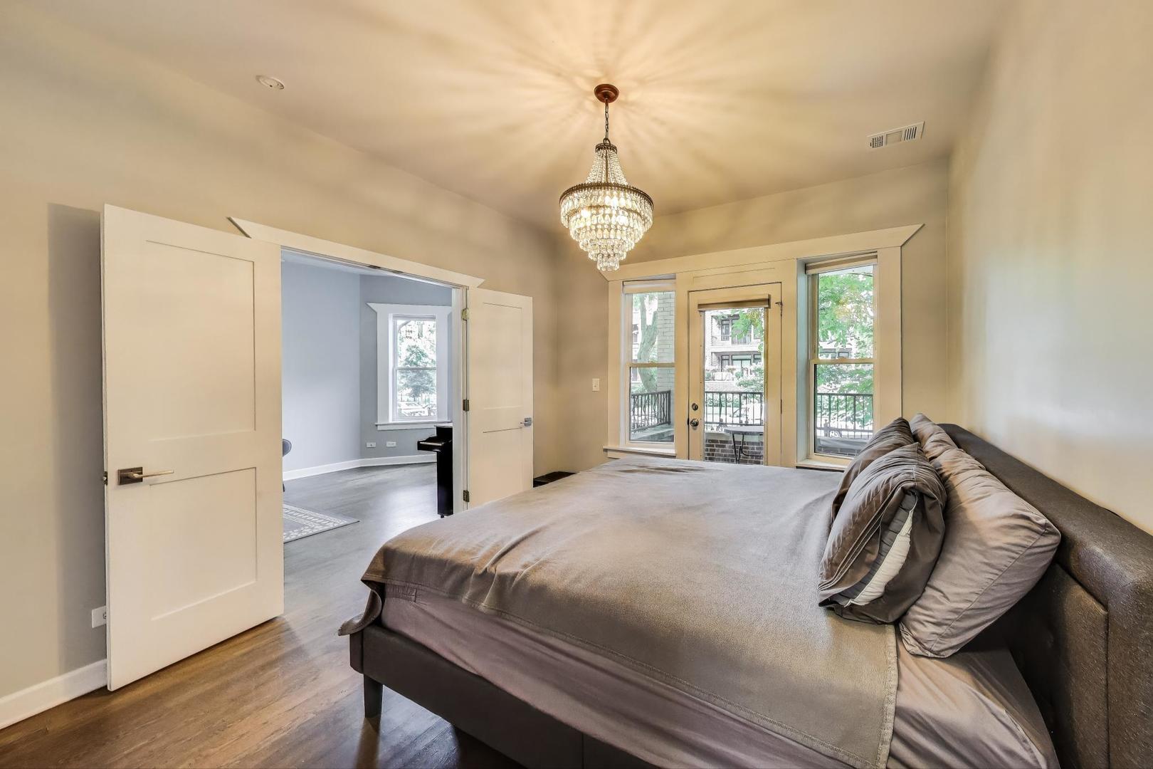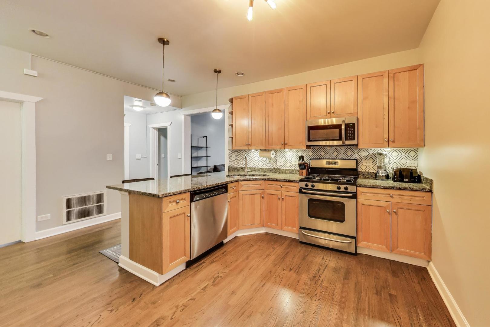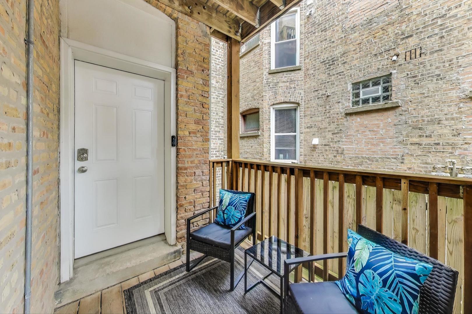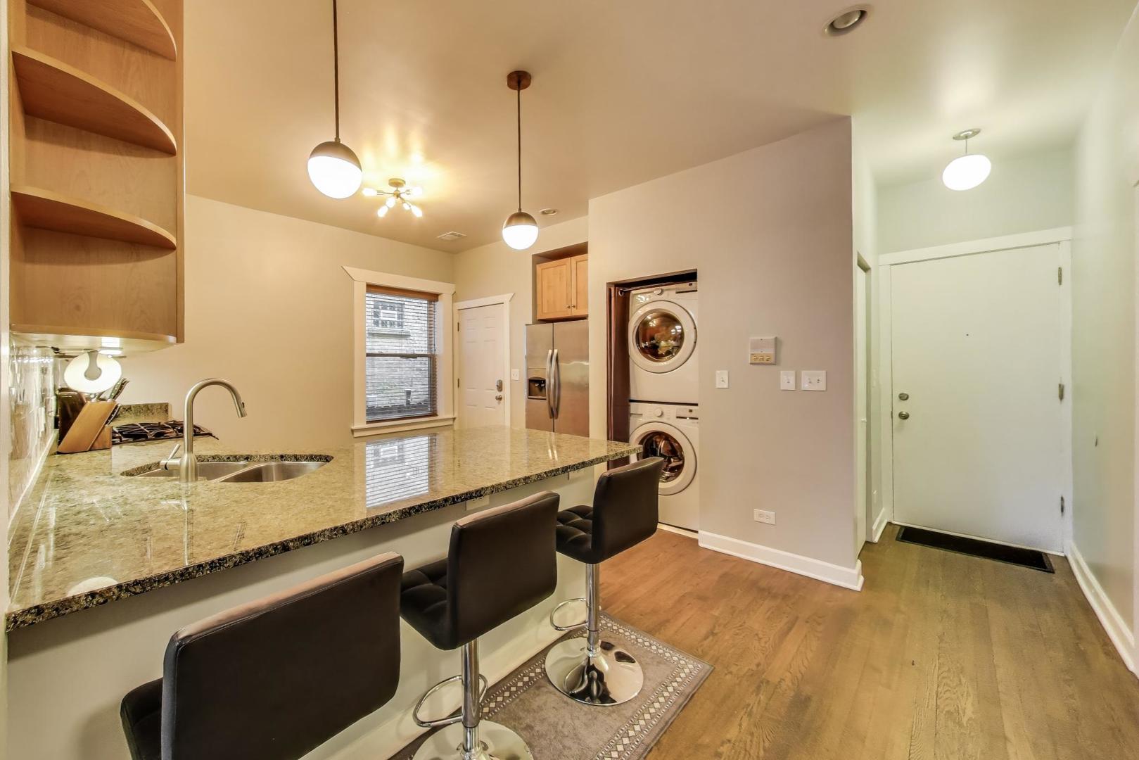 Sun drenched end residence at the irresistibly charming Carmen Court. At the end of the block find yourself at Clark Street with shopping, dining and more urban hustle and bustle. All flooding with southern light, this exquisite vintage gem features a hexagon edged front living room overlooking Carmen Avenue and is one of only 6 residences featuring an attached street front covered stone balcony ( accessed through glass doors off the master suite). A split floor plan with 3 bedrooms and 2 full baths with natural stone tile. A very generous kitchen and breakfast bar with maple cabinets, stainless steel appliances, granite counters, stylish backsplash and designer pendants lights. Vaulted ceilings, hardwood floors and closets in every room. NEWER front load washer and dryer refrigerator, microwave, H20 Heater. HVAC NEW IN 2021. Rear deck space for additional relaxation. 2 VERY LARGE ( 32sq/ft each) assigned storage rooms located on the lower level.