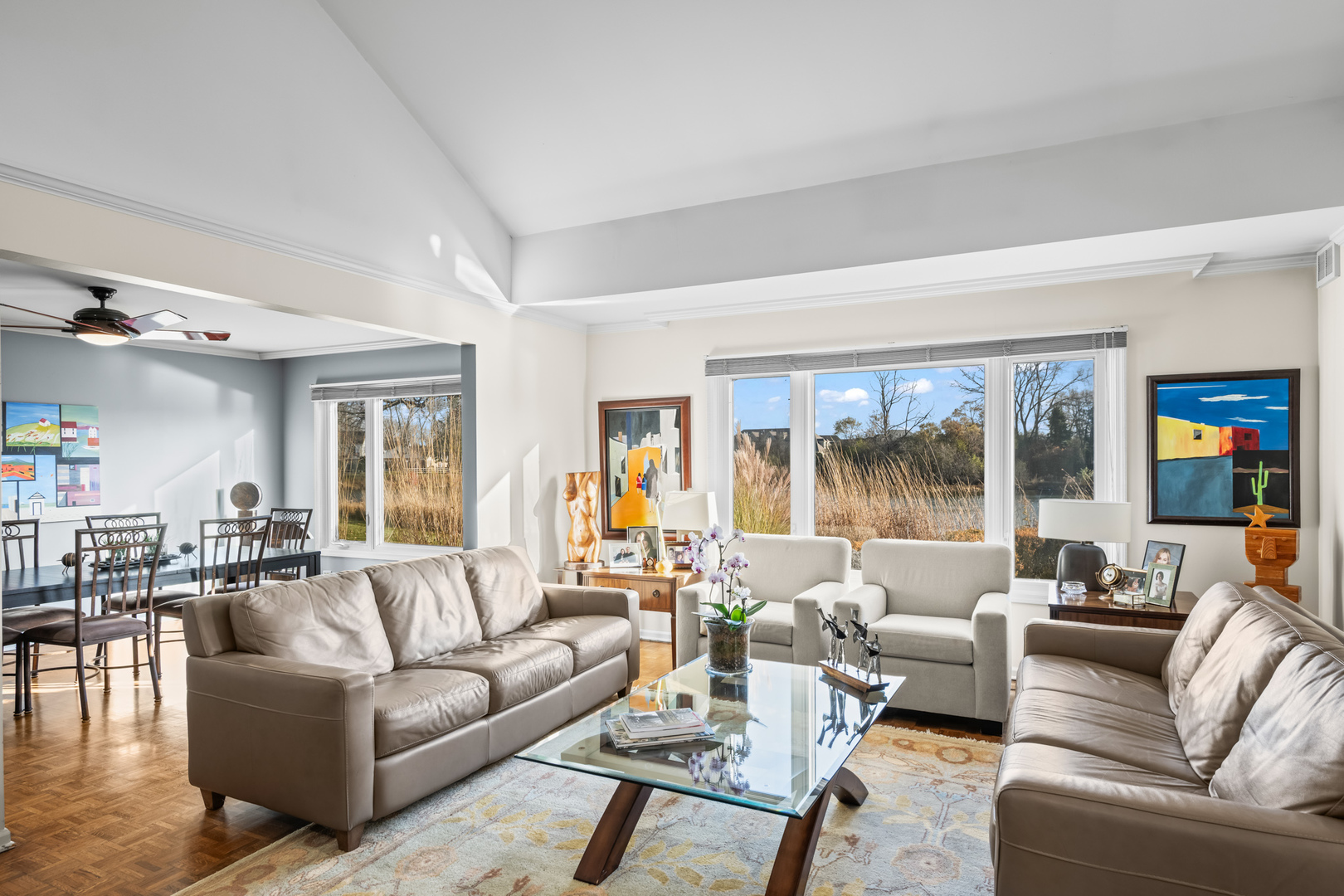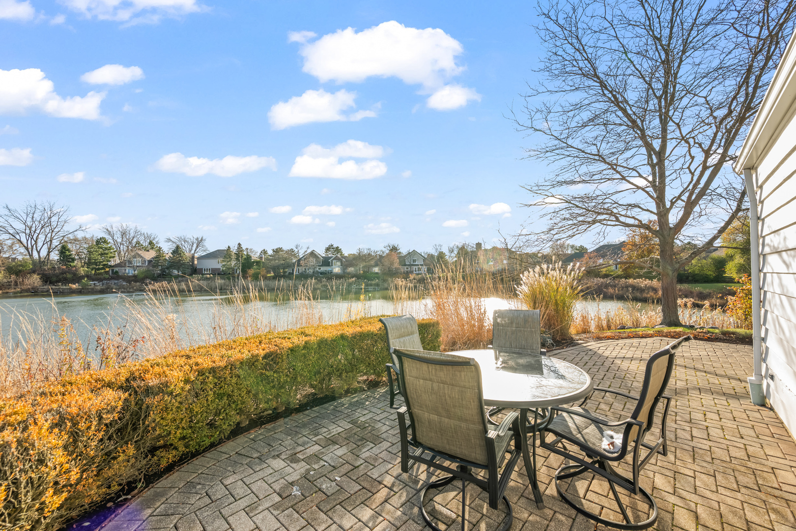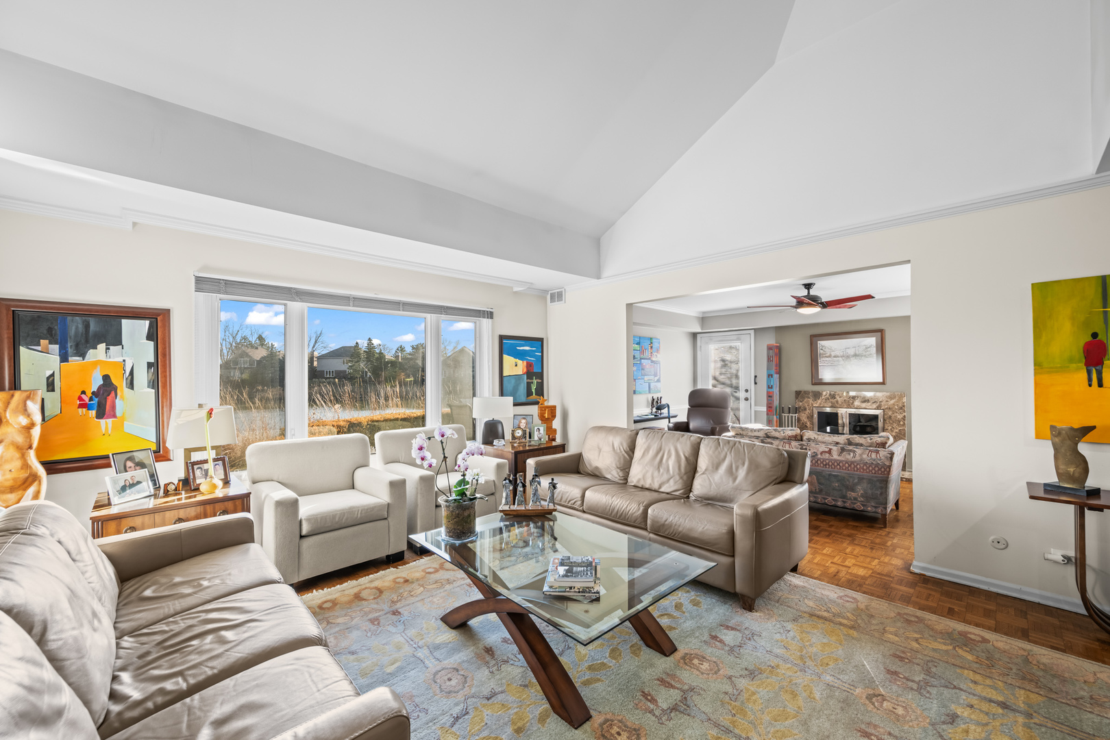 Location, location. It’s a water front beauty! Discover maintenance free living in this absolutely stunning ranch style home with picturesque water views that sets the tone for serene resort-style living every day, perfectly situated in the gated community of Rivershire. This fabulous light and bright home boasts an open concept design, large welcoming entry foyer, hardwood parquet floors, custom moldings and great views from all the windows. The home boasts an updated eat-in kitchen with high end stainless steel appliances, sub zero refrigerator, white custom cabinetry, solid surface counter tops and a large breakfast eating room with sliders to the patio. The laundry room is conveniently located off the kitchen. Large separate dining room with recessed lighting opens to the family room with soaring volume ceilings and fireplace. Relax in the cozy den with wet bar. The primary suite has two large walk-in closets, bath with dual bowl vanities and shower. Spacious second bedroom with updated hall full bath and an additional powder room off the den. Newer roof and furnace, two car attached garage and two paver brick patios. Enjoy a stroll on the serene walking path or have a game of tennis. Conveniently located near shopping, restaurants and entertainment offered at the Marriott Theater near by.