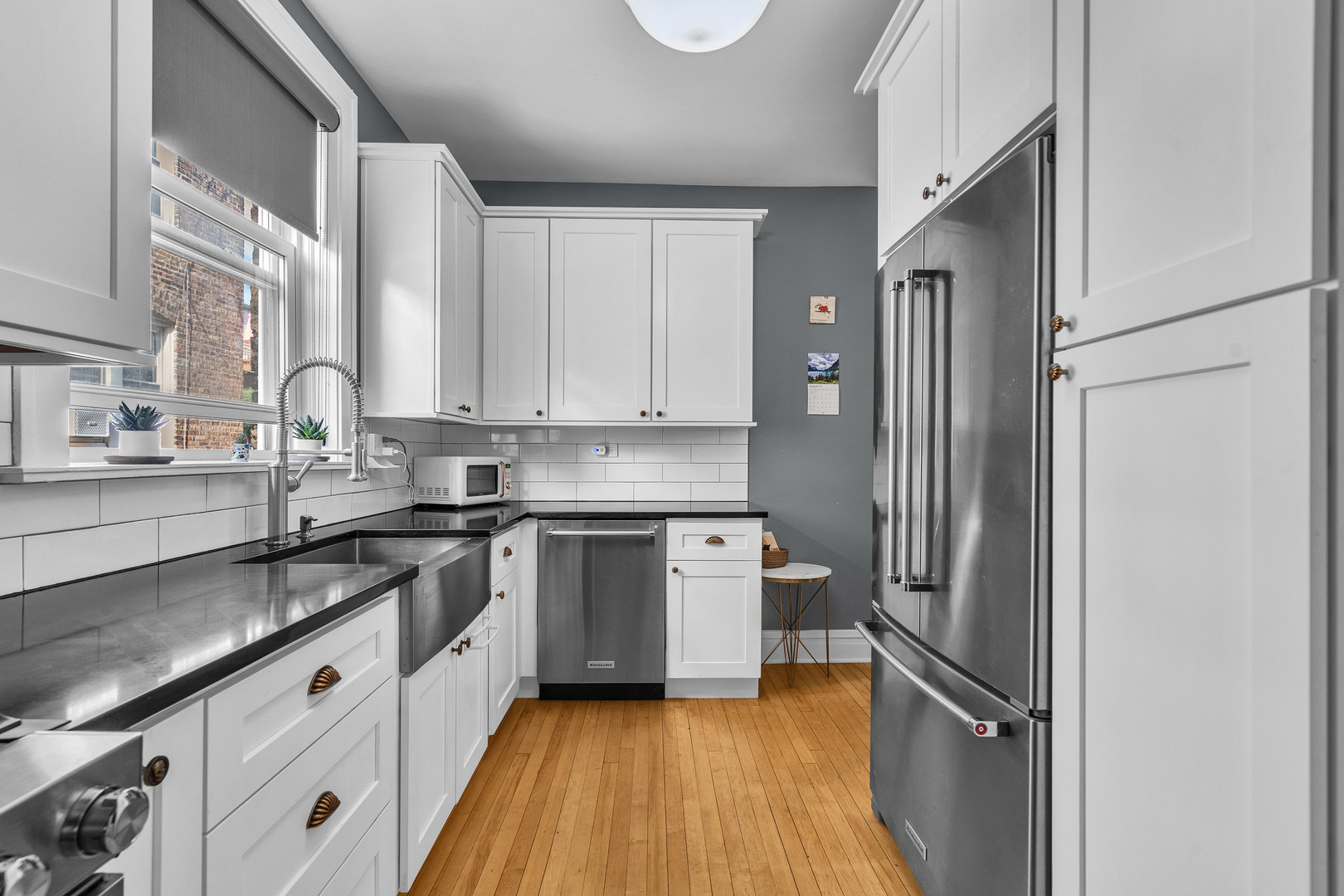 ANDERSONVILLE NEIGHBORHOOD: RARELY AVAILABLE 1 BEDROOM & 1 BATHROOM CONDO! This elegant and expansive home is perfectly situated on a quiet tree-lined street in a beautifully preserved vintage building in one of Chicago’s most sought-after neighborhoods!! This stunning home offers timeless elegance, generous proportions, and modern upgrades throughout. Step inside to find gleaming hardwood floors, crisp white crown molding, and classic baseboards that enhance the home’s architectural charm. The gourmet KITCHEN is a chef’s dream, featuring 42″ cabinets, granite countertops, stainless steel appliances, and an oversized walk-in pantry. Thoughtful details include soft-close drawers, pull-out shelving, and a built-in spice rack for optimal organization and functionality. The expansive, separate formal DINING ROOM flows seamlessly into a sunlit LIVING ROOM, framed by custom built-in bookcases and a beautifully detailed mantle-ideal for entertaining or cozy nights in. Enjoy peaceful views of the meticulously landscaped, fenced-in courtyard from your elevated first-floor unit. Just steps from the vibrant heart of Andersonville, you’ll have immediate access to award-winning restaurants, charming boutiques, cozy cafes, and the Red Line for convenient commuting. This rare offering combines vintage character with modern comfort in an unbeatable location-don’t miss your opportunity to own a piece of Andersonville’s historic charm. WELCOME HOME!!