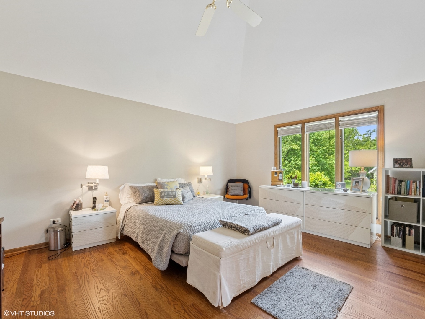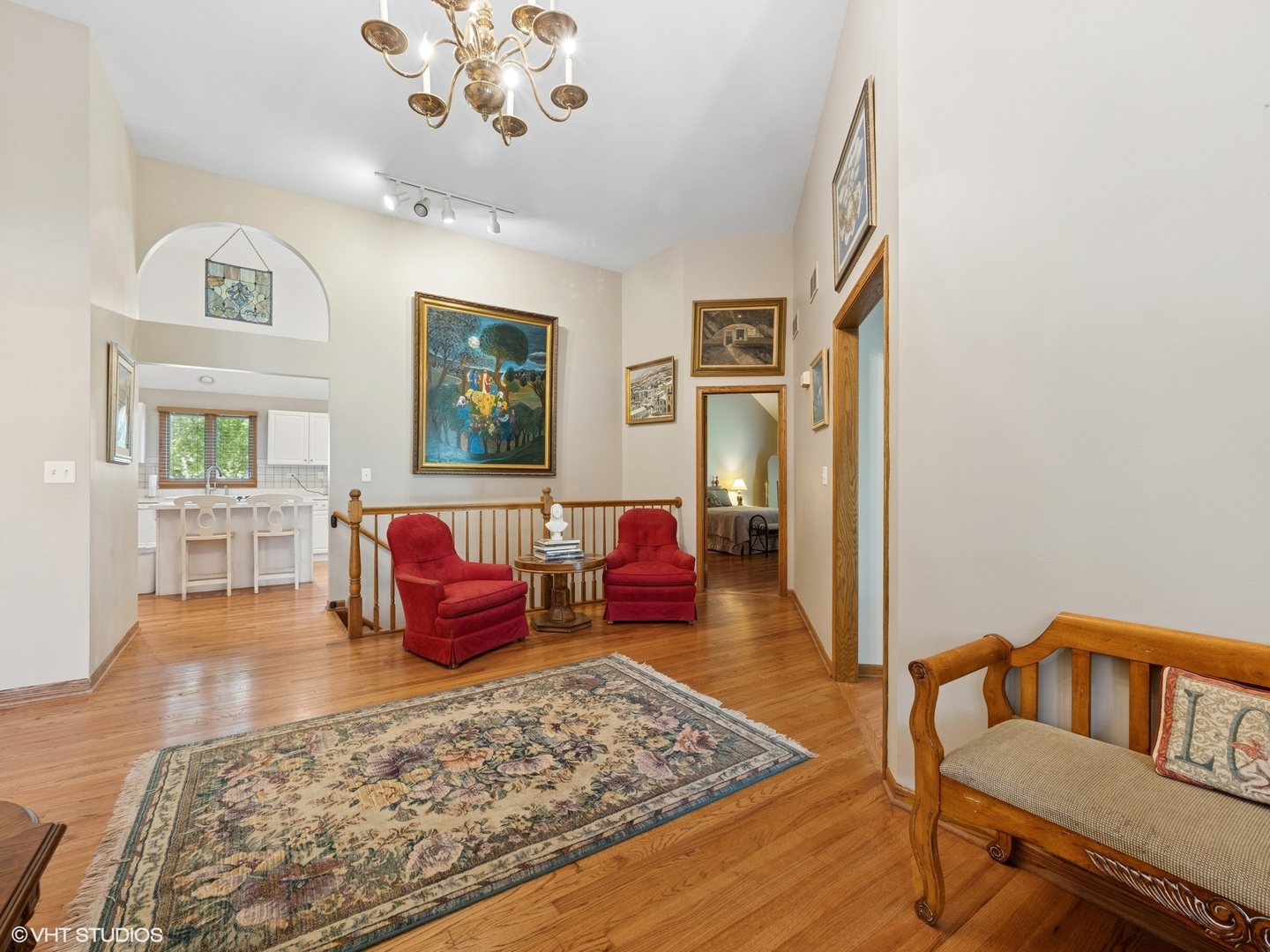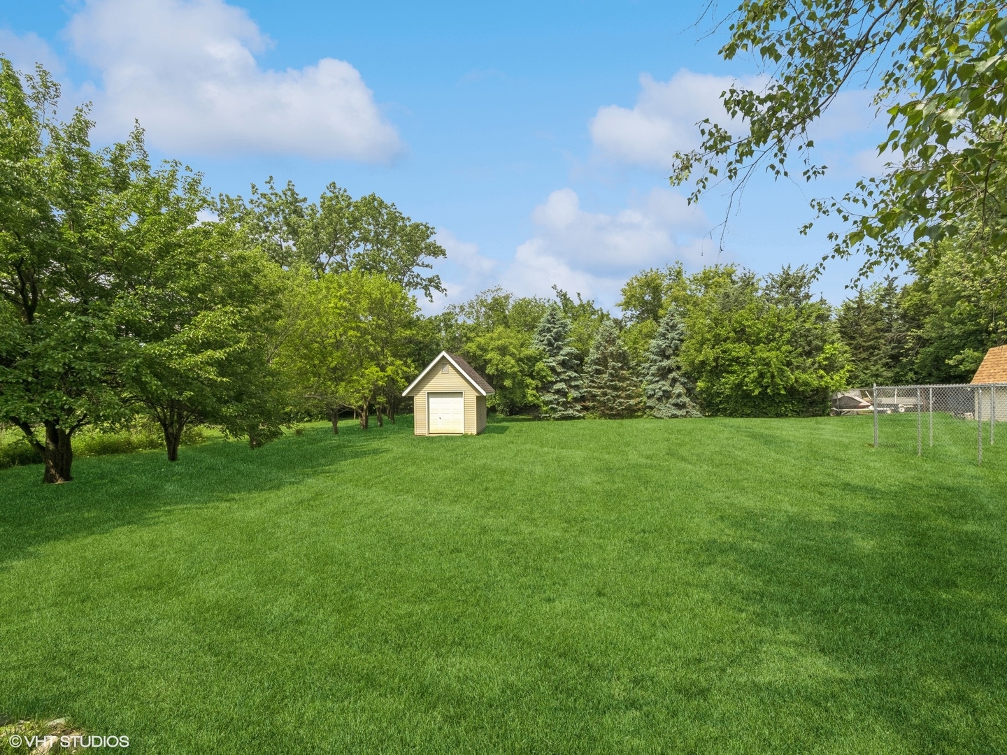 Welcome to this charming and spacious 5-bedroom brick ranch, perfectly situated on a serene half-acre lot at the end of a quiet street. This impeccably maintained home features an attached 3-car garage and is conveniently located near Woodfield Mall, the Schaumburg Train Station and the Elgin O’Hare Expressway, in the highly-rated District 211 and District 54 school zones. A dramatic foyer welcomes you into the home, setting the tone for the elegance found throughout. The main floor features an inviting eat-in kitchen that flows into a great room with high ceilings, abundant natural light, and a cozy wood-burning fireplace, creating the perfect setting for gatherings. This level also offers three spacious bedrooms, including two with ensuite bathrooms, a third full bathroom, a separate dining room, a formal living room, a versatile den, and a full laundry room. The fully finished lower level is a standout feature, offering two additional bedrooms, a full bath, a second kitchen, and a bonus room, making it ideal for an in-law suite or guest accommodations. The expansive, fruit tree-lined backyard is your private oasis, designed for relaxation and entertainment. Enjoy warm evenings on the large deck and patio, or make use of the fenced-in dog run, and a convenient storage shed. Recent updates include newer hardwood floors, water heater, furnace, air conditioner, humidifier, and well pump. Additionally, the home is wheelchair accessible. This home combines convenience, style, and functionality in a sought-after neighborhood.