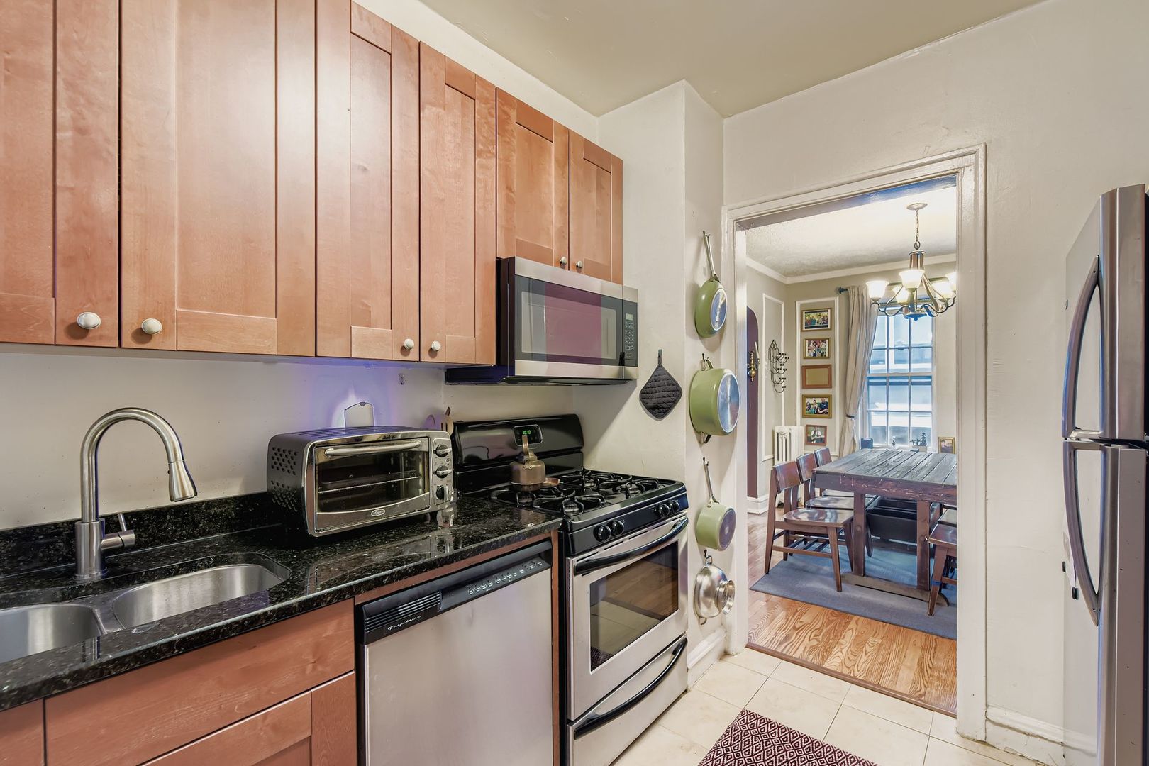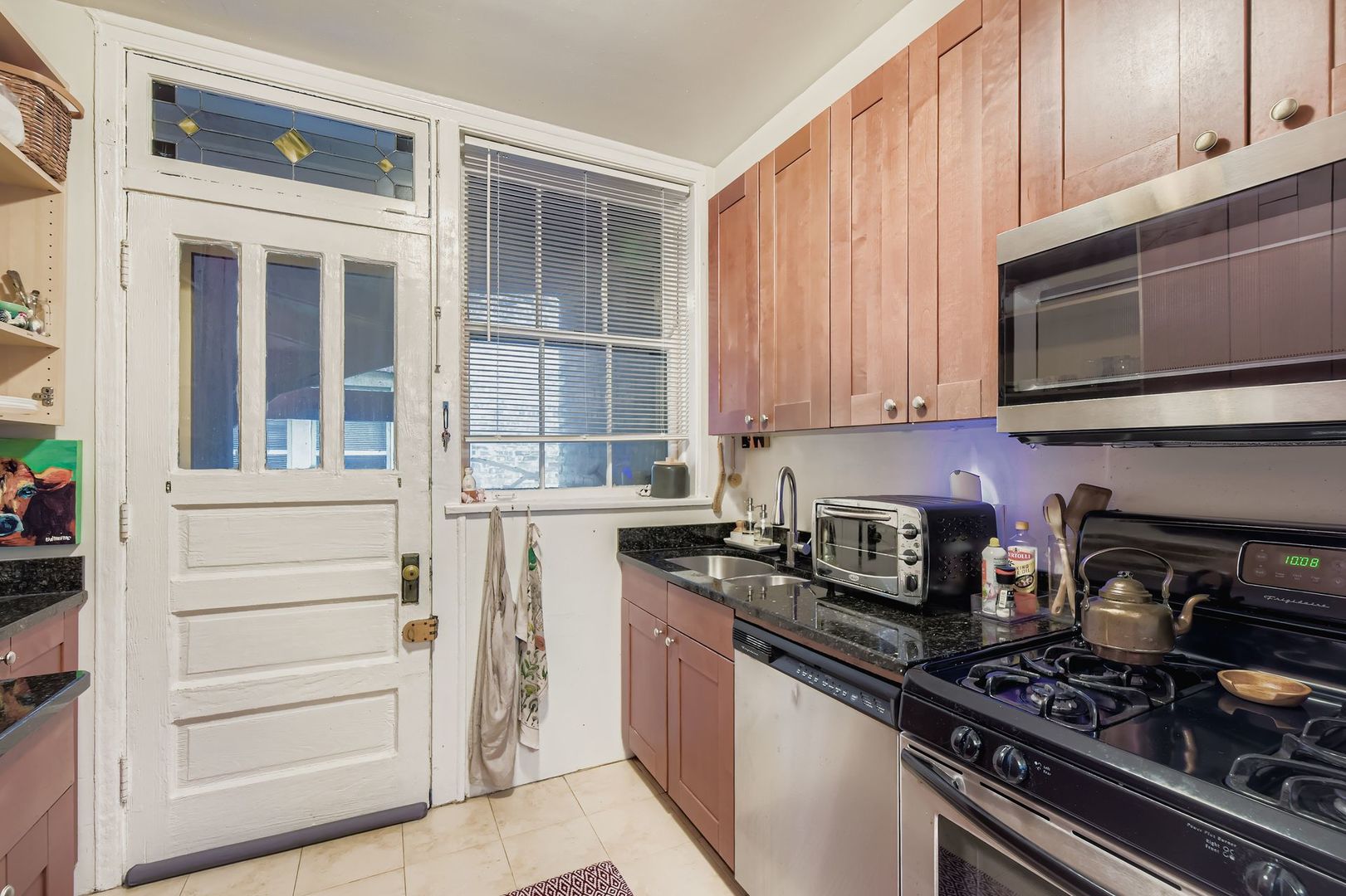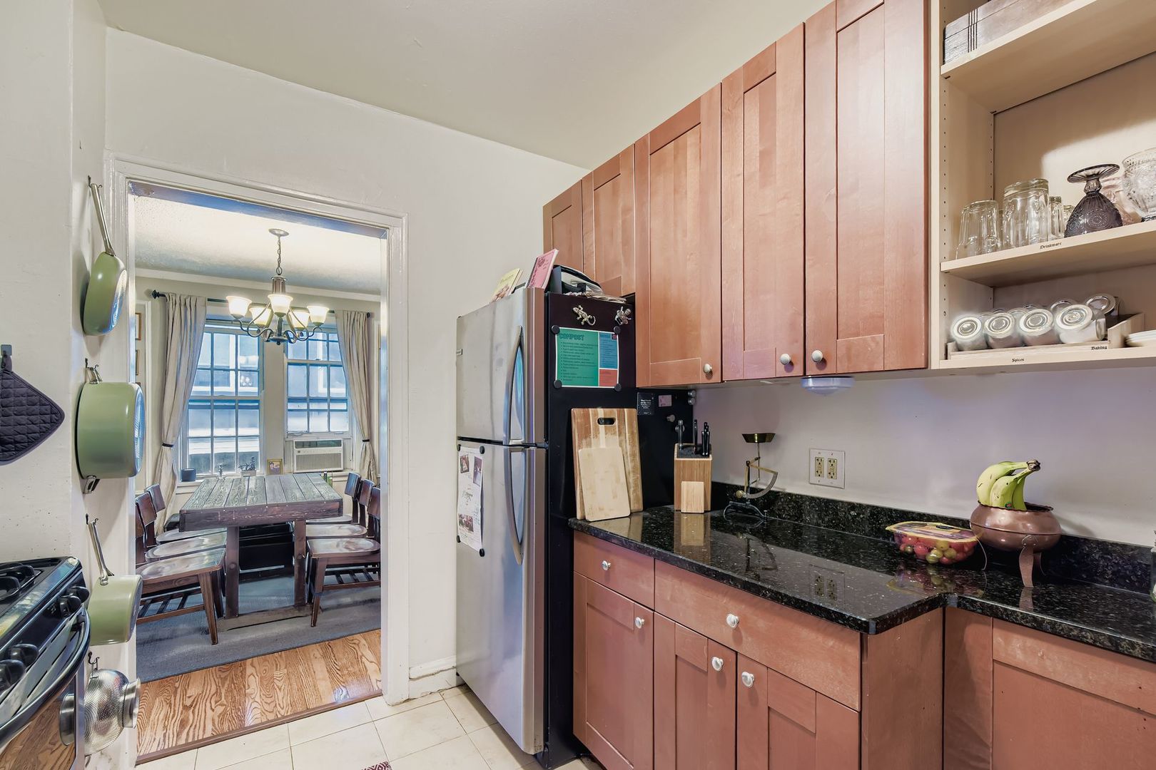 This beautiful vintage one bedroom, one bathroom condo has a full dining room with exposed brick, hardwood floors in living areas and bedroom, west exposure, and an updated kitchen with granite/stainless appliances including a dishwasher. This is a high first-floor unit with a large bedroom and generous closet space. The building features a beautiful shared patio garden, a convenient laundry room, a bike room, and a huge personal storage locker. The building is situated close to Loyola Beach, Glenwood Arts area, Red Line CTA, and the Rogers Park Metra station. HOA fee covers heat and water. 2 A/C units are included. Free overnight lot and $152/Mo garage parking available in the neighborhood. Installation of washer/dryer in unit ok with board approval.