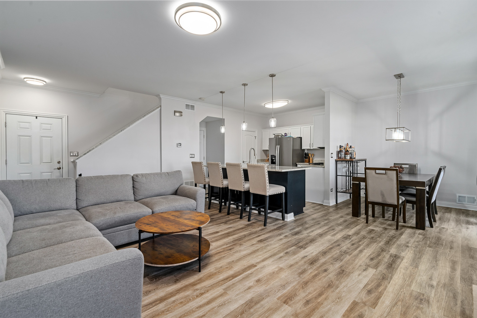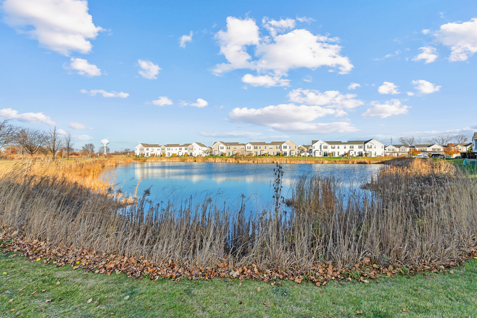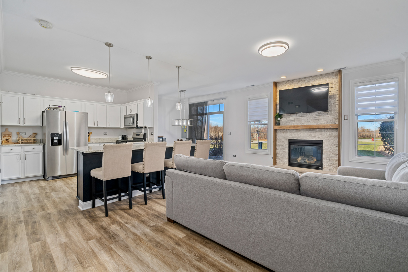 Experience refined living in this spectacular, fully remodeled in 2023 townhome, where every detail has been elevated with designer finishes and luxurious modern updates. Step inside to a sun-filled living room showcasing a gorgeous stacked-stone gas fireplace with a rustic barn wood mantle, creating a warm and inviting focal point. Elegant crown molding graces the entire main level, enhancing the home’s upscale ambiance. The stunning chef’s kitchen impresses with crisp white cabinetry with crown molding, stainless steel appliances, a pantry, and a large island with a farmhouse sink-perfect for gatherings and everyday living. The adjoining dining area offers seamless indoor-outdoor flow with a door leading to the concrete patio overlooking a tranquil scenic pond, a serene backdrop for morning coffee or evening relaxation. A beautifully updated main-level powder room adds convenience and style. Retreat upstairs to a spacious vaulted loft/family room, ideal for an additional living area, home office, or media space. The elegantly updated full bathroom features a sleek white quartz vanity and a tub with classic subway-tile accents, exuding a spa-like feel. Convenient 2nd floor laundry. The vaulted master bedroom boasts a generous sized walk-in closet outfitted with custom organizers, while the lovely second bedroom offers hardwood flooring and refined design touches. Custom window treatments throughout enhance the home’s polished and cohesive aesthetic. An attached heated two-car garage, impeccable craftsmanship, and thoughtful upgrades at every turn make this residence truly move-in ready. Completely transformed with exceptional attention to detail, this remarkable townhome delivers modern luxury, timeless style, and an unbeatable setting.