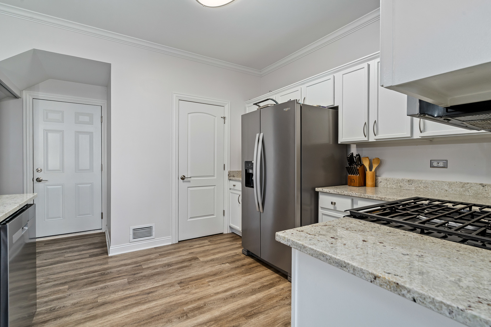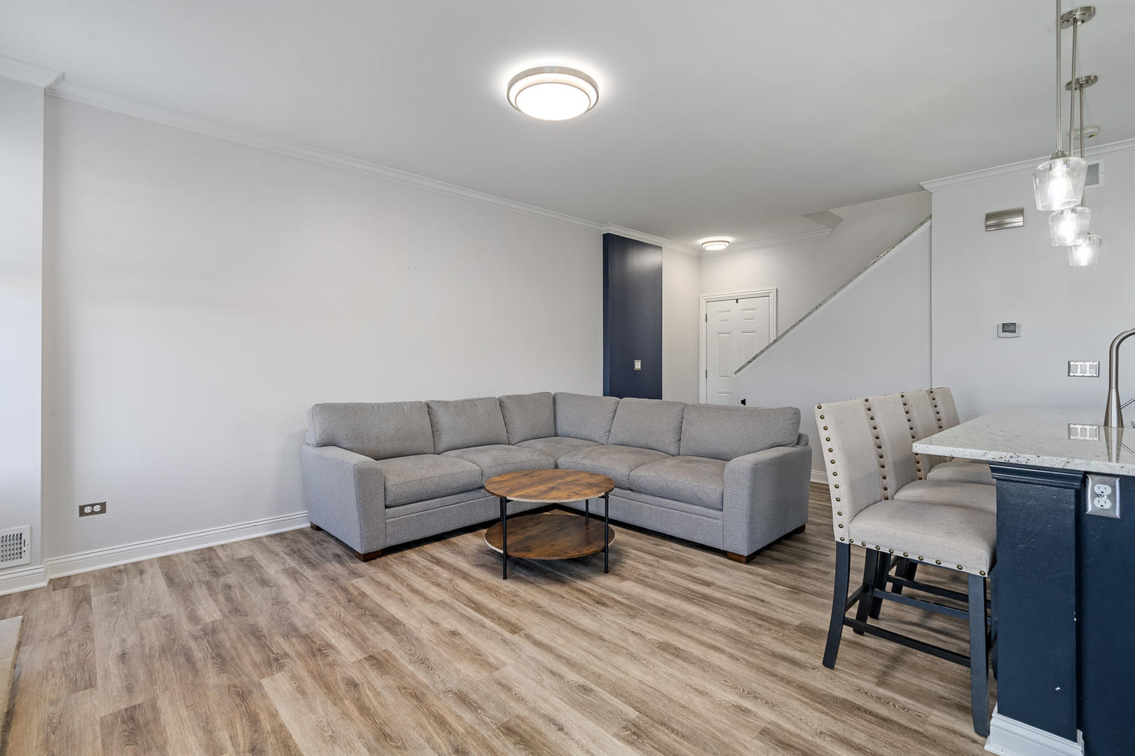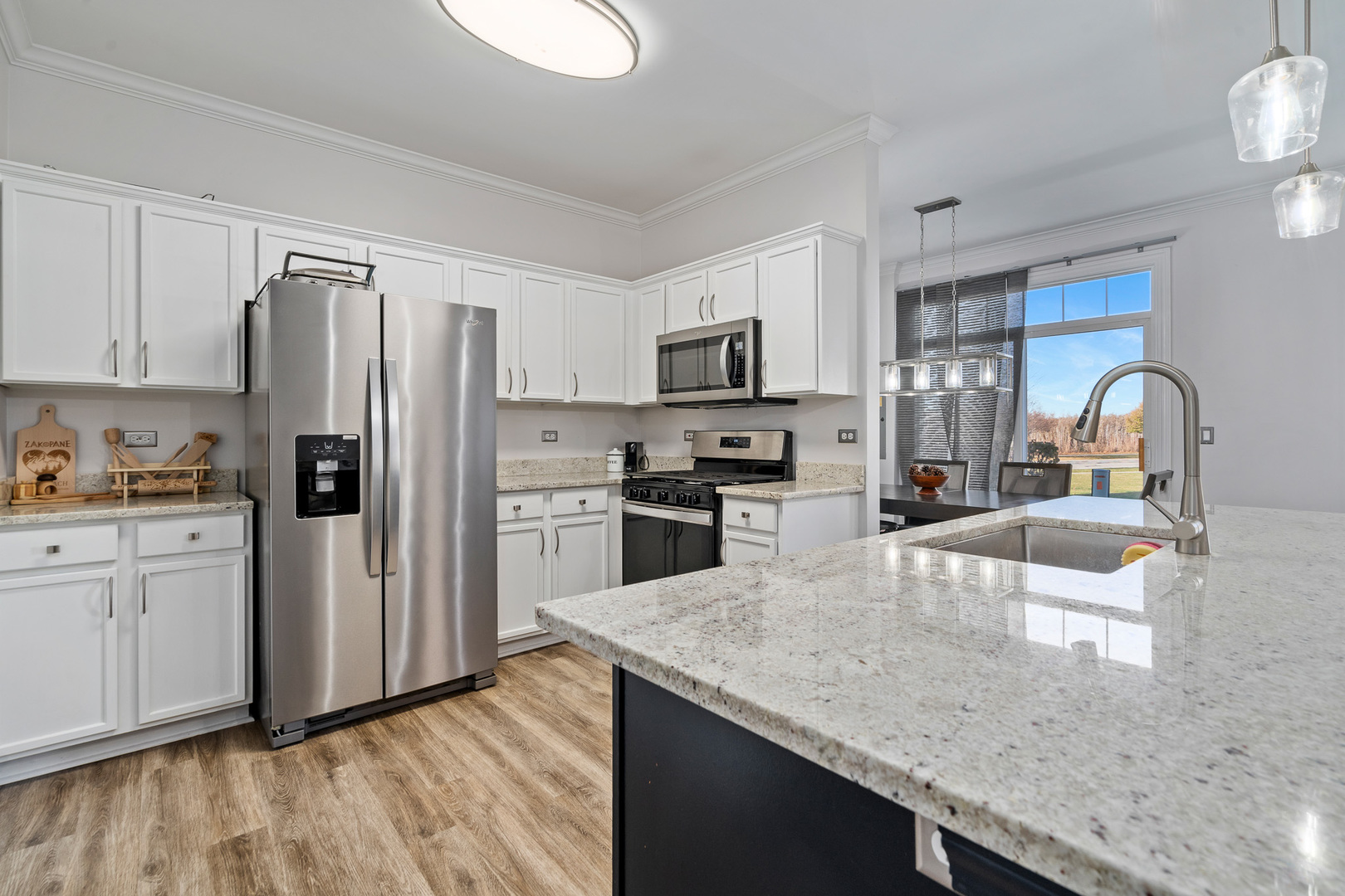 Experience refined living in this spectacular, fully remodeled in 2023 townhome, where every detail has been elevated with designer finishes and luxurious modern updates. Step inside to a sun-filled living room showcasing a gorgeous stacked-stone gas fireplace with a rustic barn wood mantle, creating a warm and inviting focal point. Elegant crown molding graces the entire main level, enhancing the home’s upscale ambiance. The stunning chef’s kitchen impresses with crisp white cabinetry with crown molding, stainless steel appliances, a pantry, and a large island with a farmhouse sink-perfect for gatherings and everyday living. The adjoining dining area offers seamless indoor-outdoor flow with a door leading to the concrete patio overlooking a tranquil scenic pond, a serene backdrop for morning coffee or evening relaxation. A beautifully updated main-level powder room adds convenience and style. Retreat upstairs to a spacious vaulted loft/family room, ideal for an additional living area, home office, or media space. The elegantly updated full bathroom features a sleek white quartz vanity and a tub with classic subway-tile accents, exuding a spa-like feel. Convenient 2nd floor laundry. The vaulted master bedroom boasts a generous sized walk-in closet outfitted with custom organizers, while the lovely second bedroom offers hardwood flooring and refined design touches. Custom window treatments throughout enhance the home’s polished and cohesive aesthetic. An attached heated two-car garage, impeccable craftsmanship, and thoughtful upgrades at every turn make this residence truly move-in ready. Completely transformed with exceptional attention to detail, this remarkable townhome delivers modern luxury, timeless style, and an unbeatable setting.