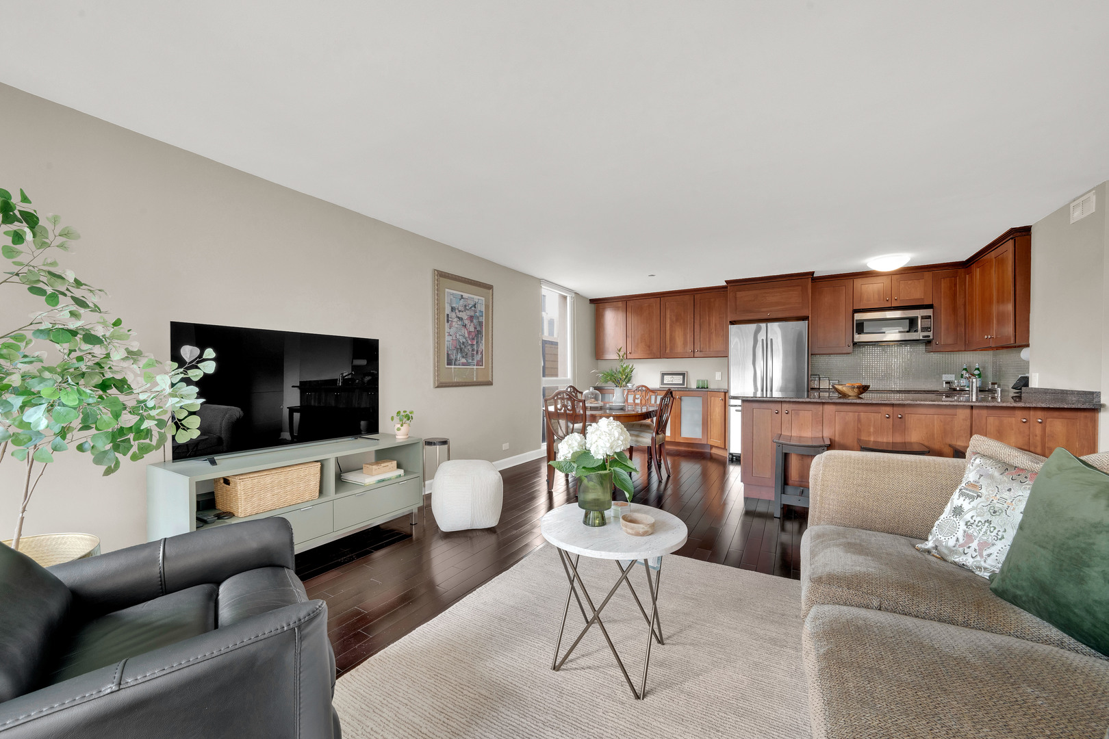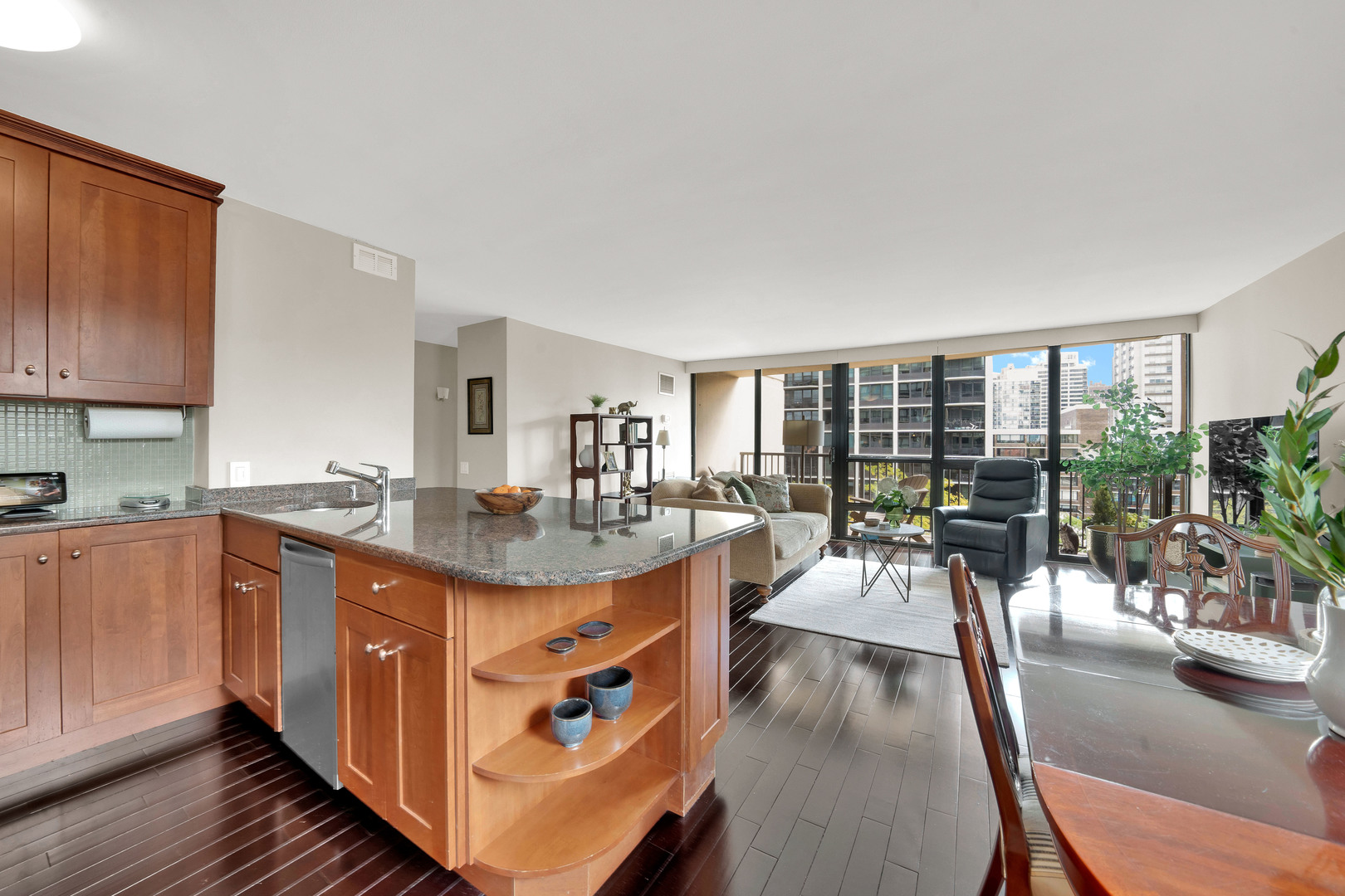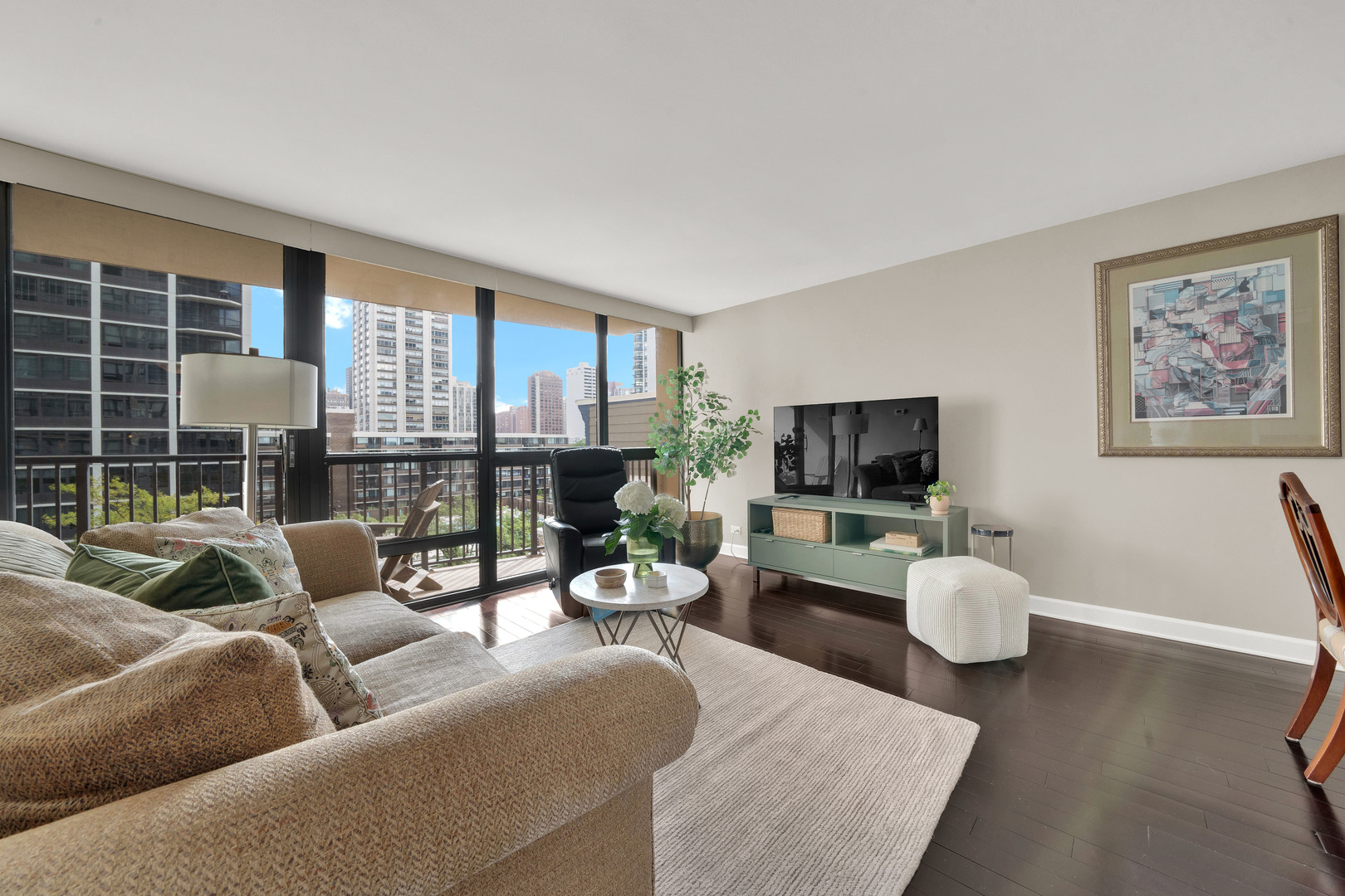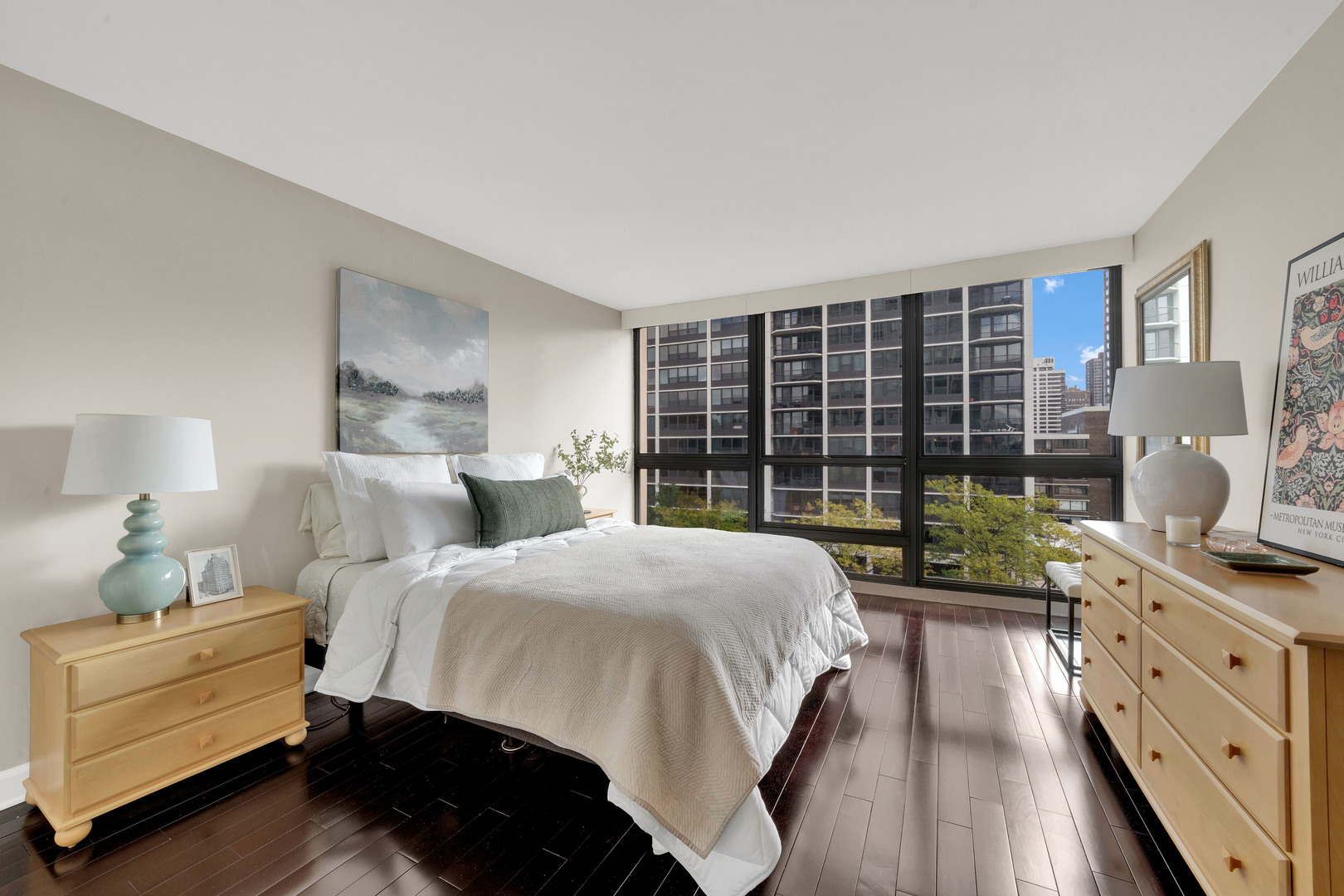 Offers have been received. Final and best offers should be submitted by 5 pm today, Monday, Sept. 29, 2025. Welcome to this bright and spacious southeast corner one-bedroom condo, perfectly situated at the crossroads of Old Town, Lincoln Park, and the Gold Coast. Floor-to-ceiling windows flood the home with natural light, highlighting the open layout and warm hardwood floors. Step onto the east-facing balcony for your morning coffee or evening wind-down while taking in city views. This condo offers organized closets throughout, shades for all windows, plus electronically controlled blackout shades in the bedroom for a restful night’s sleep. The kitchen is designed for both style and function with granite countertops, stainless steel appliances, a breakfast bar, and cabinetry that extends into the dining area for added storage. The updated bathroom features a walk-in shower and the convenience of an in-unit washer and dryer. The well-managed, pet-friendly building provides evening door staff, a daytime engineer, a fitness center, and laundry facilities. Monthly assessments include heat, A/C, water, internet, and cable. First-floor indoor parking (space #27) is included, and membership at the Sandburg Village pool is available. With parks, restaurants, the lakefront, and public transit just steps away, this is city living at its best.