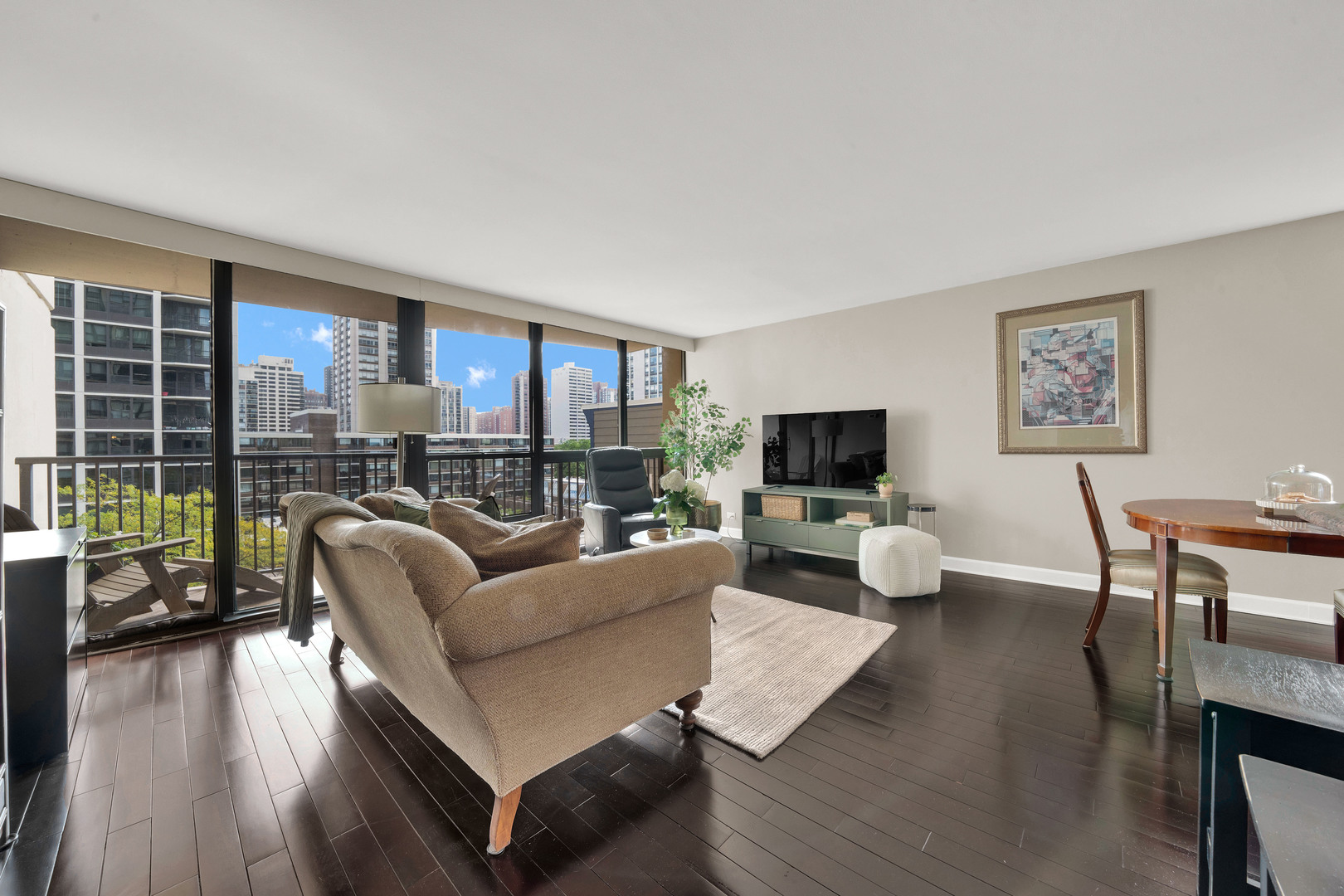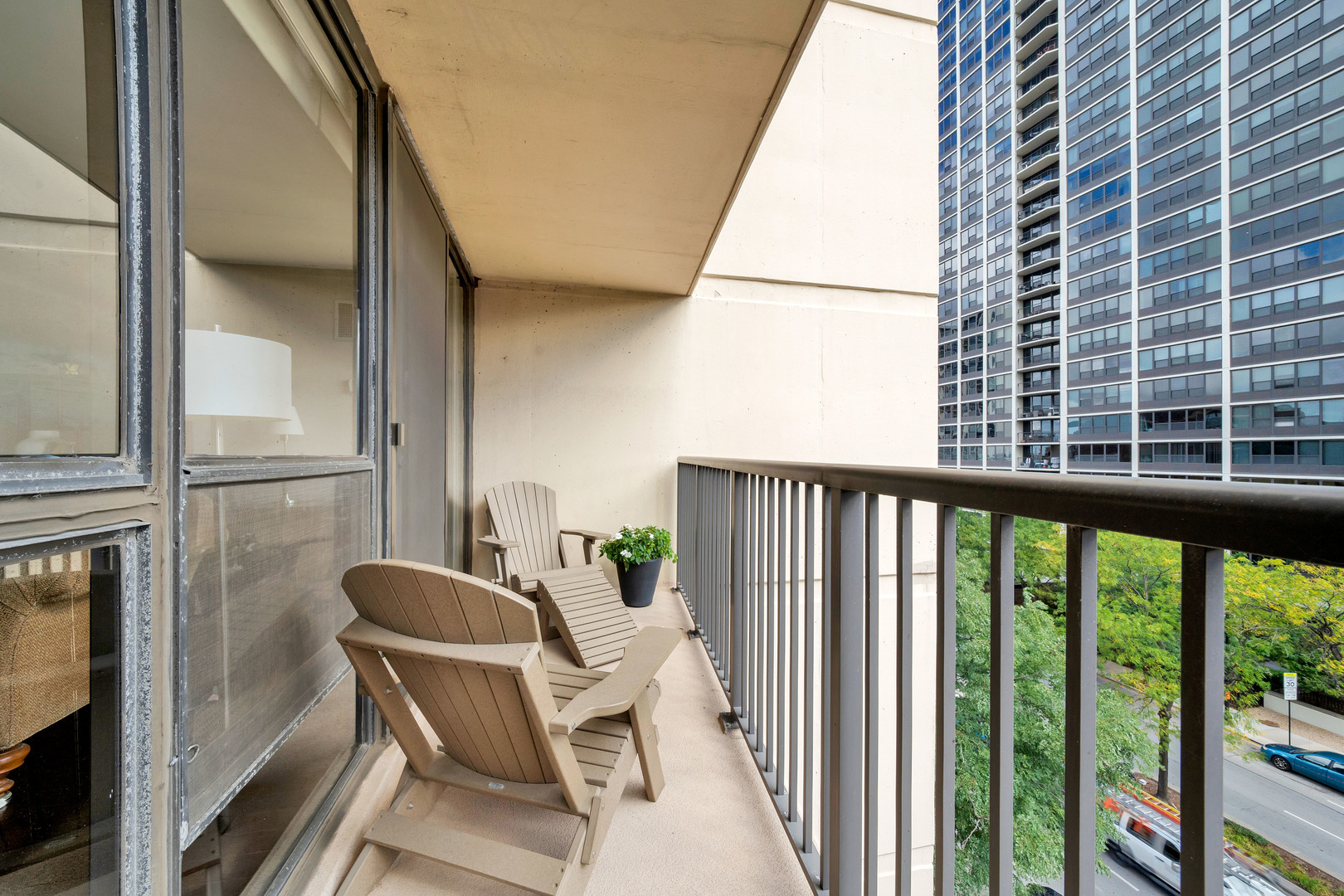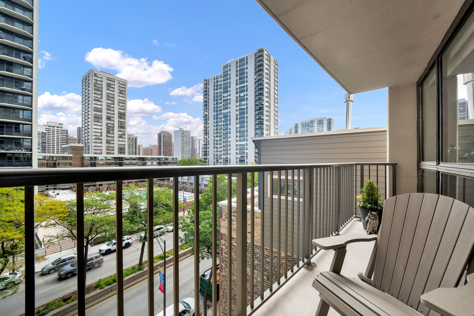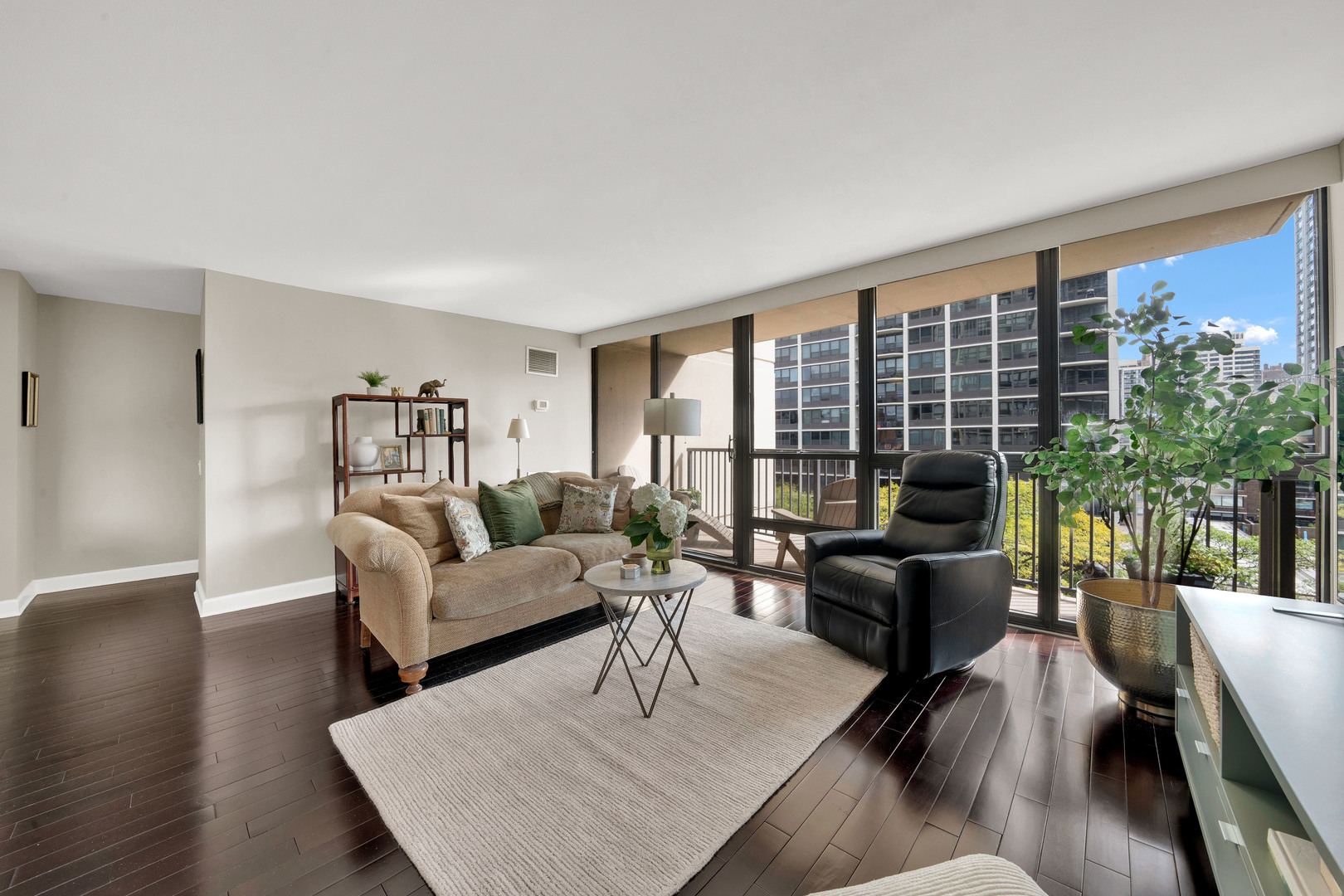 Offers have been received. Final and best offers should be submitted by 5 pm today, Monday, Sept. 29, 2025. Welcome to this bright and spacious southeast corner one-bedroom condo, perfectly situated at the crossroads of Old Town, Lincoln Park, and the Gold Coast. Floor-to-ceiling windows flood the home with natural light, highlighting the open layout and warm hardwood floors. Step onto the east-facing balcony for your morning coffee or evening wind-down while taking in city views. This condo offers organized closets throughout, shades for all windows, plus electronically controlled blackout shades in the bedroom for a restful night’s sleep. The kitchen is designed for both style and function with granite countertops, stainless steel appliances, a breakfast bar, and cabinetry that extends into the dining area for added storage. The updated bathroom features a walk-in shower and the convenience of an in-unit washer and dryer. The well-managed, pet-friendly building provides evening door staff, a daytime engineer, a fitness center, and laundry facilities. Monthly assessments include heat, A/C, water, internet, and cable. First-floor indoor parking (space #27) is included, and membership at the Sandburg Village pool is available. With parks, restaurants, the lakefront, and public transit just steps away, this is city living at its best.