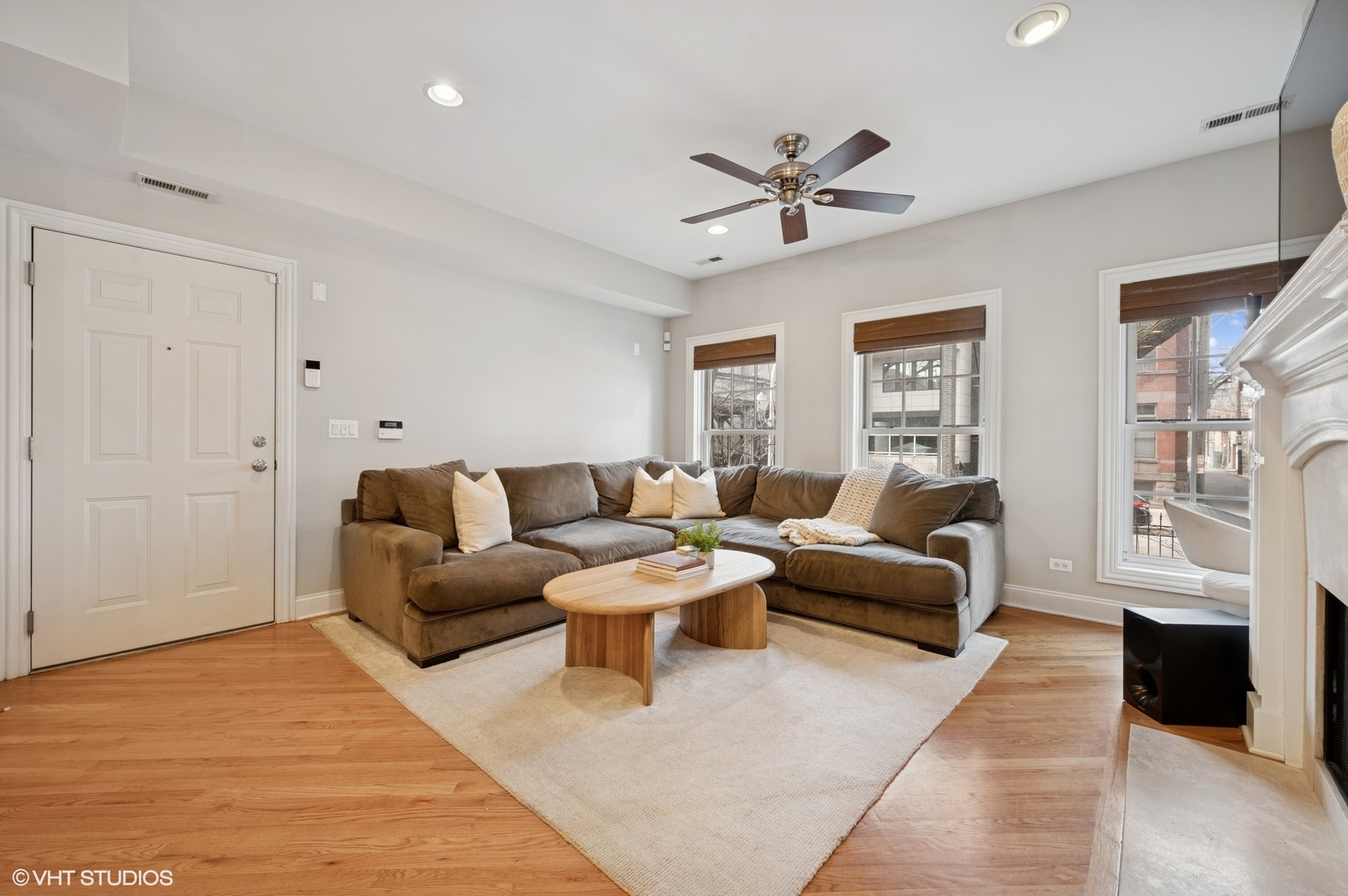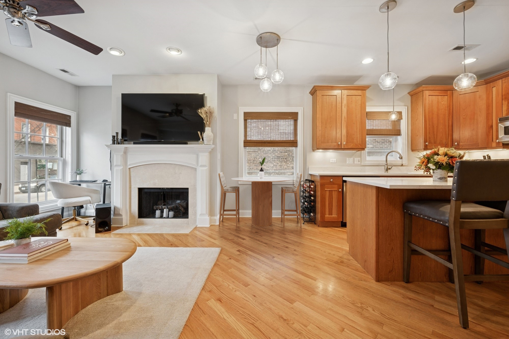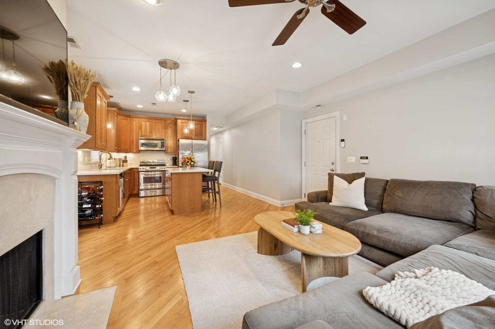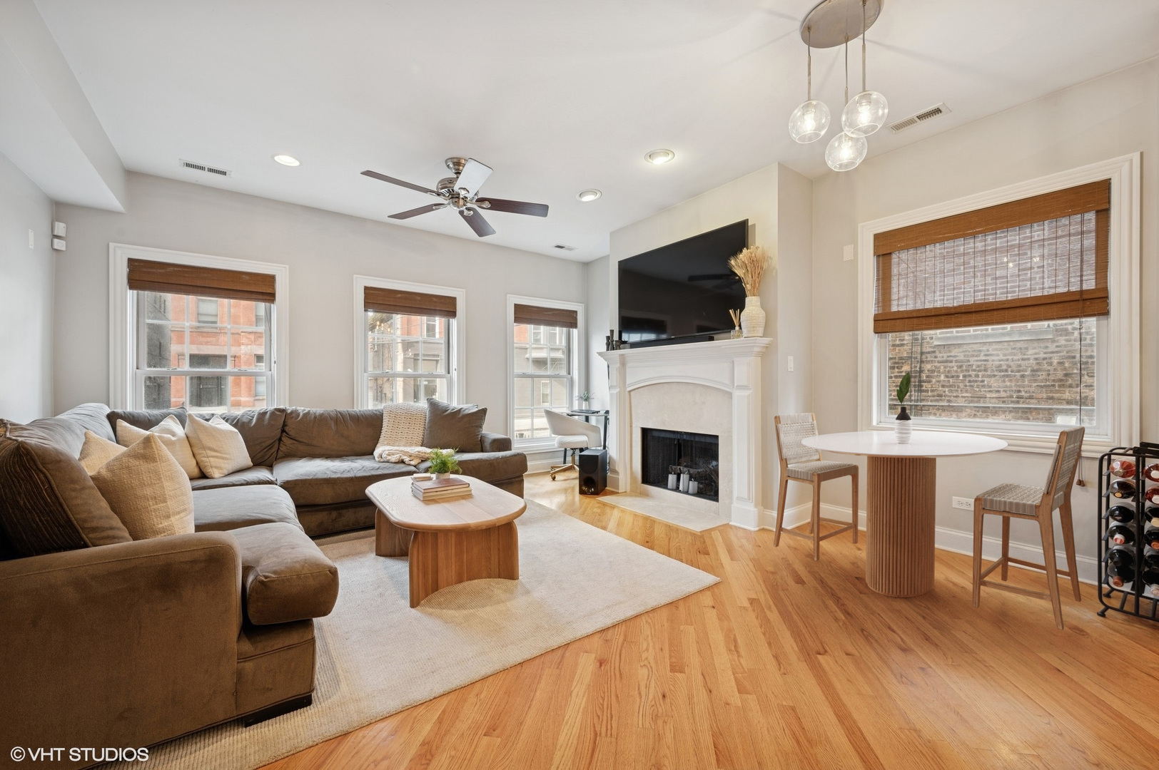 Impeccably maintained high first-floor 2-bedroom, 2-bath condo in walk-to-all Old Town location! The open-concept cook’s kitchen features 42″ custom cabinets, KitchenAid stainless steel appliances, new quartz counters and a large island with breakfast bar seating. The kitchen flows into the spacious living area with large windows overlooking tree-line Hudson Street and a gas fireplace with wood mantel and stone surround. Generously sized primary bedroom suite complete with marble bath. Additional highlights include hardwood floors, in-unit laundry and garage parking. Incredible Old Town location just steps from the lake, North Avenue Beach, Brown Line, and all of the fantastic shops and restaurants on Wells Street. No rental restrictions makes for an excellent long-term investment. Exceptional value – this home is a must see!