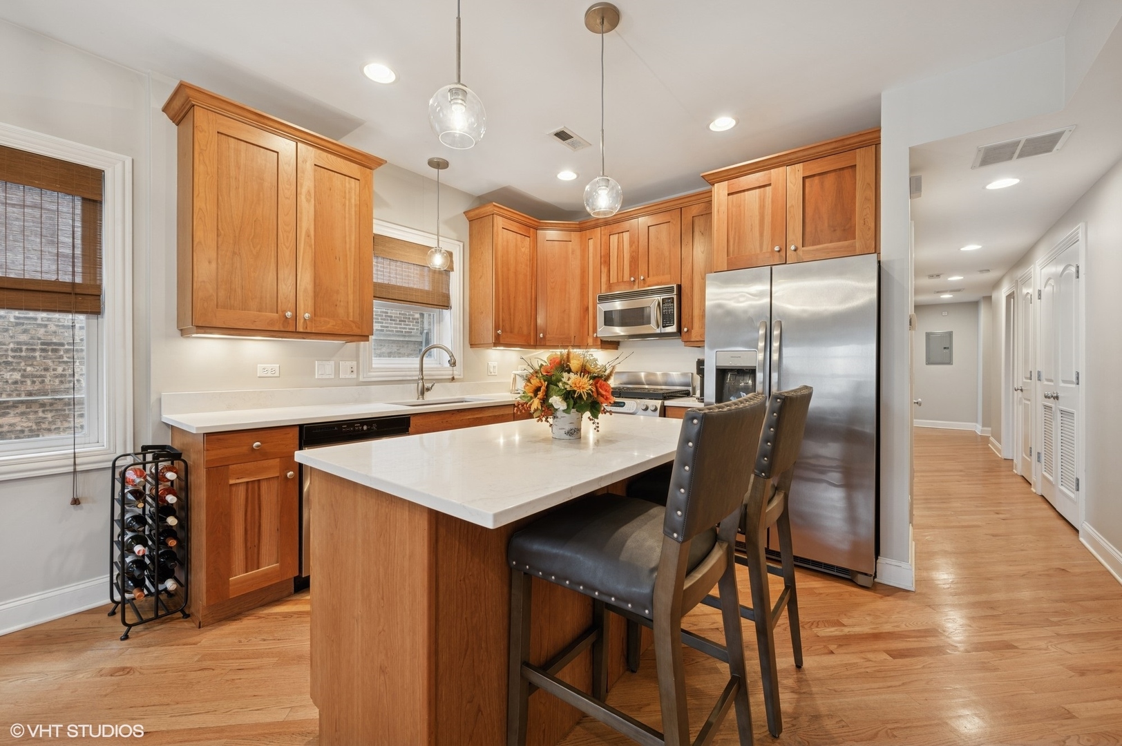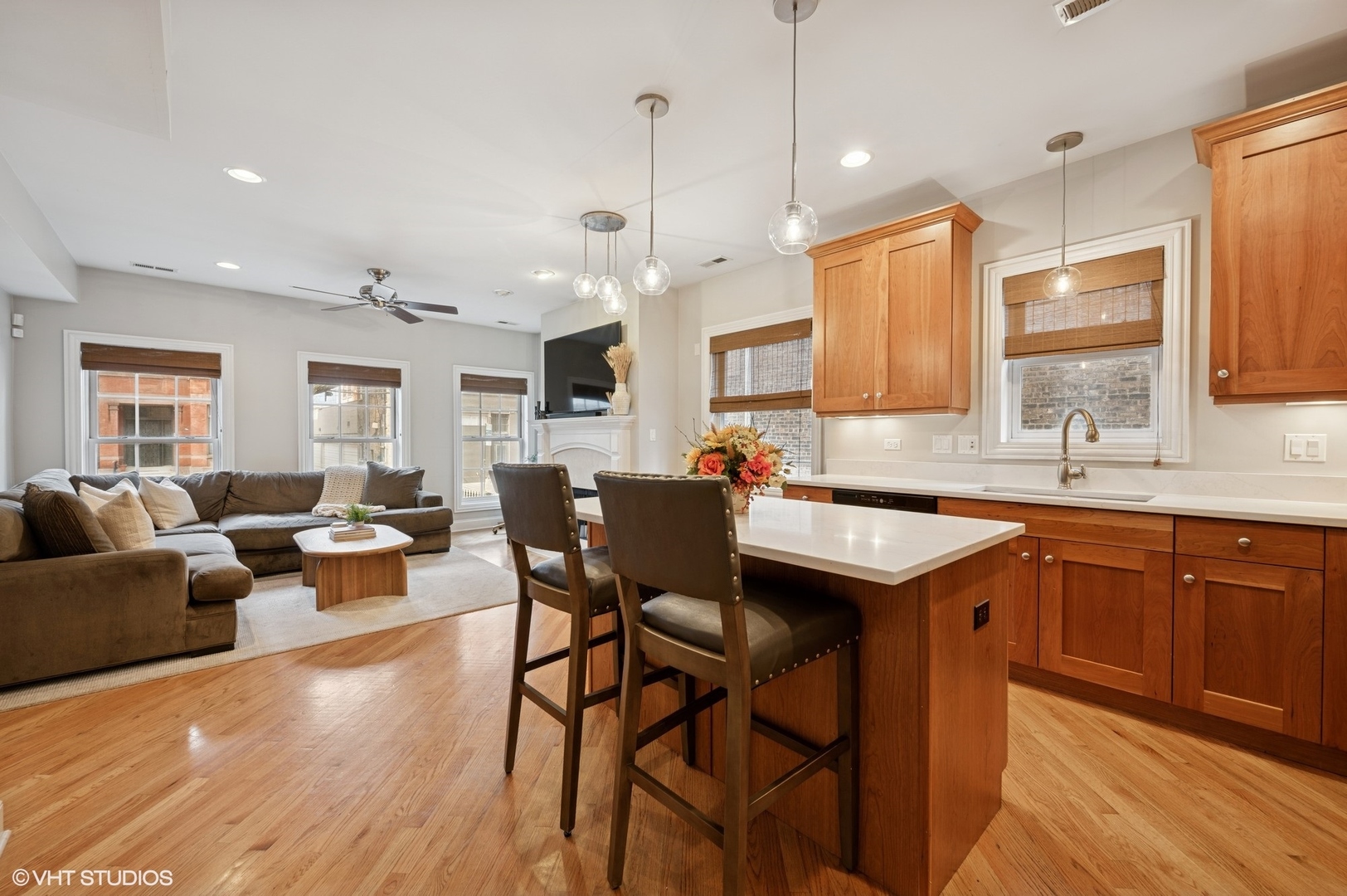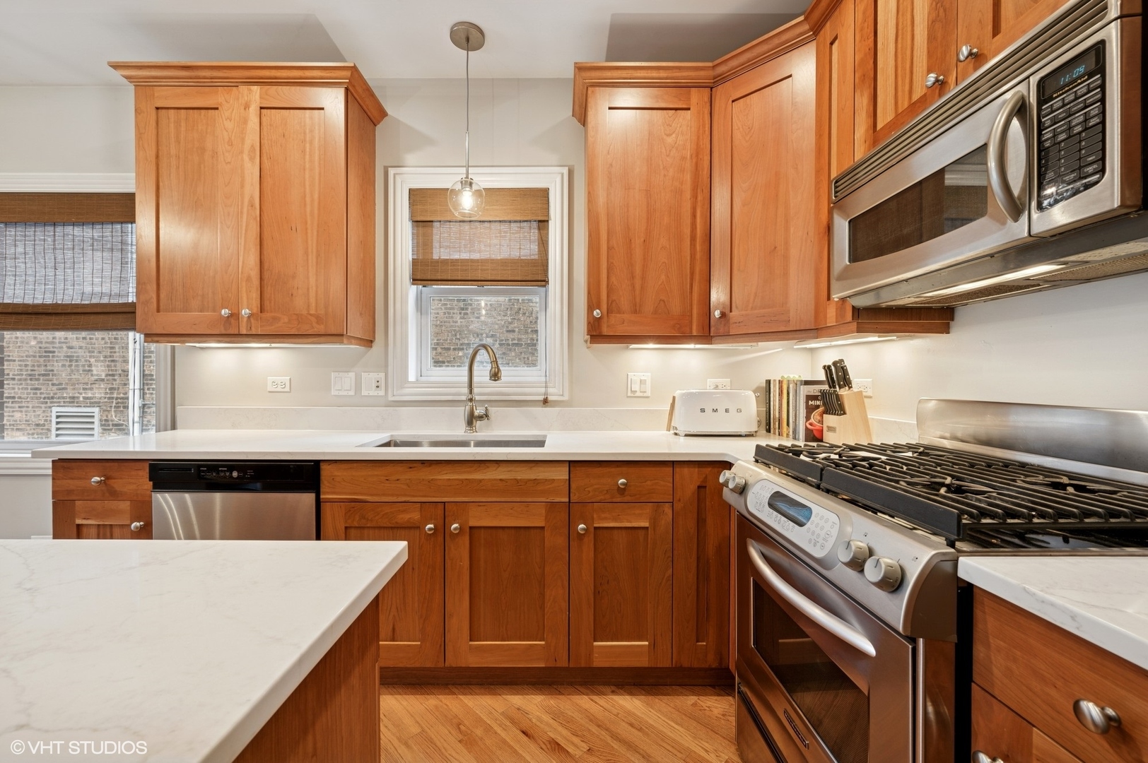 Impeccably maintained high first-floor 2-bedroom, 2-bath condo in walk-to-all Old Town location! The open-concept cook’s kitchen features 42″ custom cabinets, KitchenAid stainless steel appliances, new quartz counters and a large island with breakfast bar seating. The kitchen flows into the spacious living area with large windows overlooking tree-line Hudson Street and a gas fireplace with wood mantel and stone surround. Generously sized primary bedroom suite complete with marble bath. Additional highlights include hardwood floors, in-unit laundry and garage parking. Incredible Old Town location just steps from the lake, North Avenue Beach, Brown Line, and all of the fantastic shops and restaurants on Wells Street. No rental restrictions makes for an excellent long-term investment. Exceptional value – this home is a must see!