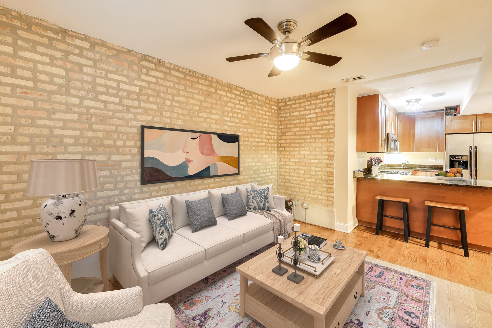 Beautifully maintained first-floor, ground-level condo just blocks from the stunning shores of Lake Michigan. This move-in ready 2-bedroom, 1-bath home features custom-stained hardwood floors, exposed brick accents, and an inviting open-concept layout that seamlessly connects the foyer, kitchen, breakfast bar, and living room. The spacious living area offers warm hardwood floors and exposed brick, while the updated kitchen includes granite countertops, stainless steel appliances, and a convenient breakfast bar for casual dining. The generously sized bathroom features a large soaking tub. The second bedroom is perfect as a guest room, office, or flex space. Enjoy the convenience of in-unit laundry, plus additional storage outside the unit. Major mechanicals have been updated, including a new furnace and A/C in 2023. Ideally located near Loyola University, with quick access to Northwestern University, the Red Line, Jarvis Square dining and shops, and Lakeshore Drive for an easy commute downtown. Street parking is plentiful, and rental parking options are available nearby. Investor-friendly-rentals allowed.