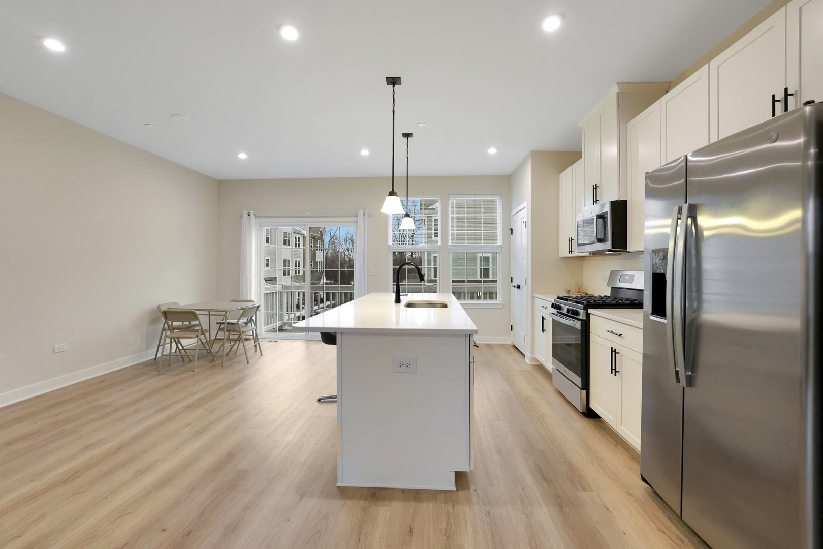 BARELY LIVED IN, THIS THREE STORY 2 YEAR OLD TOWNHOME FEELS LIKE NEW! ABOUT 1800 SQUARE FEET OF LUXURY. ENTER FROM YOUR TWO CAR GARAGE TO A ROOMY “FLEX ROOM” WHICH CAN BE A FAMILY ROOM, OFFICE OR TV/READING AREA. GO UP TO THE MAIN LEVEL WHICH HAS LUXURY VINYL PLANK FLOORING AND LOADS OF RECESSED LIGHTING! THIS INCREDIBLY OPEN LEVEL HAS LARGE LIVING ROOM, DINING AREA AND MODERN KITCHEN WITH HUGE QUARTZ ISLAND! ALL STAINLESS STEEL APPLIANCES TOO! MAIN LEVEL ALSO INCLUDES A LARGE PANTRY, ROOMY BALCONY AND A POWDER ROOM. UPPER LEVEL HAS THREE BEDROOMS, INCLUDING A MASTER SUITE WITH TRAY CEILING, WALK IN CLOSET AND FULL BATHROOM WITH OVERSIZED TILED SHOWER. HALLWAY FEATURES LAUNDRY CLOSET AND ANOTHER FULL BATHROOM WITH TUB. THIS TOWNHOME HAS EVERYTHING YOU NEED FOR COMFORTABLE LIVING AND ENTERTAINING. LARGE TWO CAR ATTACHED GARAGE. CUSTOM BLINDS HAVE JUST BEEN INSTALLED THROUGHOUT HOME! PARK IN DRIVEWAY PLEASE. CLOSE TO UPSCALE SHOPPING, RESTAURANTS AND WALKING TRAILS.