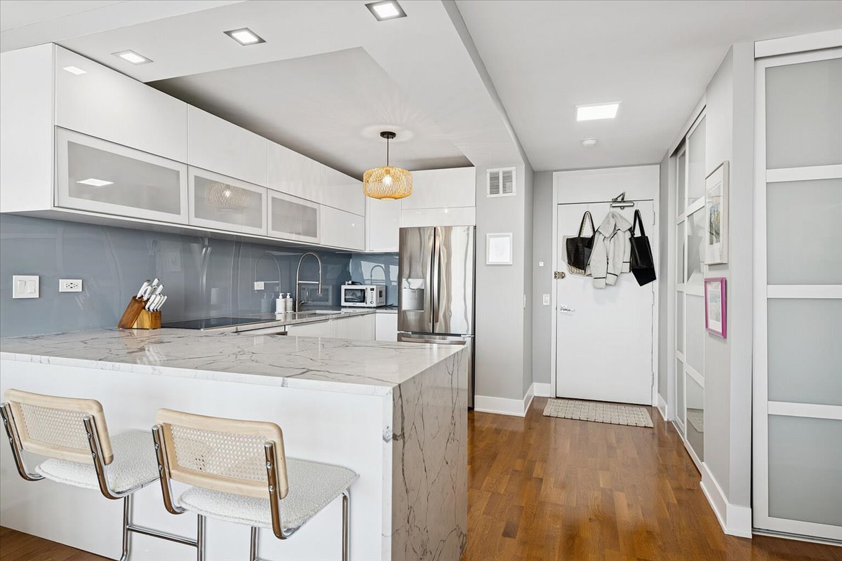 Fully renovated in 2018, this prime Old Town “James House” condo is waiting to welcome you home. Clearing all neighboring buildings, the 26th floor provides an expansive western view. Walk into the modern open kitchen with Quartz counter tops, Miele and GE appliances, and a large peninsula with overhang for bar stools. Nearby the bathroom is bright, clean and inviting with Kohler and Grohe fixtures. All plumbing in kitchen and bathroom was replaced during renovation. Condo features engineered hardwood flooring throughout. Large built out walk in closet is across from the bathroom, while there are two more auxiliary closets around the corner. Assessments incl heat, AC, cable and internet. Pets welcome: 40lb pet weight max. Building rental cap has been met. Parking available for rent ($190/month). James House is one of the more updated Sandburg Village towers with updated hallways and lobby, 24 hr doorstaff and maintenance staff. Rooftop deck has spectacular views of the lake and downtown. Sandburg Village Community has access to 2 outdoor pools, sundecks, tennis courts, hospitality rooms for additional fees.