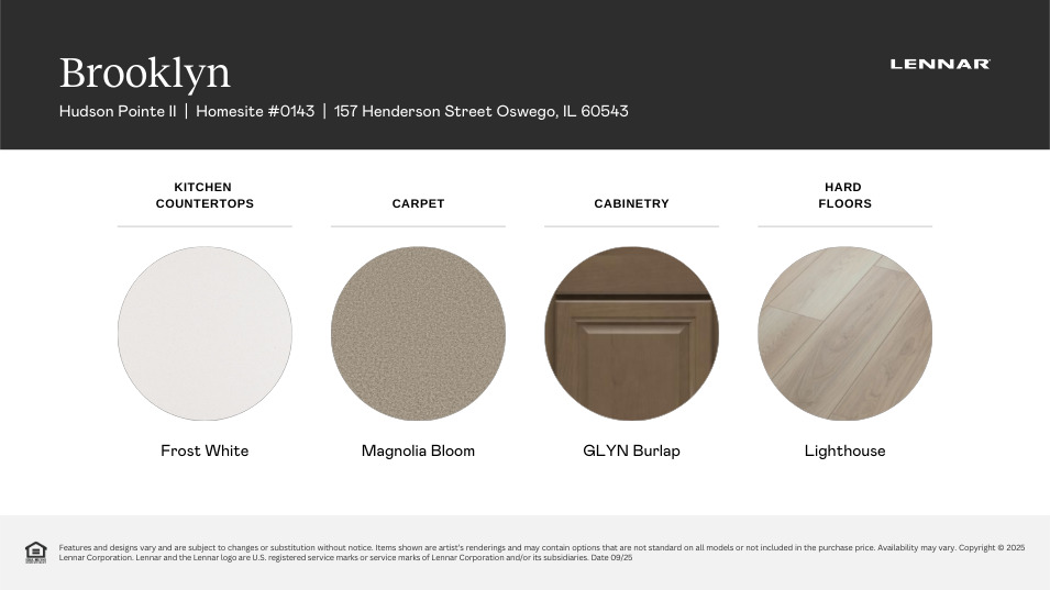 SPECIAL FINANCING AVAILABLE!! READY FOR DECEMBER DELIVERY!! Homesite #0143. Introducing the Brooklyn model-a thoughtfully designed two-story home that seamlessly blends elegance with everyday functionality. This spacious layout offers four well-appointed bedrooms, two and a half bathrooms, and a private study, making it ideal for both family living and professional needs. A formal dining room near the entrance sets the tone for gatherings, while the adjacent study offers a quiet space for work or creativity. At the heart of the home is an expansive kitchen featuring an oversized center island, premium cabinetry, and sleek countertops. This stylish culinary space flows effortlessly into the breakfast nook and the casual family room, creating a welcoming open-concept layout that’s perfect for entertaining and day-to-day comfort. Upstairs, the owner’s suite is a peaceful retreat with two generous walk-in closets and a spacious en-suite bathroom. Three additional bedrooms and a second-floor laundry room add both flexibility and convenience, making the Brooklyn an exceptional choice for modern living. Exterior will be Greystone color siding with Shadow Gray color brick. (pic for reference ONLY). *Photos are not this actual home* Welcome to Hudson Pointe II, a beautifully designed master-planned community offering brand-new homes in the heart of Oswego, Illinois. Perfectly blending comfort, convenience, and natural beauty, this neighborhood is ideal for families and individuals seeking a balanced lifestyle. Right within the community, residents can enjoy a well-maintained park for leisurely play and gatherings, as well as a serene pond that enhances the peaceful atmosphere of Hudson Pointe II. Just 10 minutes from the Naperville Route 59 corridor, Hudson Pointe II places premier shopping, dining, and entertainment within easy reach. Access top destinations like Whole Foods, Amazon Fresh Market, LA Fitness, and Costco, along with a variety of local restaurants and entertainment spots. Families will appreciate the top-rated Oswego School District 308, with students attending Southbury Elementary, Murphy Junior High, and Oswego East High School-all conveniently located within a 10-minute drive. Outdoor enthusiasts will love the close proximity to Wolf’s Crossing Community Park, offering an array of recreational features including playgrounds, an outdoor fitness area, a splash pad, and more-perfect for year-round family fun. At Hudson Pointe II, you’re not just buying a home-you’re joining a thoughtfully planned community where modern living meets natural charm and everyday convenience.