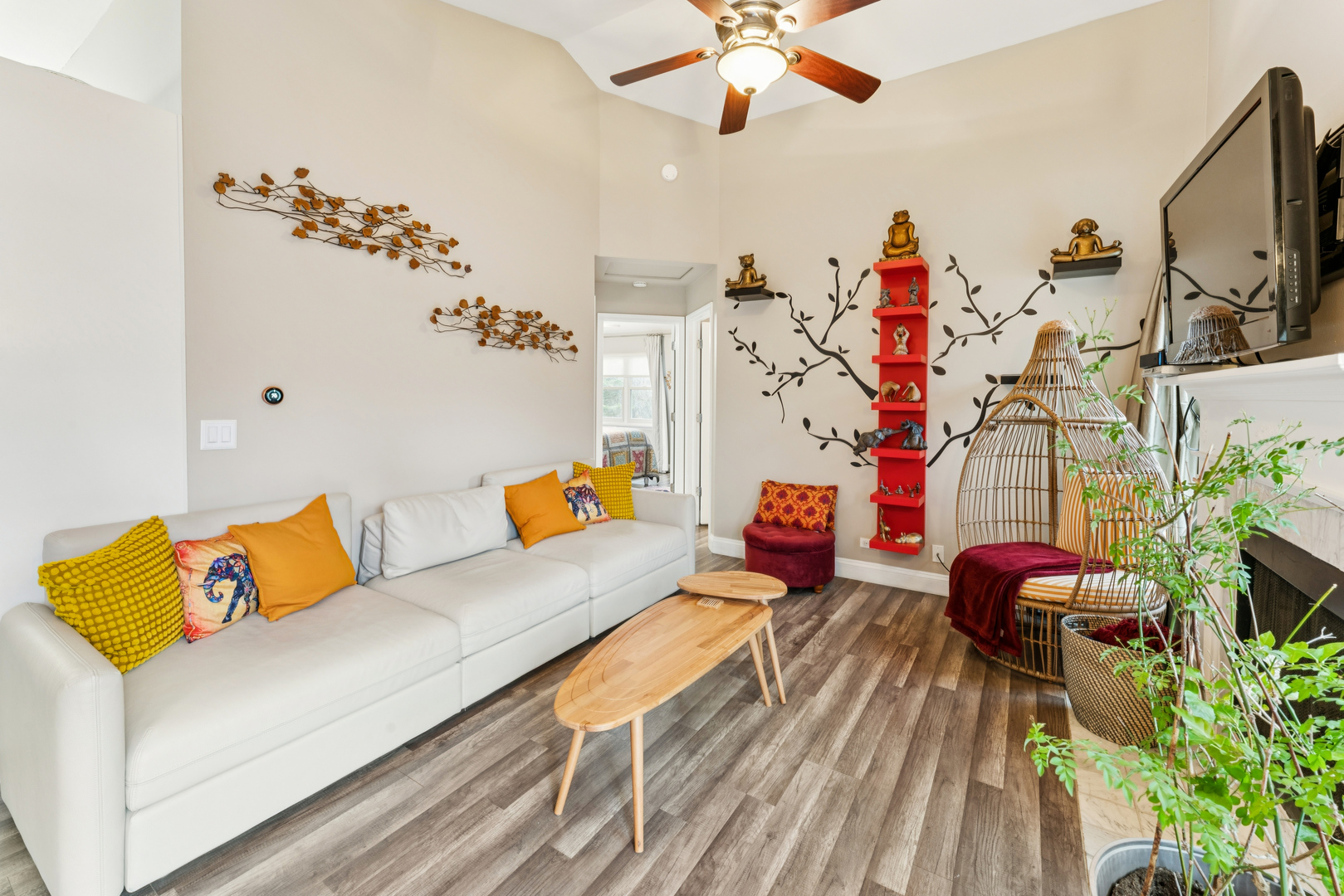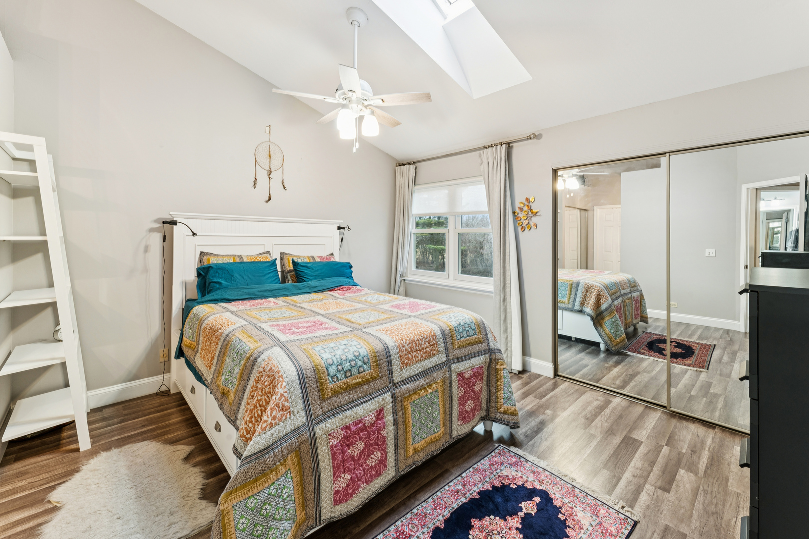 Welcome home to this beautifully updated second-floor ranch townhome in the heart of Palatine! This well-maintained 2-bedroom, 1-bath residence offers comfortable, low-maintenance living with a 1-car attached garage and a thoughtfully designed layout. Step inside to find wood laminate flooring throughout, creating a seamless and modern feel. The inviting living space is filled with natural light from three skylights and features a cozy gas fireplace, perfect for relaxing evenings at home. The updated kitchen showcases granite countertops, stainless steel appliances, and a reverse-osmosis filtered water system at the sink, ideal for everyday living and entertaining. Enjoy morning coffee or evening downtime on your private balcony, and appreciate the convenience of an in-unit utility room with a full-size washer and dryer. Additional highlights include NEW Andersen windows that comes with warranty, extra storage, and a furnace and A/C only 6 years old, offering peace of mind for years to come. Located just off Northwest Highway, this home provides unbeatable access to restaurants, grocery stores, banks, and the Metra, making commuting and daily errands effortless. A fantastic opportunity to own a move-in-ready home in a prime Palatine location with green space and walking trails
