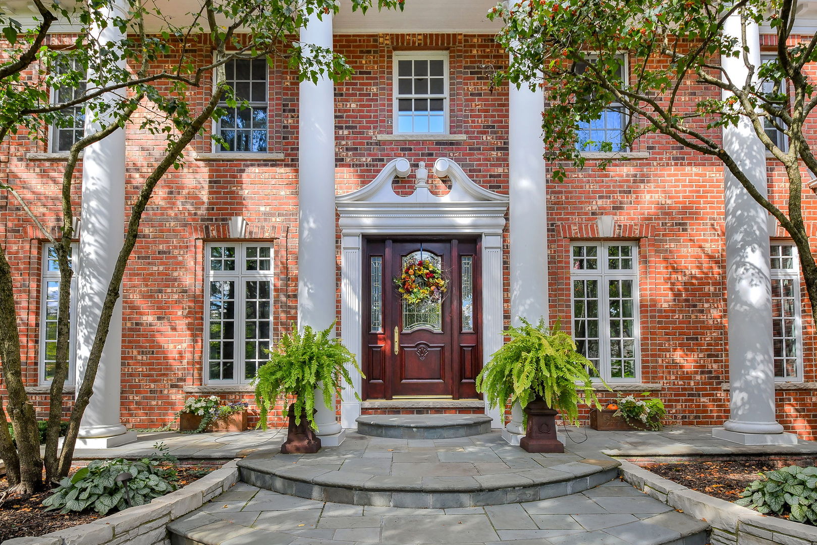 Custom-built with timeless design and a perfect floor plan, this stunning all-brick Georgian-style residence is nestled on a quiet cul-de-sac in the heart of Wheaton. Situated on one of the largest lots in the neighborhood-nearly half an acre (.46 acres)-this home offers serene privacy while nestled in close to Chicago Golf Club. From the moment you enter, you’ll be captivated by the architectural elegance and thoughtful layout that make this home ideal for both everyday living and grand-scale entertaining. The dramatic foyer features a soaring ceiling and is flanked by a formal living room and dining room, each with its own gas fireplace and refined ambiance. A richly paneled main floor library with coffered ceilings and built-in bookcases provides an ideal space for working from home or enjoying a quiet retreat. The expansive family room boasts a vaulted ceiling and a striking floor-to-ceiling brick fireplace, flowing seamlessly into the gourmet kitchen. Designed with high-end appliances and ample workspace, the kitchen also features a sunlit sitting area-perfect for morning coffee or unwinding at the end of the day. Just outside, a bluestone patio with built-in grill, burners, and beverage fridge extends your living space, ideal for alfresco dining and entertaining. The beautifully landscaped backyard is a true sanctuary, complete with lush vegetation, a crushed granite walking path, a second bluestone patio, limestone retaining walls, and elegant built-in planters. Upstairs, all bedrooms are generously sized with custom built-in closets. One bedroom features an ensuite bath, while the luxurious primary suite offers two large walk-in closets, an in-room laundry area, and a spa-like marble bathroom with walk-in shower, jetted tub, dual vanities, and a private water closet. The English-style basement offers 2,415 square feet of unfinished space with large windows and plumbing already in place for a full bathroom-providing incredible potential for future customization. A spacious 3-car garage and an expansive driveway offer ample parking for family and guests. Lovingly maintained by the original owners, this remarkable home is now ready for its next chapter. Don’t miss this rare opportunity to own a truly exceptional home in one of Wheaton’s most sought-after locations.