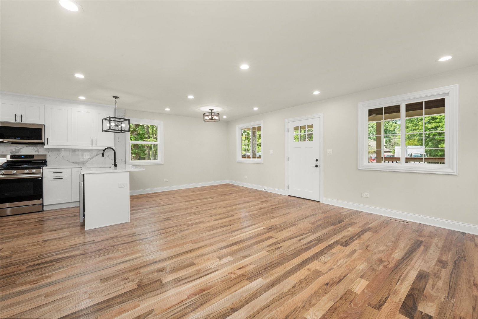 Welcome to your dream home! This completely remodeled ranch in Crete offers modern living with timeless charm. Every detail has been thoughtfully updated. All new plumbing, electrical, roof, siding, and asphalt driveway. All this so you can move right in with confidence. A 10 ft front porch with soaring cathedral ceilings sets the tone as you enter into the bright, open-concept layout featuring a spacious living and dining area anchored by a beautiful fireplace. The kitchen is a showstopper with high-end stainless steel appliances, quartz countertops, custom white cabinetry, and a breakfast bar perfect for casual dining or entertaining. This home also showcases updated bathrooms, tankless water heater, and custom finishes throughout. An attached 2-car garage adds convenience, while the large lot provides plenty of space to enjoy the outdoors. Truly turn-key and ready for its new owners-don’t miss this rare find!