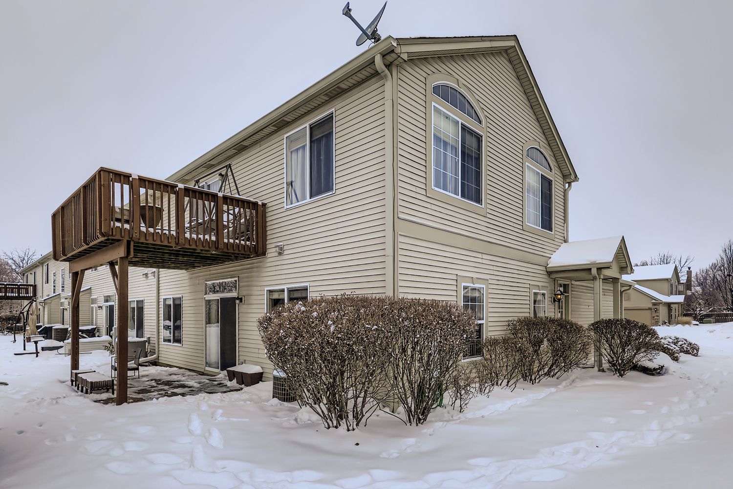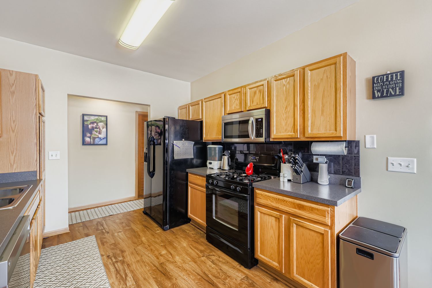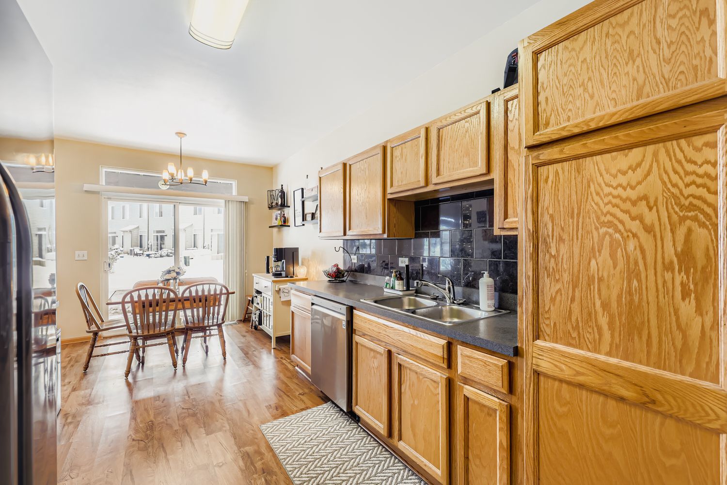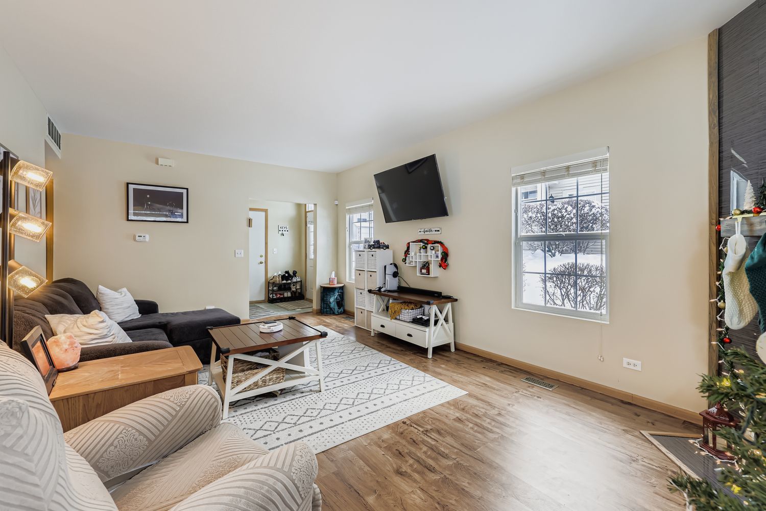 Immaculate and completely turn key! This ground-level, end-unit ranch condo with an abundance of natural light, neutral decor, and pristine maintenance is the greatest holiday gift to hit the market. The private entryway leads right into the sunlit family room, with floor to ceiling tile surround electric fireplace (gas line capped and available for future use), conveniently prepped TV mount with hidden cables, and beautiful vinyl plank wood flooring. The eat-in kitchen has a slider door to the private covered patio, oak cabinetry, tile backsplash, and newer appliances. Both spacious bedrooms have wonderful closet storage, and the primary bedroom has access to the full bathroom with an oversized vanity and mirror, and tub/shower combo. Main floor, dedicated laundry room equipped with newer washer and dryer, mechanical storage, and built in shelving. Freshly painted walls and ceilings throughout. Finished 2 car garage with LED lighting, new electric outlets, shelving and storage solutions, attic floorboard installation for additional storage space, mounted TV, and bug zapper to enjoy cozy gatherings with neighbors and friends throughout the year. Newer vinyl plank flooring throughout 2020/primary bedroom 2024, roof 2020, siding 2020, furnace 2021, water heater 2022, dishwasher 2022, blinds 2022, fireplace insert 2023. Not a thing to do but unpack! Truly a masterpiece of homeowner pride.