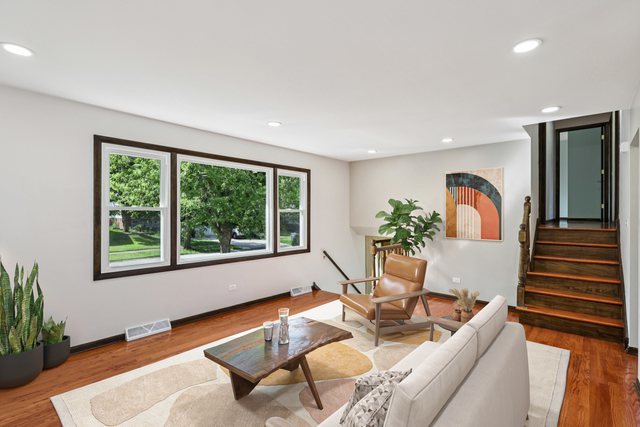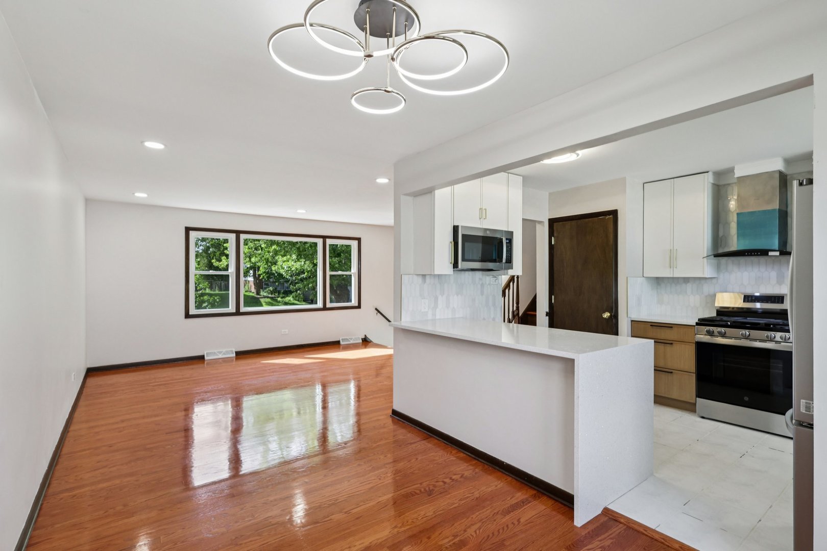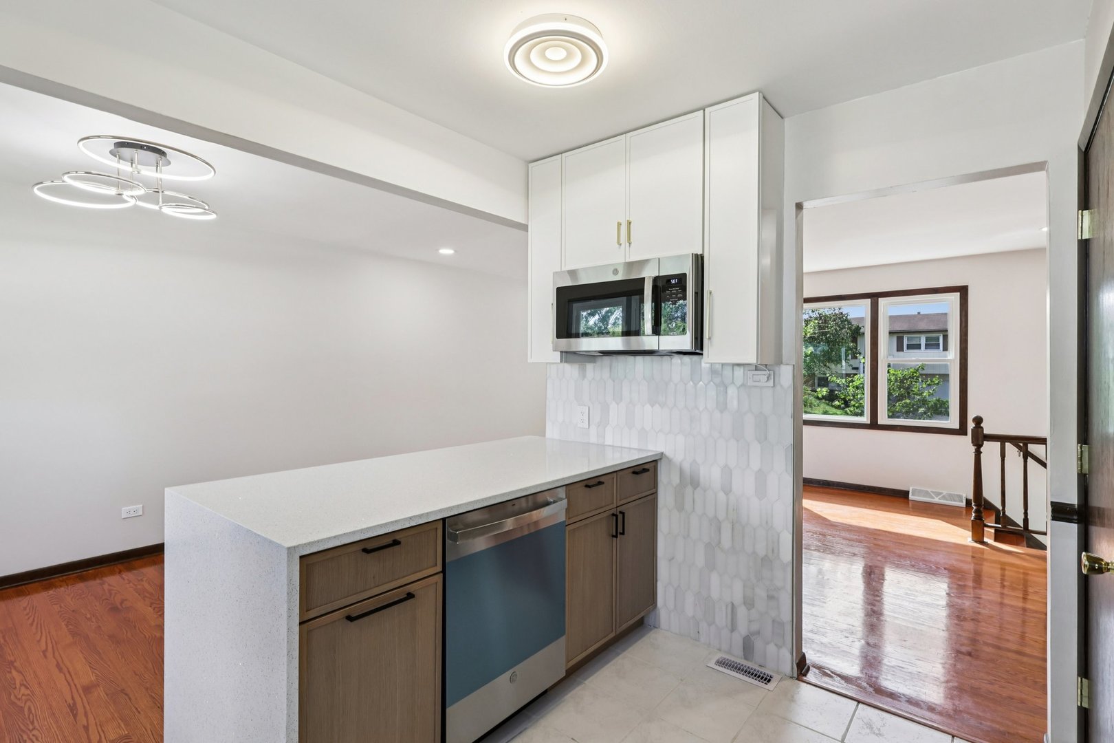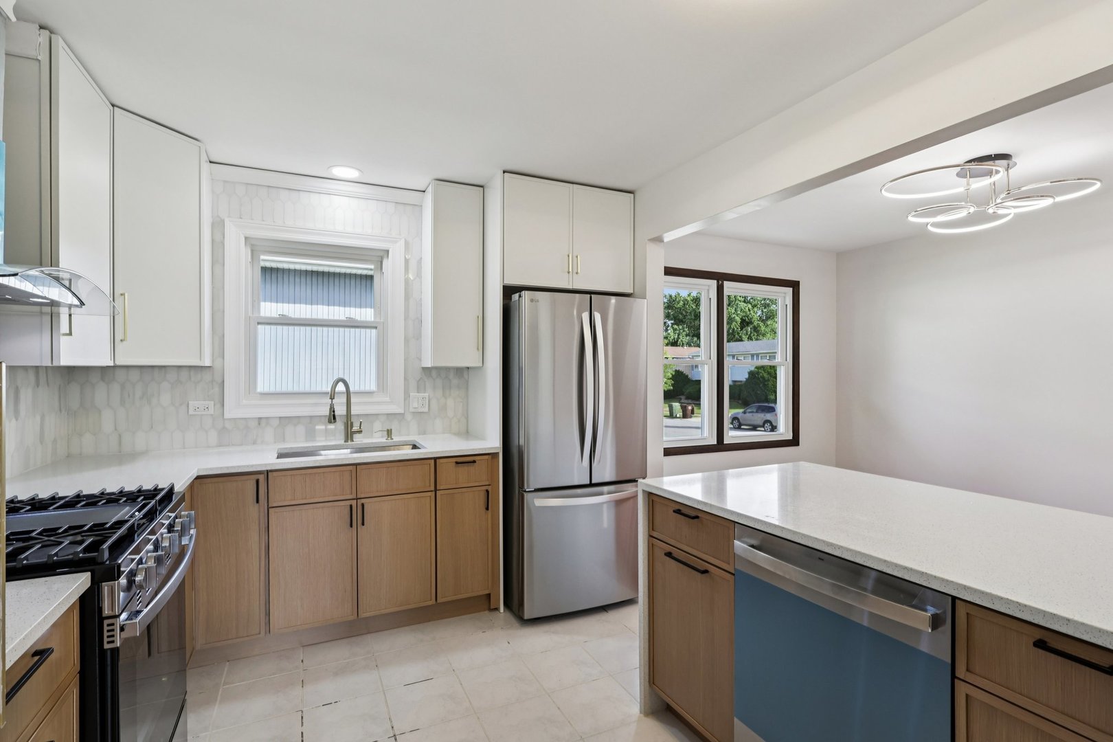 Move right in and enjoy this beautifully updated home in school district 230 just blocks away from Veteren’s Park. Welcome to the all new kitchen cabinets, stainless steel appliances with a quartz waterfall on the peninsula. The bathrooms have new vanities, mirrors and modern lighting. Everyone’s favorite, the hardwood floors have all been refinished and there is new luxury vinyl plank flooring in the lowest level. New lights on every level. Plus you have all new windows (2025) to enjoy the view of your yard and neighborhood. This smart renovation didn’t stop inside. In this home, enjoy the security of knowing you have all new roof,gutters, soffit, facia, and a restored garage with a new roof, door and openers. This house blends curb appeal with peace of mind. It is ready to move in and make it your Home!