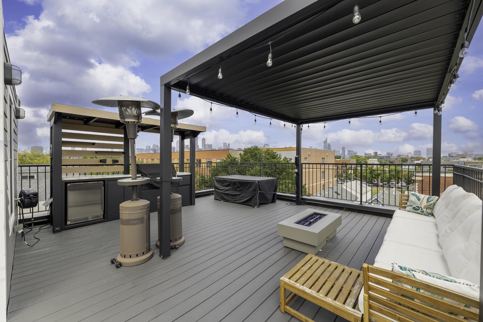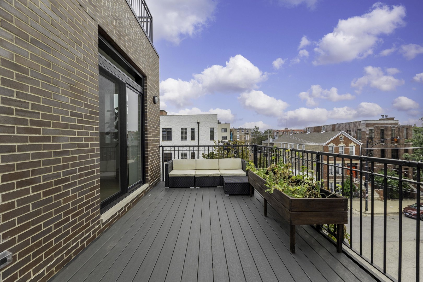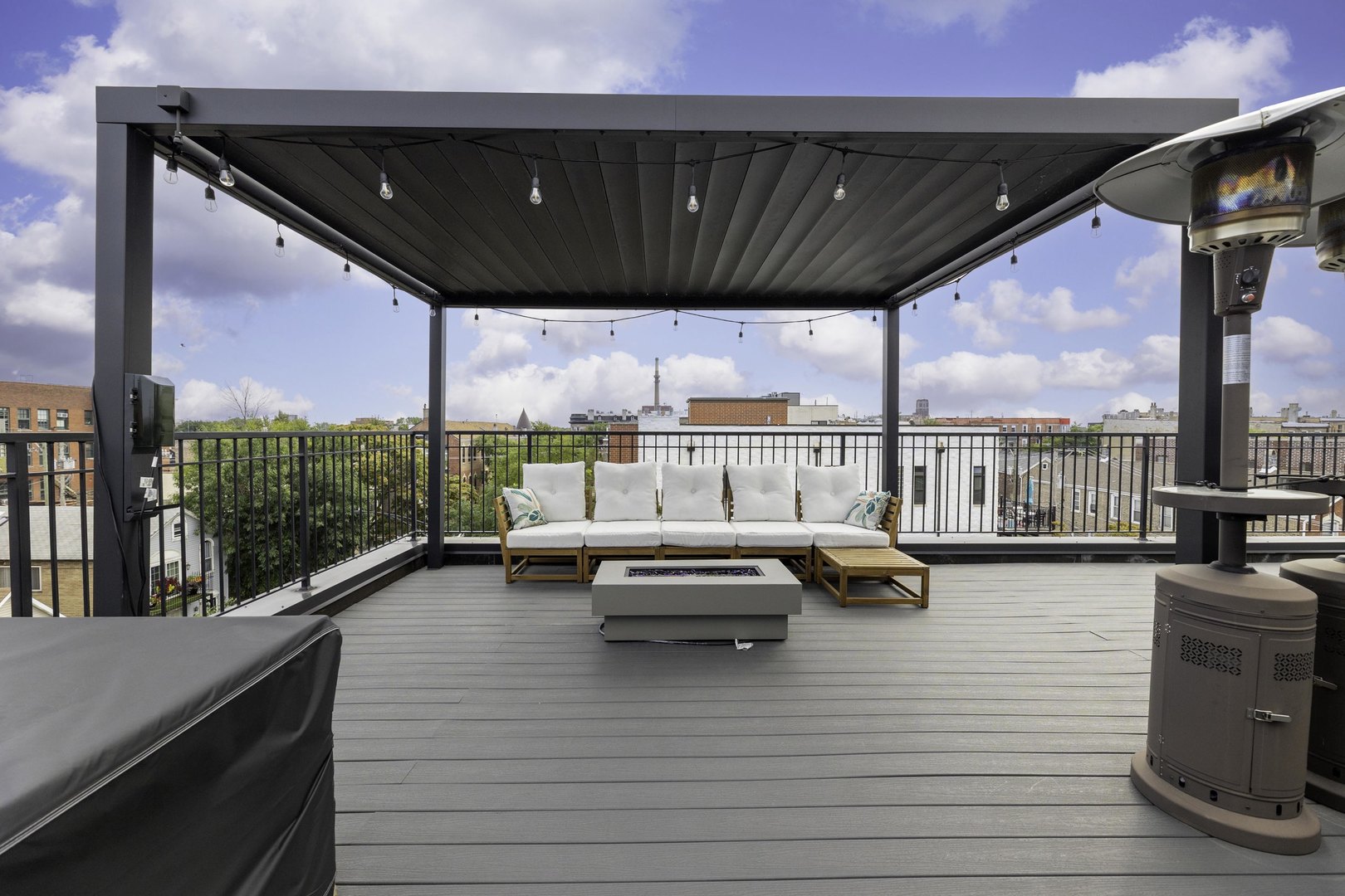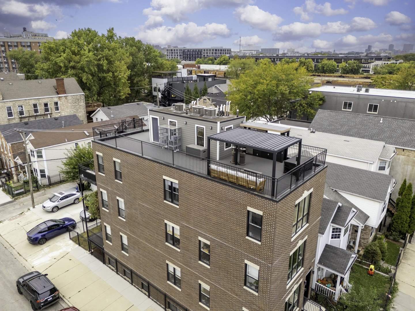 Welcome to this stunning 2-bedroom, 2-bath penthouse in the heart of Pilsen! Built in 2023, this modern home is flooded with natural light from windows throughout and offers a bright, airy open floor plan with tall ceilings. The sleek kitchen boasts flat-panel cabinetry, quartz countertops, a full backsplash, and premium LG appliances. The spacious primary suite includes dual walk-in closets and a luxurious bath with dual vanity and separate shower. Additional features include in-unit laundry, carport parking with EV charging capability, and both a large rear deck and a private rooftop deck. The rooftop is an entertainer’s dream, equipped with a Fusion Flame outdoor kitchen, steel louvered pergola, and panoramic city views. Perfectly situated on a corner building, just steps from the vibrant dining, cafes, and shops of 18th Street, as well as the Pink Line and the National Museum of Mexican Art. A truly modern and bright home in one of Chicago’s most dynamic neighborhoods!