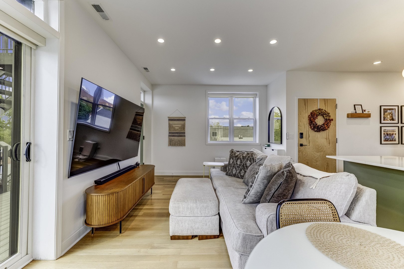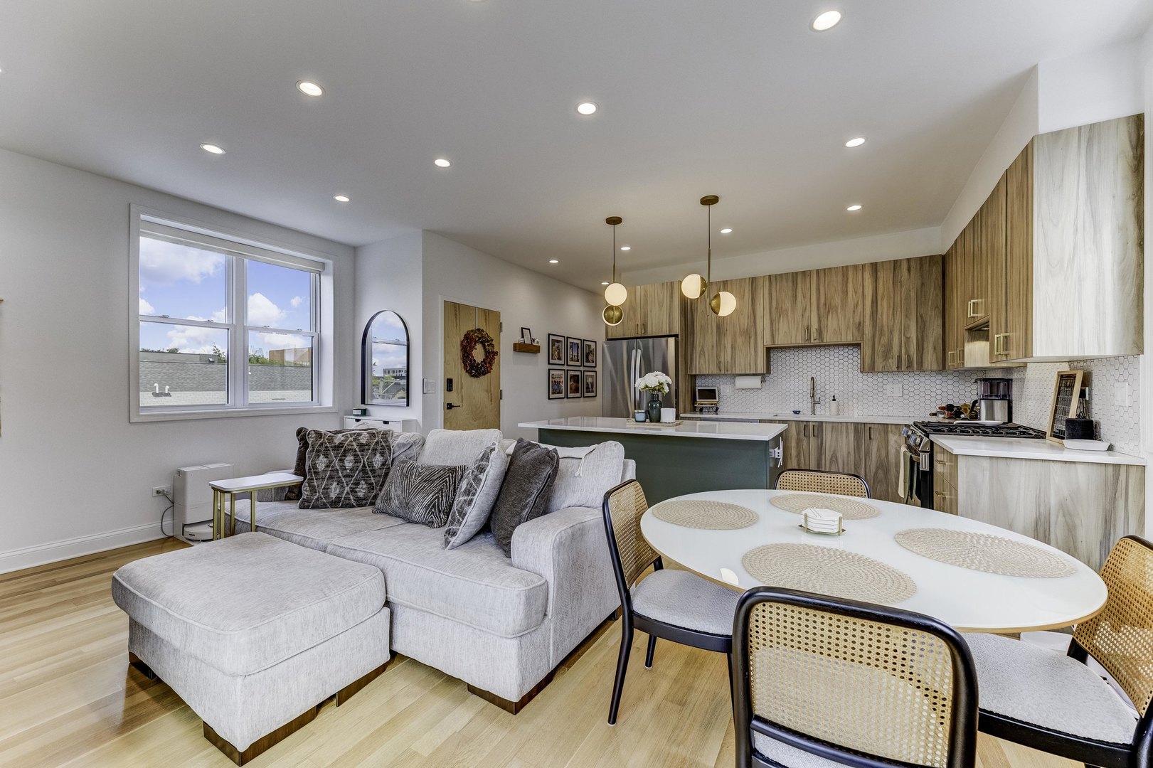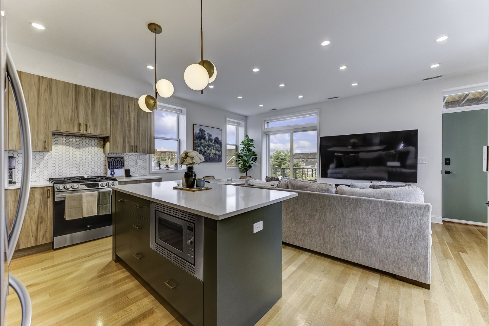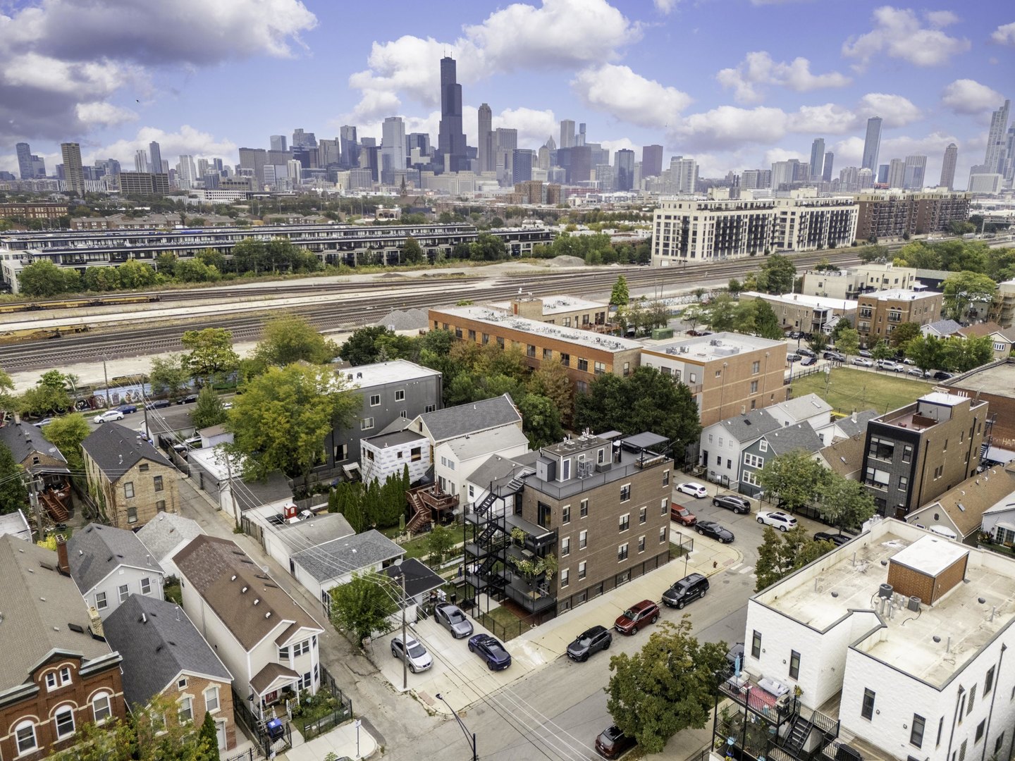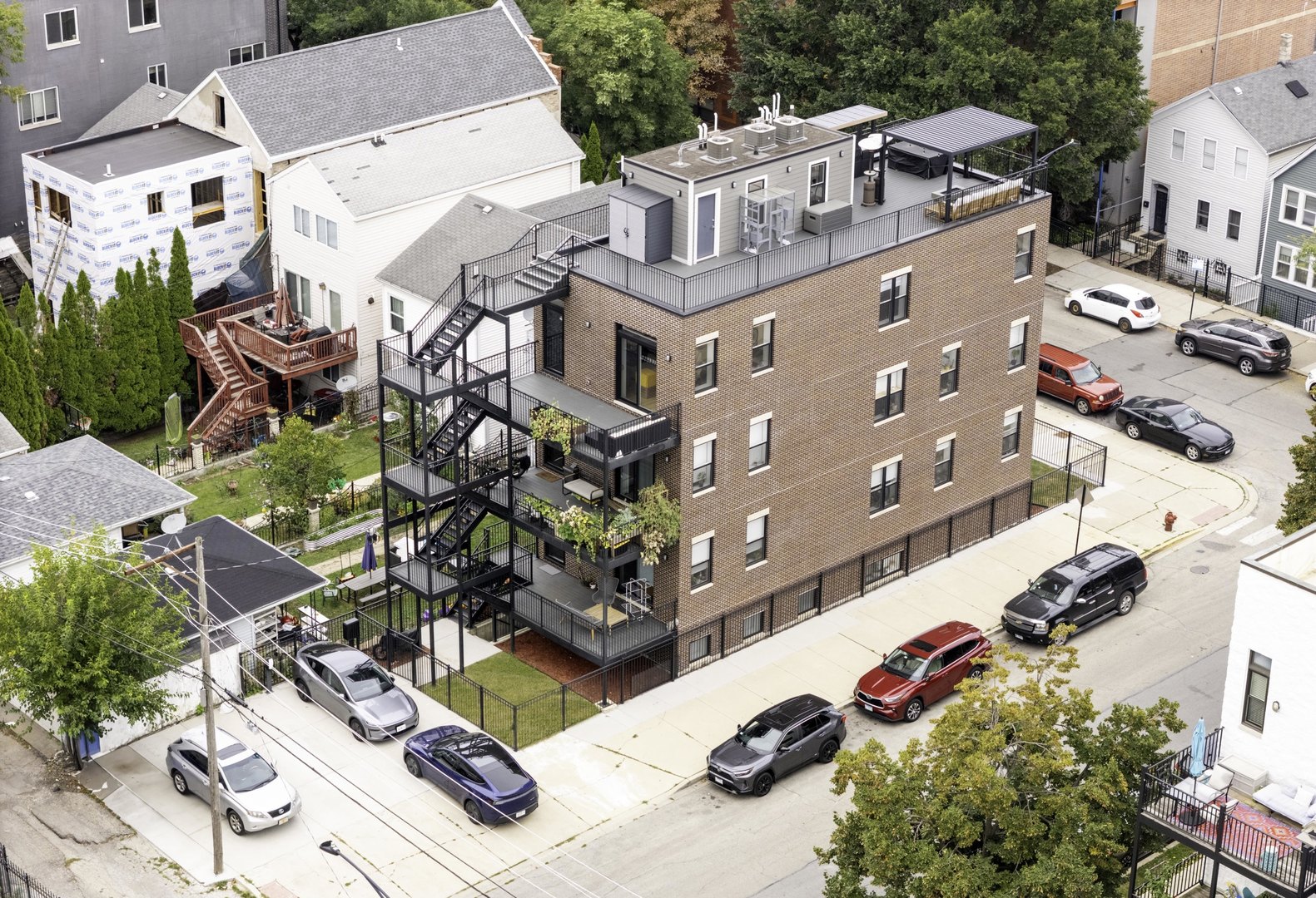 Welcome to this stunning 2-bedroom, 2-bath penthouse in the heart of Pilsen! Built in 2023, this modern home is flooded with natural light from windows throughout and offers a bright, airy open floor plan with tall ceilings. The sleek kitchen boasts flat-panel cabinetry, quartz countertops, a full backsplash, and premium LG appliances. The spacious primary suite includes dual walk-in closets and a luxurious bath with dual vanity and separate shower. Additional features include in-unit laundry, carport parking with EV charging capability, and both a large rear deck and a private rooftop deck. The rooftop is an entertainer’s dream, equipped with a Fusion Flame outdoor kitchen, steel louvered pergola, and panoramic city views. Perfectly situated on a corner building, just steps from the vibrant dining, cafes, and shops of 18th Street, as well as the Pink Line and the National Museum of Mexican Art. A truly modern and bright home in one of Chicago’s most dynamic neighborhoods!