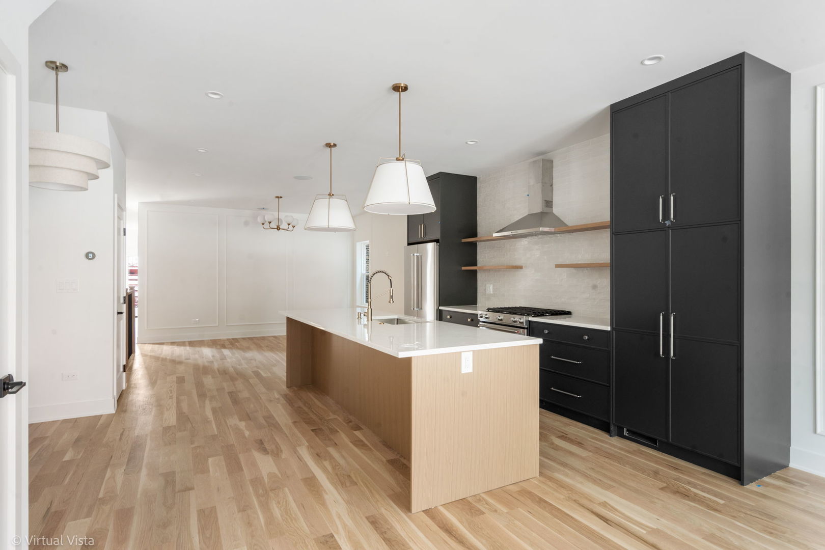 Luxurious and massive NEW CONSTRUCTION 4BD/3.1BA DUPLEX DOWN by a renowned luxury builder-delivering ~2,200 square feet of single-family scale living with 2 private outdoor spaces in a boutique three-unit building in prime Pilsen. This home perfectly balances urban convenience and tranquil residential living. Tucked on a quiet, tree-lined street, yet steps from the vibrant 18th Street corridor, you’ll enjoy award-winning restaurants, nightlife, galleries, and concerts at your doorstep. Excellent location that’s close to everything – Damen and 18th Pink Line stops, Western Metra stop, Expressway, Lakefront, Harrison Park, and more. Set within a striking masonry and Hardie exterior, this home lives like a single-family residence. The main level showcases oversized windows, 9′ ceilings, and a chef’s kitchen equipped with custom cabinetry, high-end quartz countertops, a 10-foot island, premium KitchenAid stainless steel appliances, a full-size pantry, and a breakfast nook-all anchored by custom millwork that flows into the spacious living and dining areas, making it perfect for entertaining. The rear of the main floor has a bedroom + full bathroom, powder room, an XL coat closet, and a large tiled mudroom. Wide-plank white oak flooring runs throughout, enhancing the clean, modern aesthetic. On the lower level, the large, serene primary suite features a spa-quality bath with an oversized walk-in shower, a 9-foot double vanity with white oak cabinetry, and an enormous walk-in closet. Two additional bedrooms on the lower level provide versatile options for family, guests, or a home office, while the in-unit laundry, tons of storage space, and private rear deck add convenience to everyday living. Smart thermostat, keyless entry, and one dedicated parking space included. With exceptional scale, refined finishes, and a prime location near transit and culture, this one-of-a-kind home presents a rare opportunity in one of Chicago’s most vibrant neighborhoods.