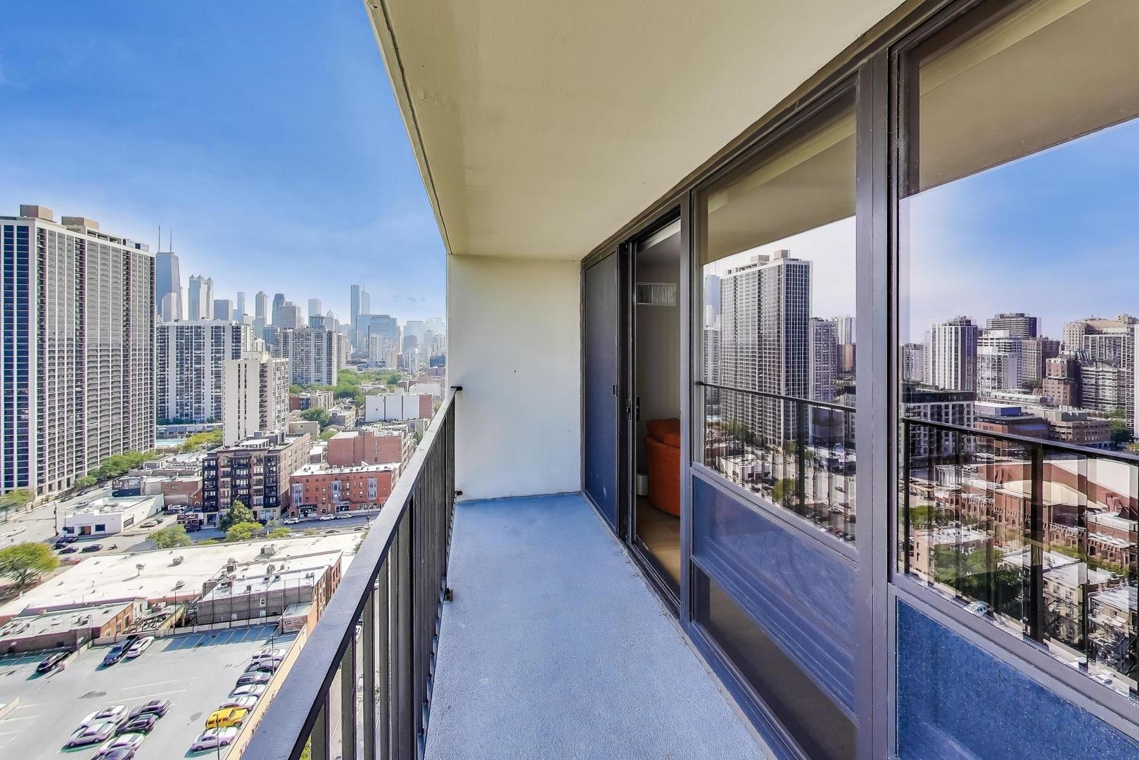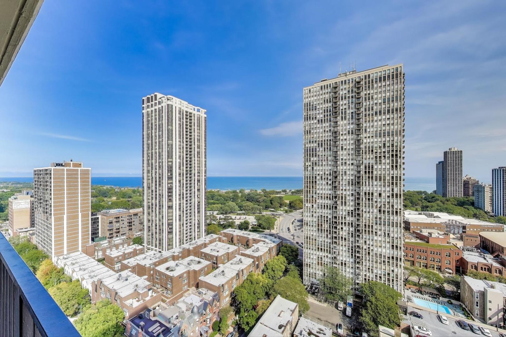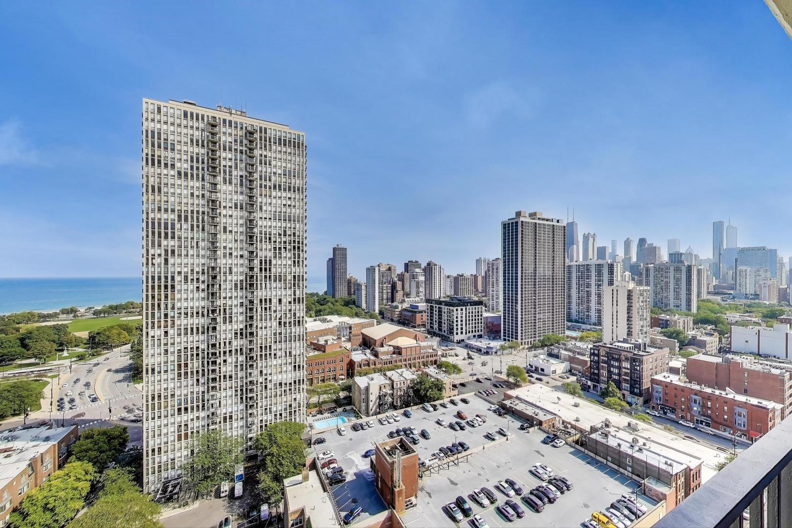 Recently updated and perfectly located in the heart of Old Town! This spacious 2 bed/2 bath on a high floor offers stunning east-facing views from your large private balcony, along with dramatic west-facing city and sunset views from both bedrooms. The bright and airy living room features floor-to-ceiling windows, brand-new hardwood floors (2024), and plenty of space for a dedicated dining area. The open-concept kitchen was recently renovated with new cabinetry, granite countertops with island seating, and stainless steel Kitchenaid appliances. The primary suite includes an en suite bath, while the generously sized second bedroom is complemented by a renovated bath with walk-in shower. Excellent closet space and new window treatments throughout. Full-amenity building offers outdoor pool and sundeck, fitness center, bike room, 24-hour door staff, hospitality room, dry cleaners, plus rental storage and parking options. Assessments cover heat, A/C, cable, and internet. Incredible location where you can walk to everything-Wells Street dining, nightlife, and shopping are right outside your door. Just steps to the lakefront, Lincoln Park Zoo, Second City, Green City Market, North Avenue Beach, and public transportation!