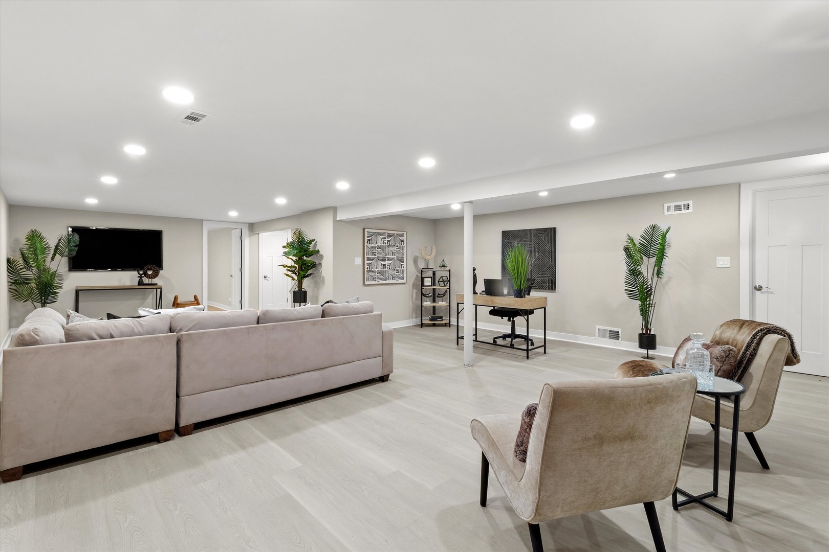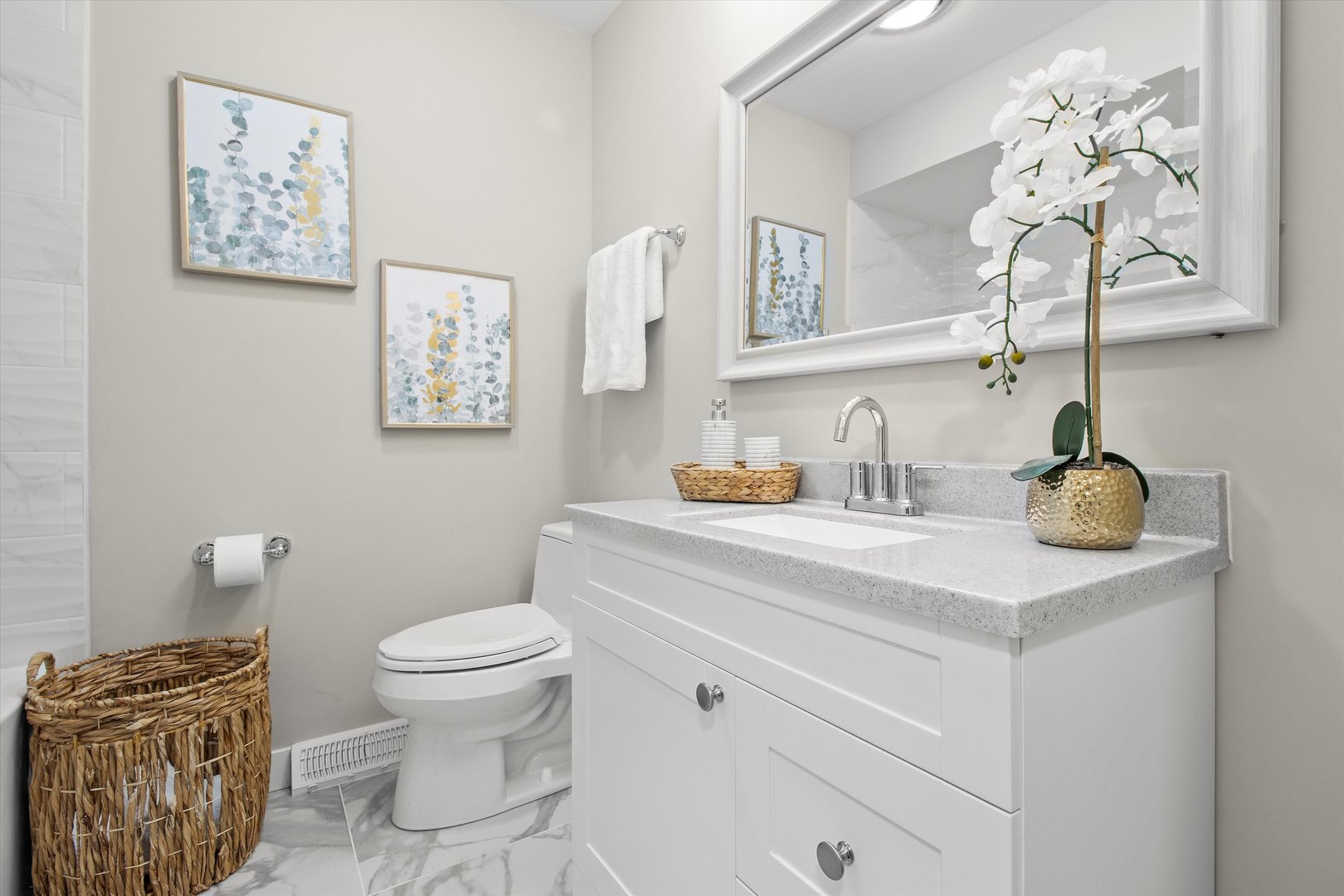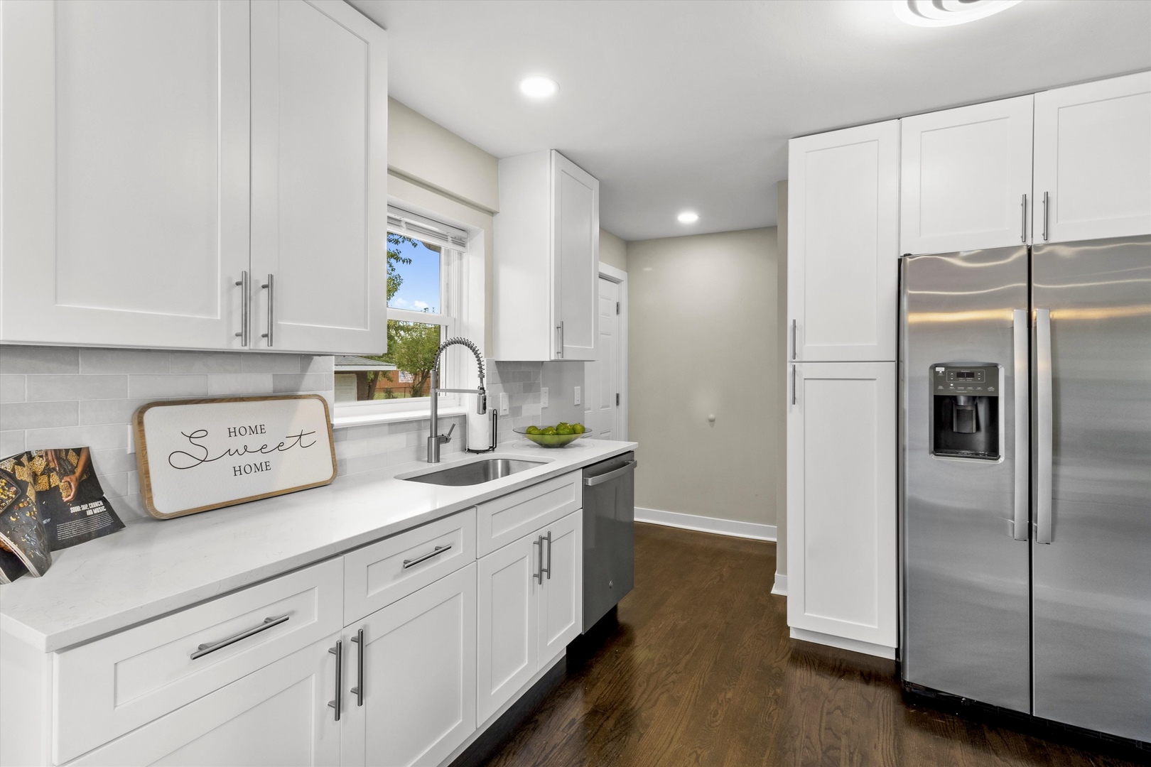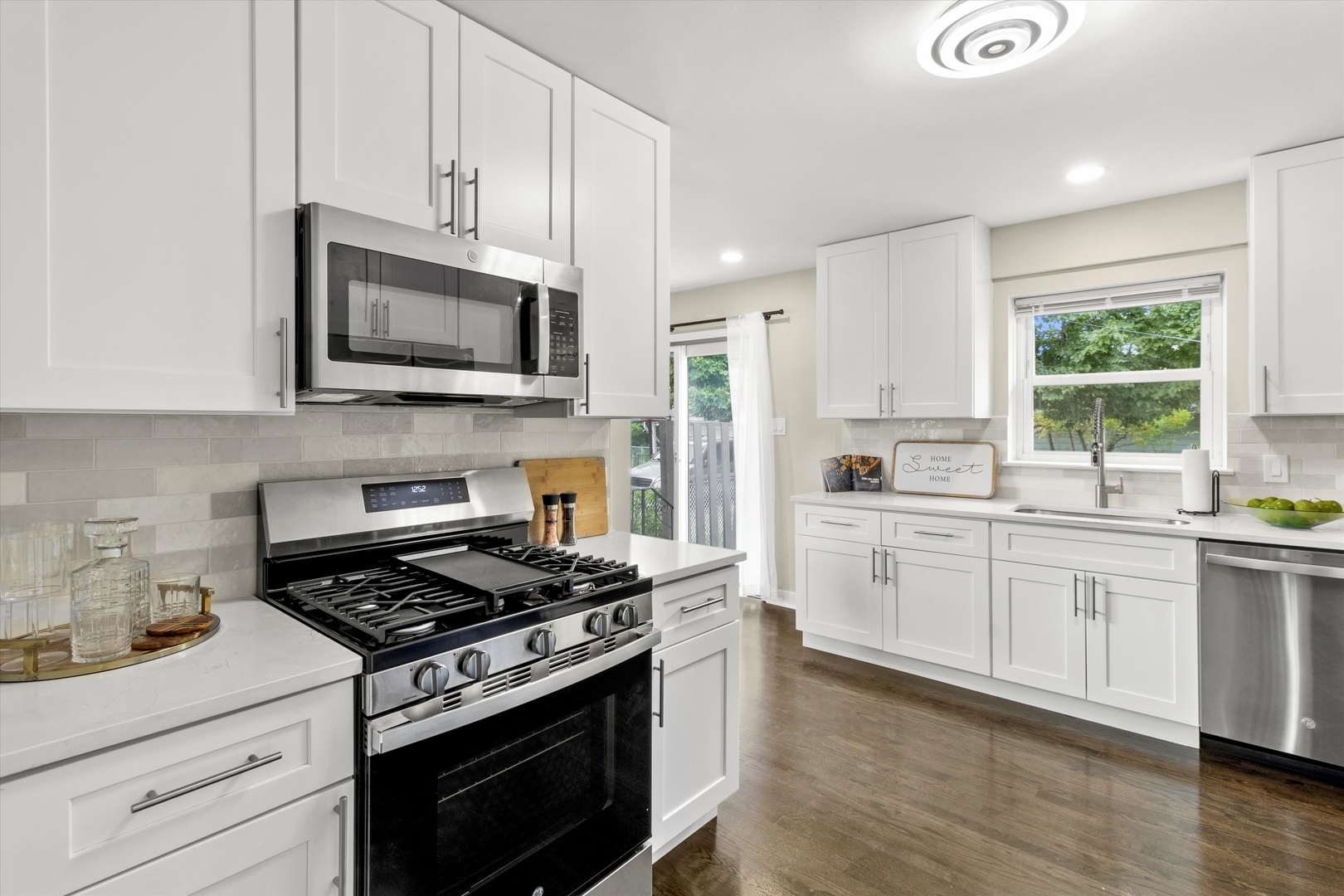 WOW! WHAT A BEAUTIFUL PLACE TO CALL HOME!! Bright and airy, open space concept that fits today’s lifestyle needs. BEAUTIFUL modern kitchen with tall shaker white cabinetry, quartz countertops and new GE stainless steel appliances. 2 GORGEOUS clean look updated bathrooms on the main floor (1 in the master bedroom) with modern tile work and Kohler fixtures. 3 bedrooms with good closet space. GLEAMING hardwood floors throughout the main level. Basement has a HUGE family room with recessed lighting, a BONUS room that can be used as a home office/kids play room/etc. Also large storage room and additional storage space in the utility/laundry area. Large deck in the rear yard that is easily accessible from the kitchen/dining room area through the large patio door. New entry doors and all interior doors and trims. New lighting fixtures. Newer roof and windows.