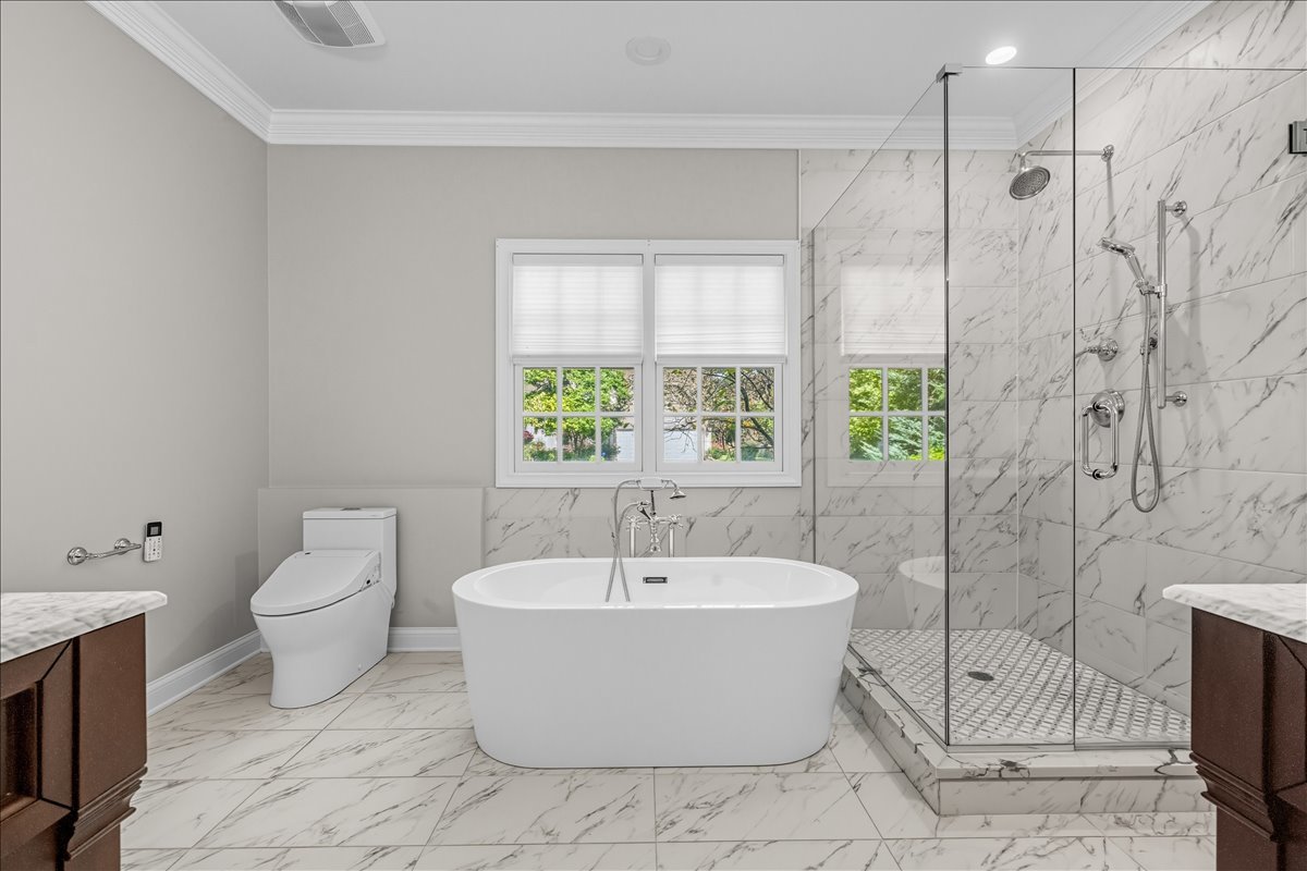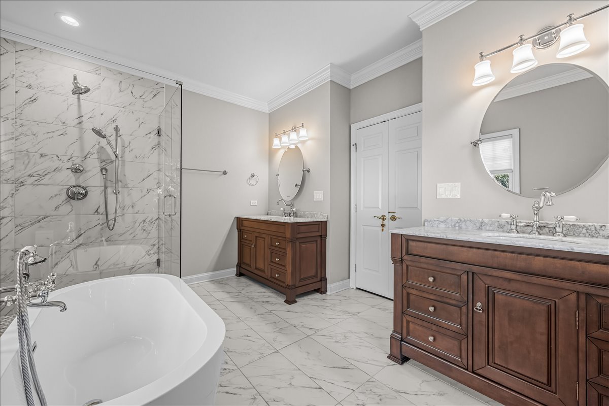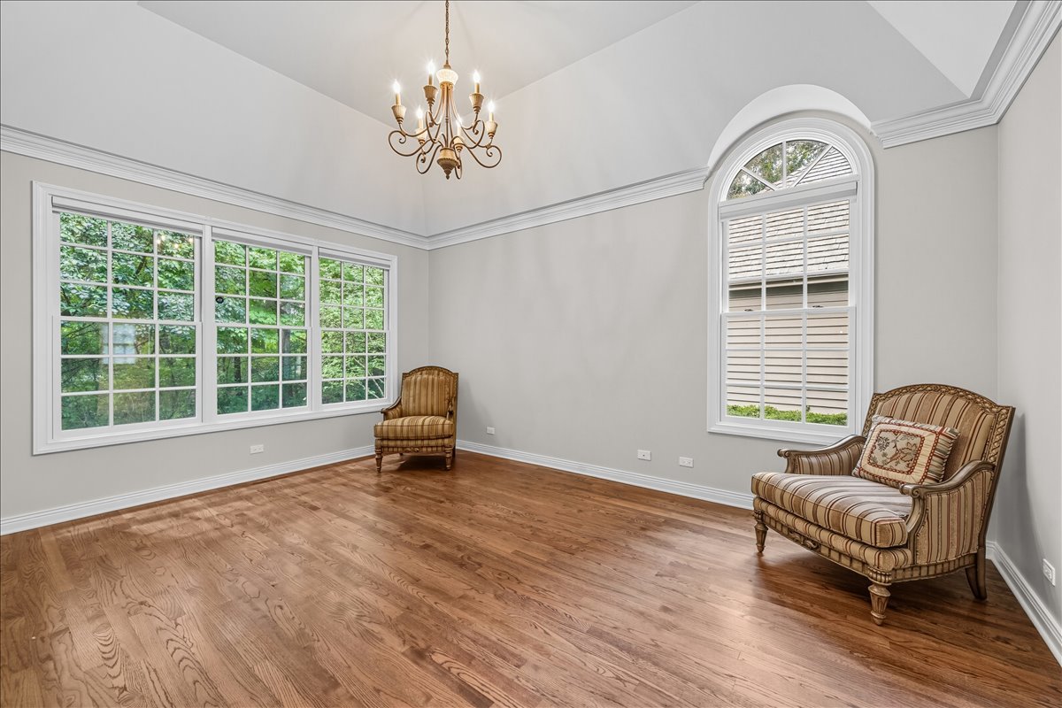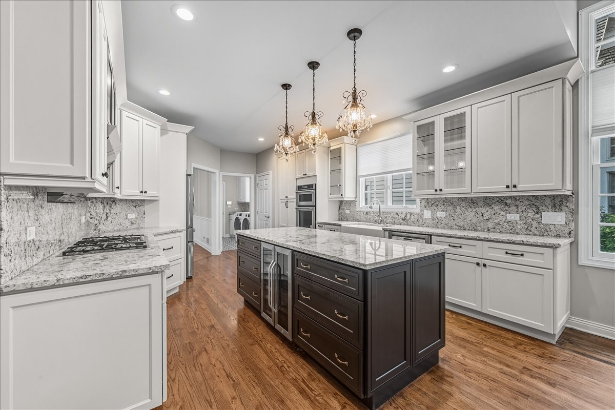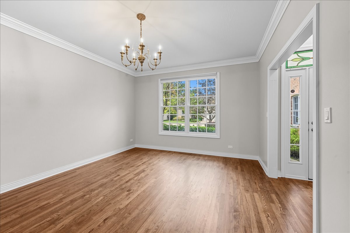 This beautifully updated home in Academy Woods – one of the subdivision’s largest models – offers a blend of thoughtful design and timeless appeal. The foyer sets the tone with hardwood floors, architectural accents, and a seamless flow that highlights the main-level primary suite and open living spaces. To one side, a dining room with detailed millwork; to the other, the living room with views of the front yard. Beyond, the den and open-concept family room amplify the sense of space and light with a vaulted ceiling, fireplace, and gallery-like overlook from the second floor. The adjacent breakfast room opens to the backyard and leads into the gourmet kitchen, equipped with a professional-grade cooktop, double ovens, an island with wine and beverage refrigeration, and abundant workspace. The main-level primary suite serves as a serene retreat with a tray ceiling, two walk-in closets, and a spa-like bath with soaking tub and separate shower. A stylish powder room and a convenient laundry/mudroom with direct garage access complete the first floor. Upstairs, three additional bedrooms, including a flexible room above the garage, are joined by a loft and an updated full bath. Hardwood floors continue on this level, and an oversized carpeted walk-in closet offers excellent storage. The finished lower level expands the home’s versatility with theater and recreation areas, a wet bar with a second beverage refrigerator, and a luxurious full bath. Outside, a paver patio overlooks mature wooded grounds, offering privacy and a peaceful backdrop. With its proximity to the Middle Fork Savanna and meticulous maintenance throughout, this residence delivers exceptional, maintenance-free living.