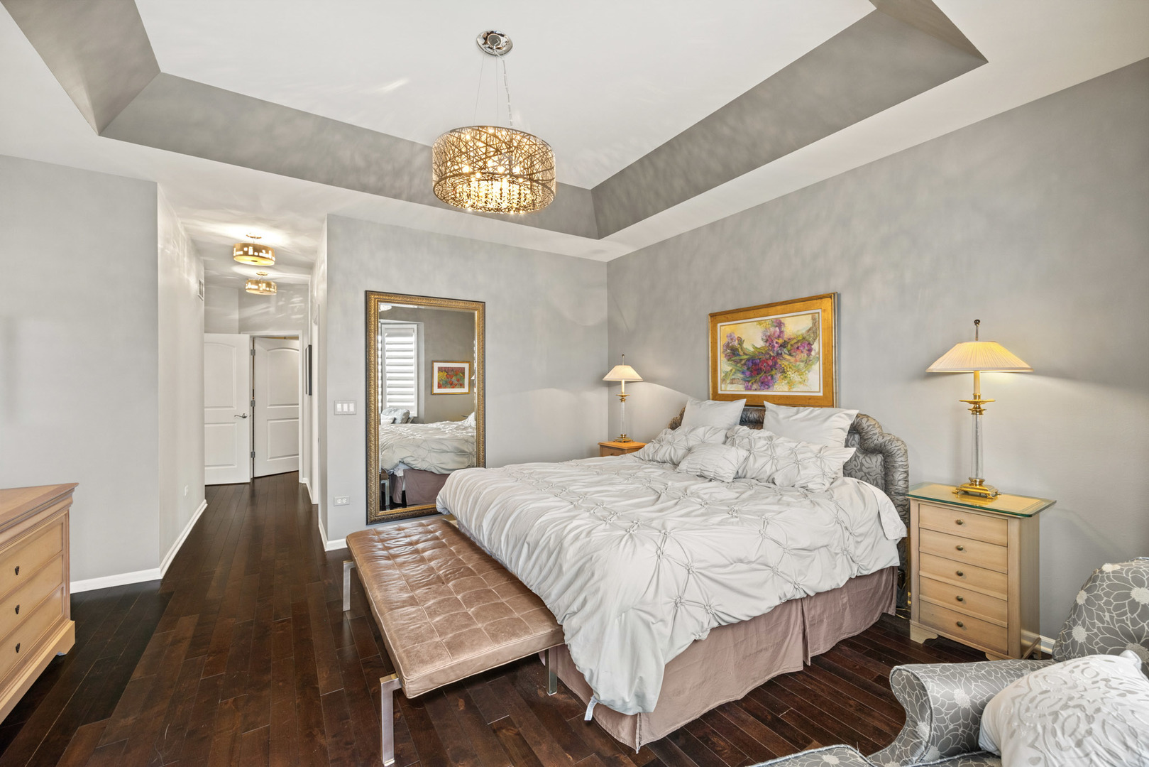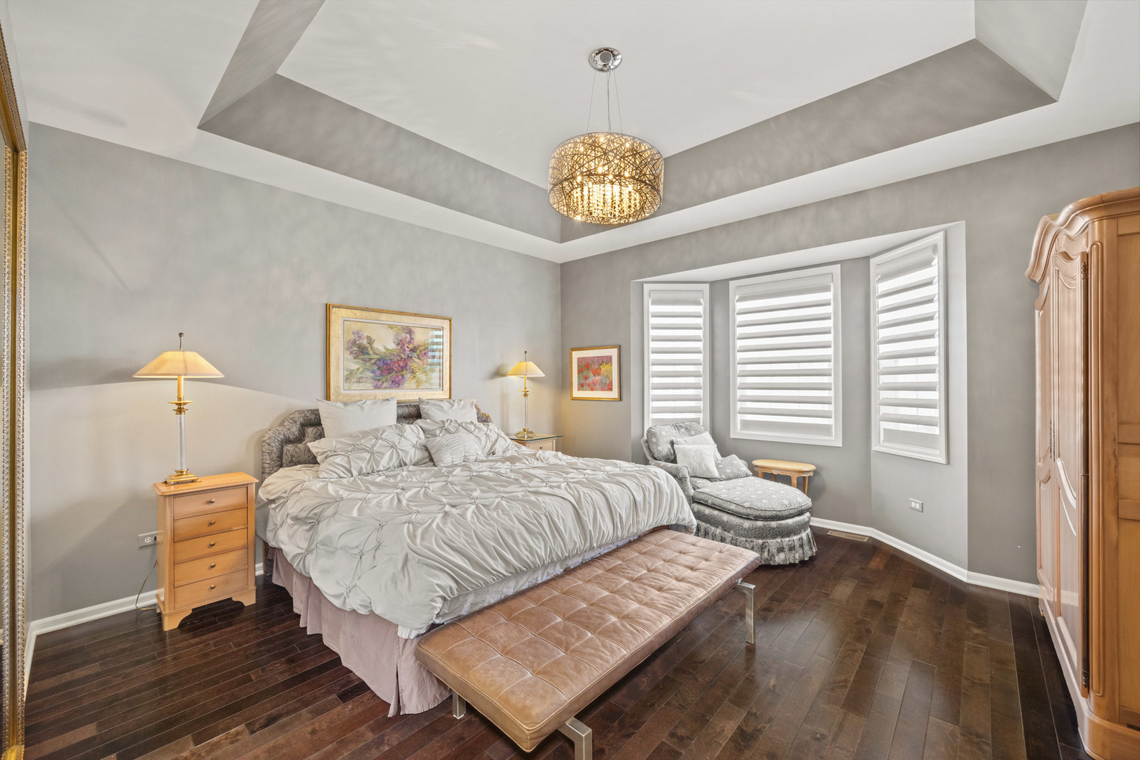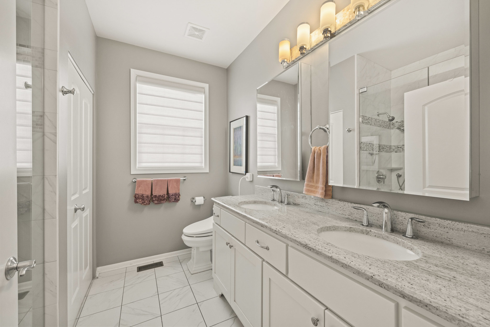 Prepared to be wowed at this epitome of move-in ready ranch home in Lockport’s Lago Vista 55+ community. Late owner was an interior designer and spared no expense when it came to upgrades. This Del Ray model, the largest within Lago Vista, is around 2100 square feet and has a full, finished basement – PERFECT for out of town guests visiting or related living. Main level features 9 foot ceilings and beautiful hardwood floors throughout, except for the kitchen which has decorative tile. Separate dining room with built-ins and gorgeous multi-pendant light fixture. Kitchen has huge island, top of the line Bosch/Kitchenaid appliances, custom cabinetry, dry bar with ample pantry space (including pull out cabinet drawers), and separate serving buffet. This house was designed well with bedrooms separated from each other allowing guests added privacy. Master bedroom has tray ceiling, walk-in closet, stunning bathroom with stand-up shower and double bowl quartz vanity, and a bay window overlooking a serene pond. Guest bedroom also has a bay window and large closet. Home additionally features an office with added closet that could easily be turned into a third bedroom if desired. Main level laundry room with sink makes living here a breeze! All window treatments on main level are remote controlled Hunter Douglas blinds. Maintenance-free Trex deck was expanded, making your new house THE spot to entertain! 2 car garage has epoxy floors. While many homes in Lago Vista are short on storage, this home provides AMPLE storage for all your needs! In addition to fourteen closets throughout, the walkout basement has a massive 26×19 storage/utility room with some shelving units included. The basement is nearly the same footprint as the main level, so there’s over 3,500 square feet of space in this home! Basement features second family room, full bathroom, bedroom, and sitting area. Sliding door opens to lower-level patio, or walk back up to aforementioned deck. Reverse osmosis system, water softener, and central vac system in place! Lago Vista offers a myriad of amenities – including both indoor and outdoor pool, hot tub, exercise facility, salon, library, craft/game rooms, and community gathering rooms for various events. Start enjoying the peaceful life today!