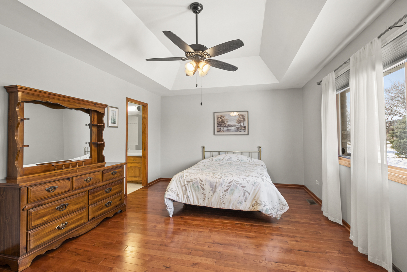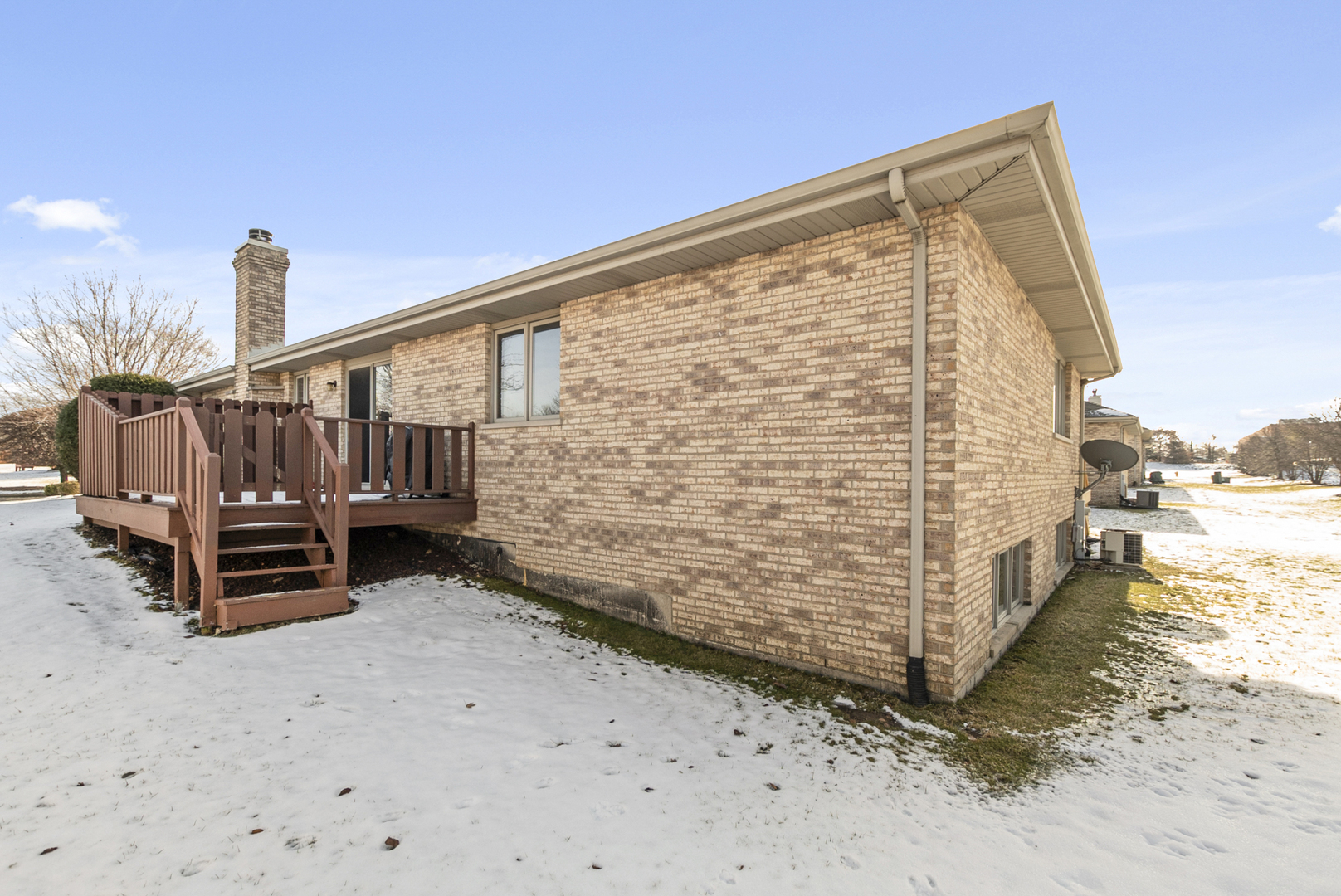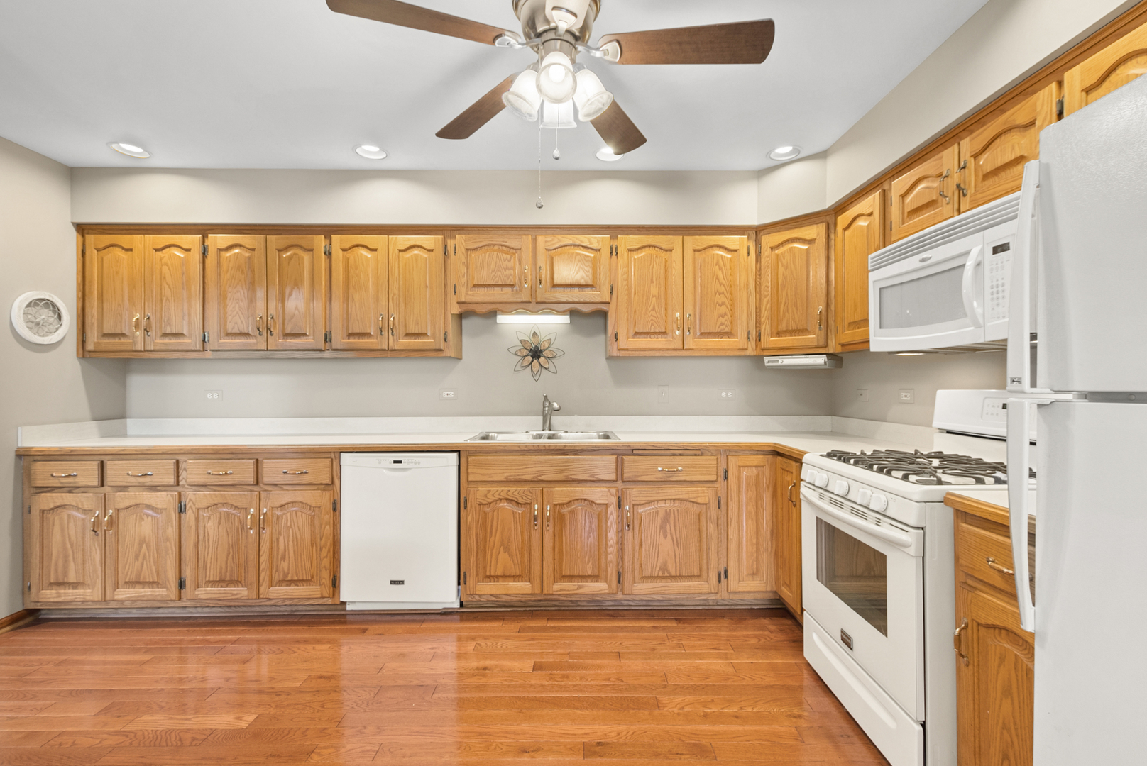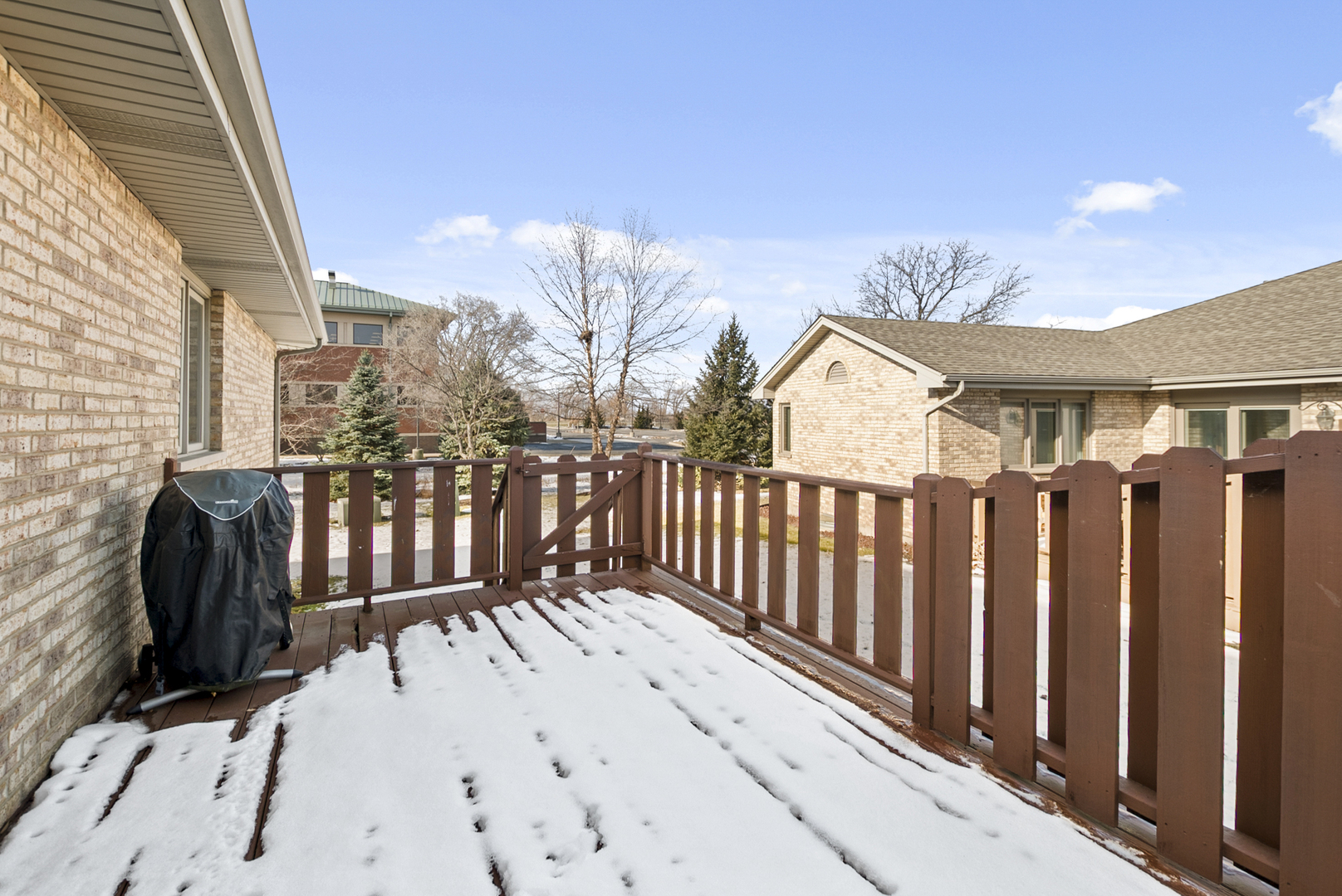 Welcome to this beautiful and rarely available end-unit ranch townhome located in the desirable Carlyle Ridge of Tinley Park! The exterior has impressive curb appeal with professional landscaping, front porch, and deck. As you enter you are greeted by the gleaming hardwood flooring that flows seamlessly across the main level and open-concept layout. Bright and sunny home with lots of windows. The large living room features soaring vaulted ceilings, 2 skylights, a gas fireplace, and a newer ceiling fan. The spacious eat-in kitchen with plenty of counter space, many solid wood cabinets, pantry closet, can lighting, ceiling fan, and overlooking the dining room. The dining room also has a sliding door with access to the private deck. Retreat to the generously sized main level primary suite, complete with a tray ceiling, large walk-in closet, and full primary bathroom that has a separate shower and tub. Nice size second bedroom with a large walk in closet and newer ceiling fan. Full hallway bathroom perfect for guests. The main floor laundry room includes the washer, new dryer, built in cabinets, utility closet, and sink. Sprawling full look-out basement perfect for storage with roughed in plumbing, and waiting for your finishing ideas. 2 car attached garage. Near shopping and dining. School districts 140 and 230. This lovely cared-for ranch townhome offers comfort, convenience, and style all in one. Don’t miss this wonderful opportunity-schedule your showing today!