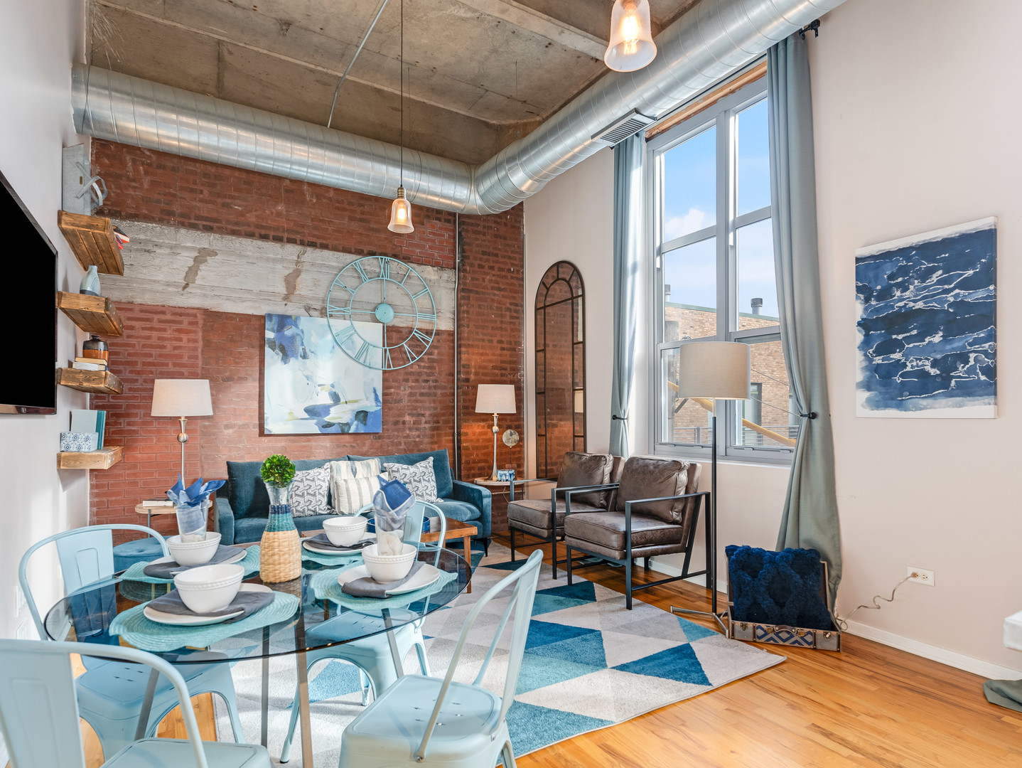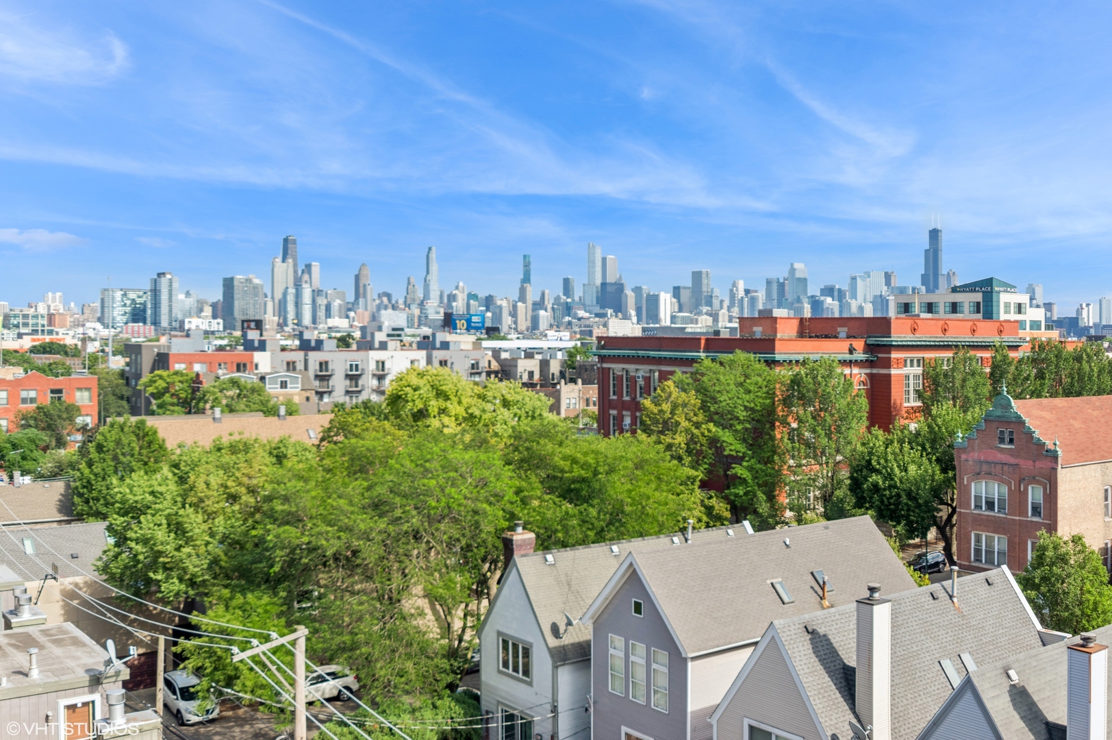 Check out this sunny end unit, with high ceilings and exposed brick in Bucktown’s highly sought over PAC Lofts. Unobstructed east windows allowing sunlight to flow into living room and kitchen. The condo features an open kitchen with stainless steel appliances, granite counters and a large moveable island. Spacious primary bedroom with a walk in closet, en-suite bathroom with double sink and separate shower and tub. Large second bedroom with ample closet space. Large windows in every room which illuminates the condo in natural light from the east and west. This elevator building has a spacious roof deck with skyline views, rec room, fitness room, court yard and lobby. Deeded parking space and storage included. Easy access to Walsh Park, the 606 Trail, CTA Blue Line, Metra, and countless restaurants, stores, and bars that Bucktown/Wicker Park have to offer. Virtual Tour Available.