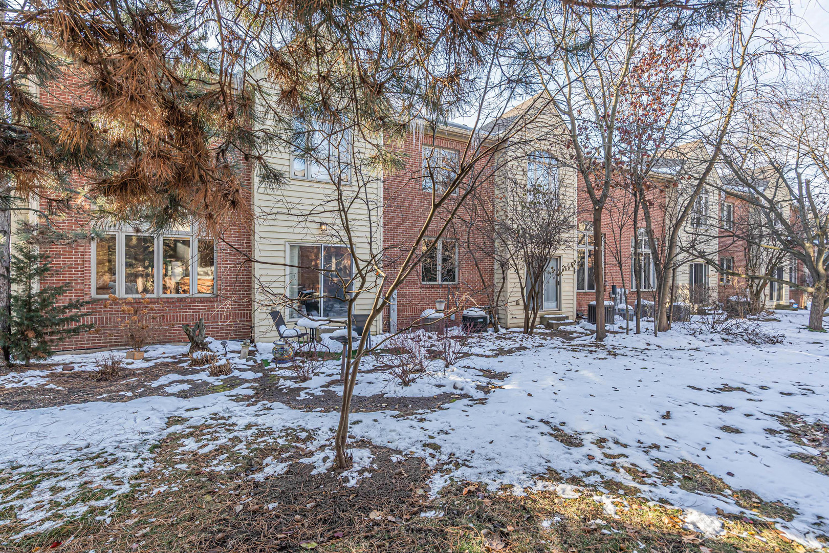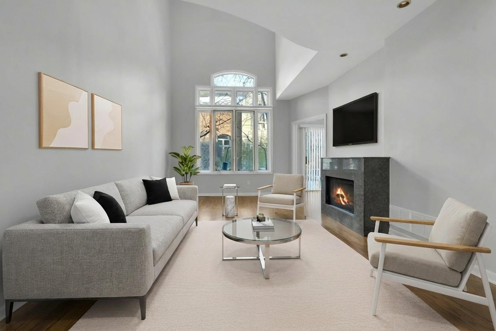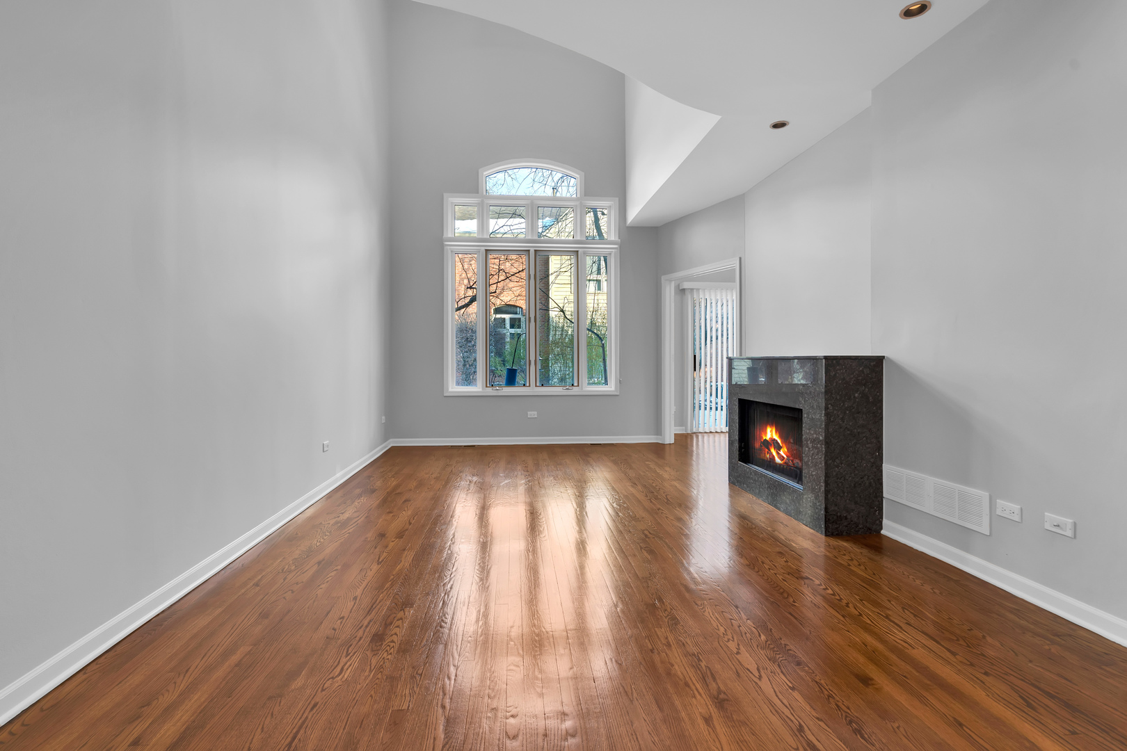 Welcome to this beautifully updated deluxe two-story townhome, ideally located in the heart of Glenview. The open-concept main level features an inviting foyer with a double guest coat closet, leading to a spacious living and dining area highlighted by dramatic 25-foot ceilings, a gas fireplace, and a stunning Palladian window that fills the home with natural light and offers a seamless connection to the outdoors. The bright, all-white kitchen is appointed with granite countertops, stainless steel appliances, abundant cabinetry with under-cabinet lighting, and a pantry. A charming breakfast area with sliding glass doors opens to a private patio, perfect for indoor-outdoor living. Gleaming hardwood floors extend throughout the main level, complemented by a versatile first-floor den or home office. The primary suite features vaulted ceilings, a walk-in closet, and a spa-inspired bath with double vanity, whirlpool tub, and separate shower. Convenient second-floor laundry adds everyday ease. The fully finished basement offers a spacious recreation or family room, a full bath with shower, and a large storage area. The entire home has been freshly painted and is truly move-in ready. Ideally located near shopping, dining, parks, The Glen, Metra, and within award-winning school districts. A pleasure to show.