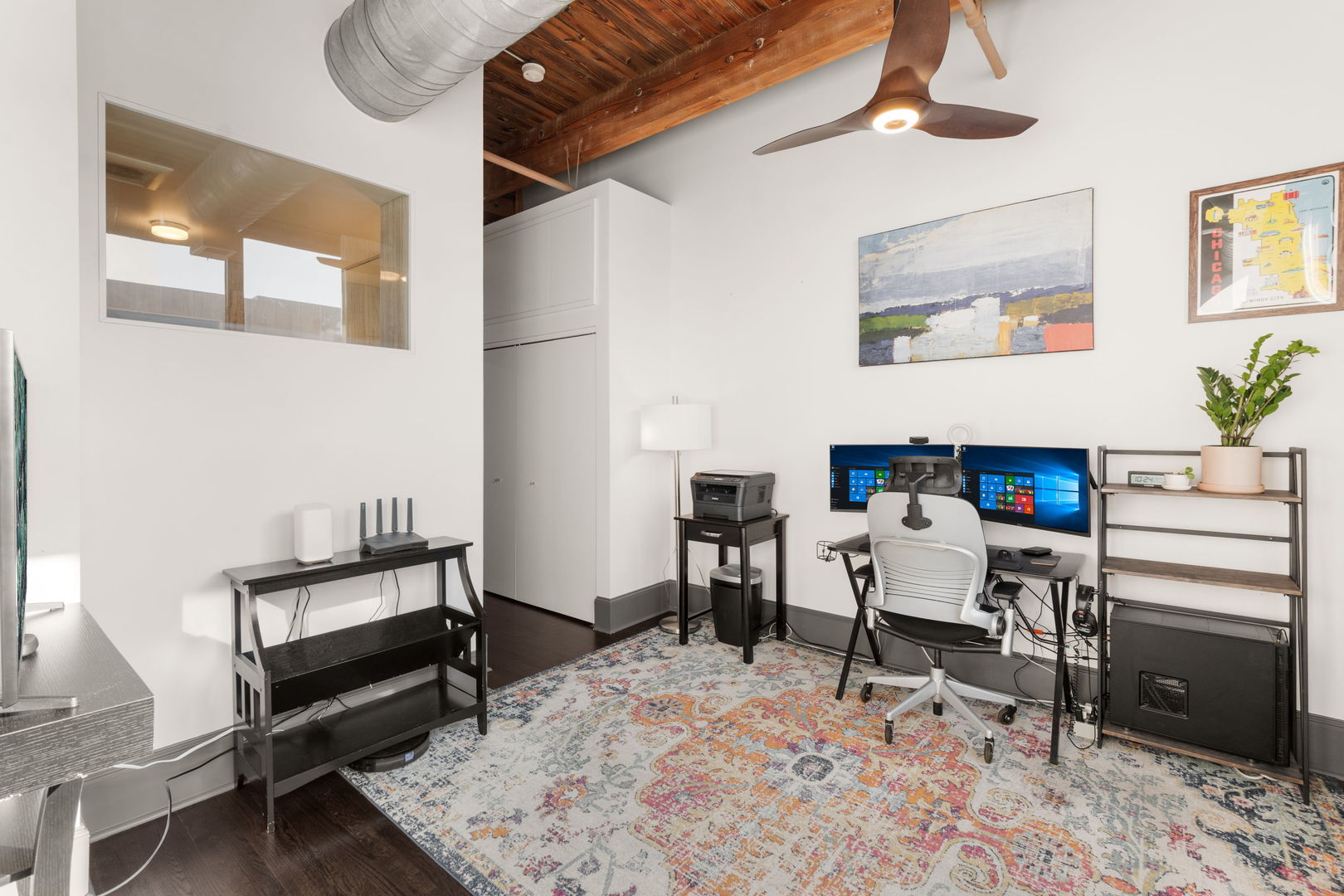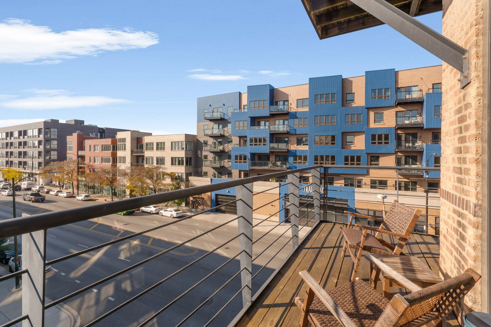 Exceptional brick-and-timber corner loft redesigned and renovated in 2018 with a custom layout and high-end finishes throughout. Sun-filled interiors feature oversized windows, hardwood floors, a fireplace with stone surround, and abundant custom storage. The eat-in kitchen offers a breakfast bar, custom cabinetry, built-in pantry, and stainless steel appliances. Enjoy a wrap-around balcony plus a common roof deck with city views. Furnace, central A/C, and front-loading washer/dryer newer from the renovation. One deeded garage parking space included. Pet-friendly building (two-pet limit); rentals permitted with board approval. Prime Bucktown location just off the 606 Trail with Wolf & Co directly across the street.