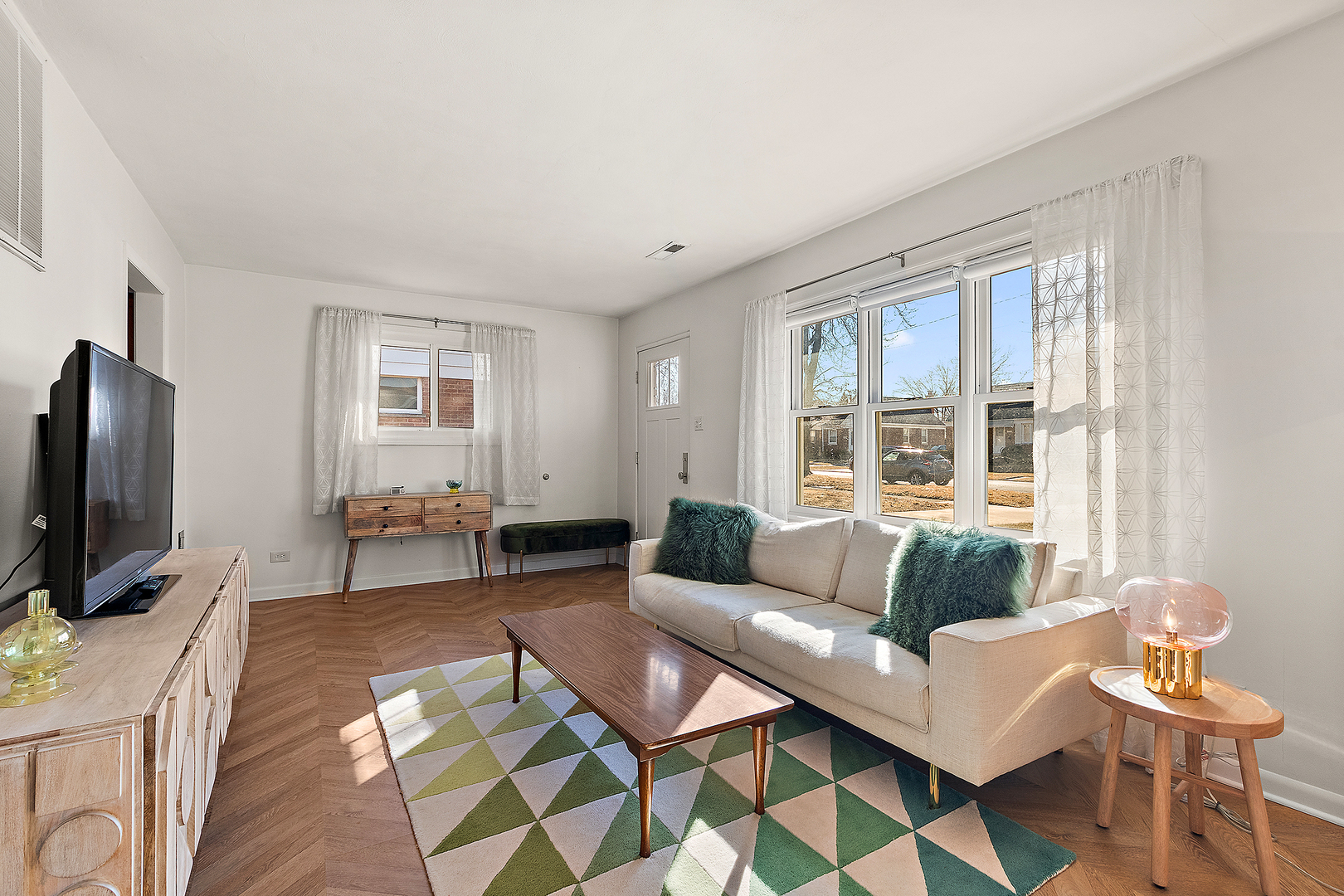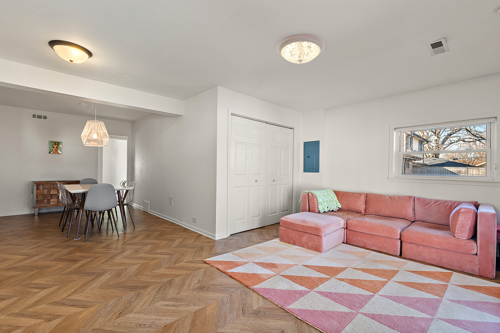 Fall in Love with This Beautifully Updated Ranch! Welcome to this impeccably rehabbed and move-in ready 2-bedroom, 1-bath ranch, where charm, comfort, and modern style come together seamlessly. From the moment you arrive, you’ll appreciate the thoughtful details, from the newer front door and fresh neutral paint to the stunning herringbone-pattern vinyl flooring that flows throughout the main living areas. Step into a bright, sunlit living room, where large windows fill the space with natural light, creating a warm and inviting atmosphere. Adjacent to the living room, the formal dining room is perfect for holiday gatherings, or hosting guests. The galley-style kitchen is both stylish and efficient, and a smart design that makes cooking and cleanup a breeze. The heart of the home is the spacious family room, ideal for relaxing or entertaining. French doors open to reveal beautiful views of the backyard, offering a versatile space for cozy movie nights or lively get-togethers. Step outside to a generously sized backyard, perfect for gardening, a play area, or simply enjoying peaceful evenings outdoors. Enjoy the convenience of a main-level laundry room, thoughtfully positioned for everyday ease.The detached 2-car garage provides plenty of room for parking and extra storage. Located on a quiet street just blocks from the park and library, and with quick access to the expressway, this home offers both tranquility and convenience. This property may qualify for up to $10,000 Homebuyer Grant that can be used to reduce the cost of your mortgage.
