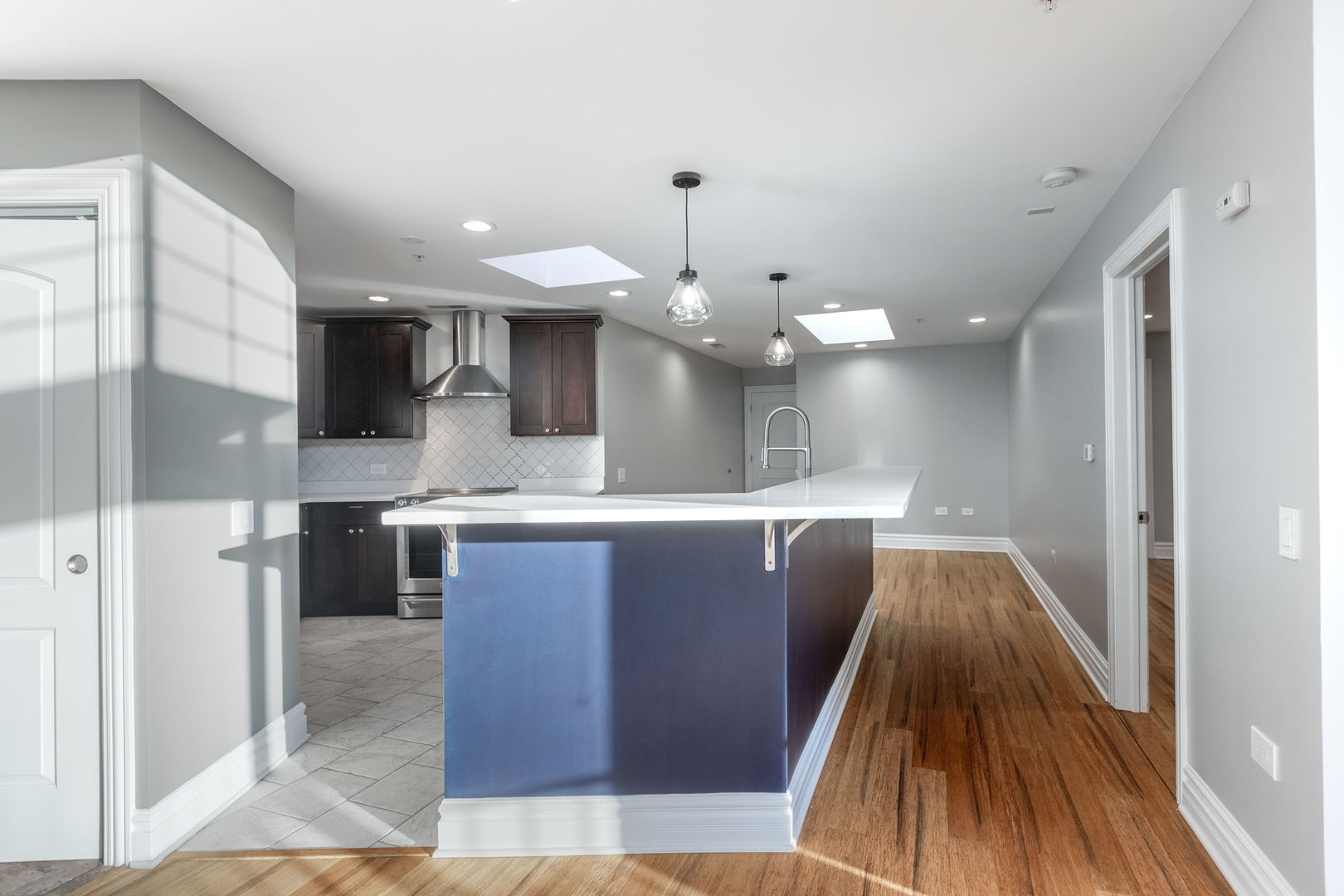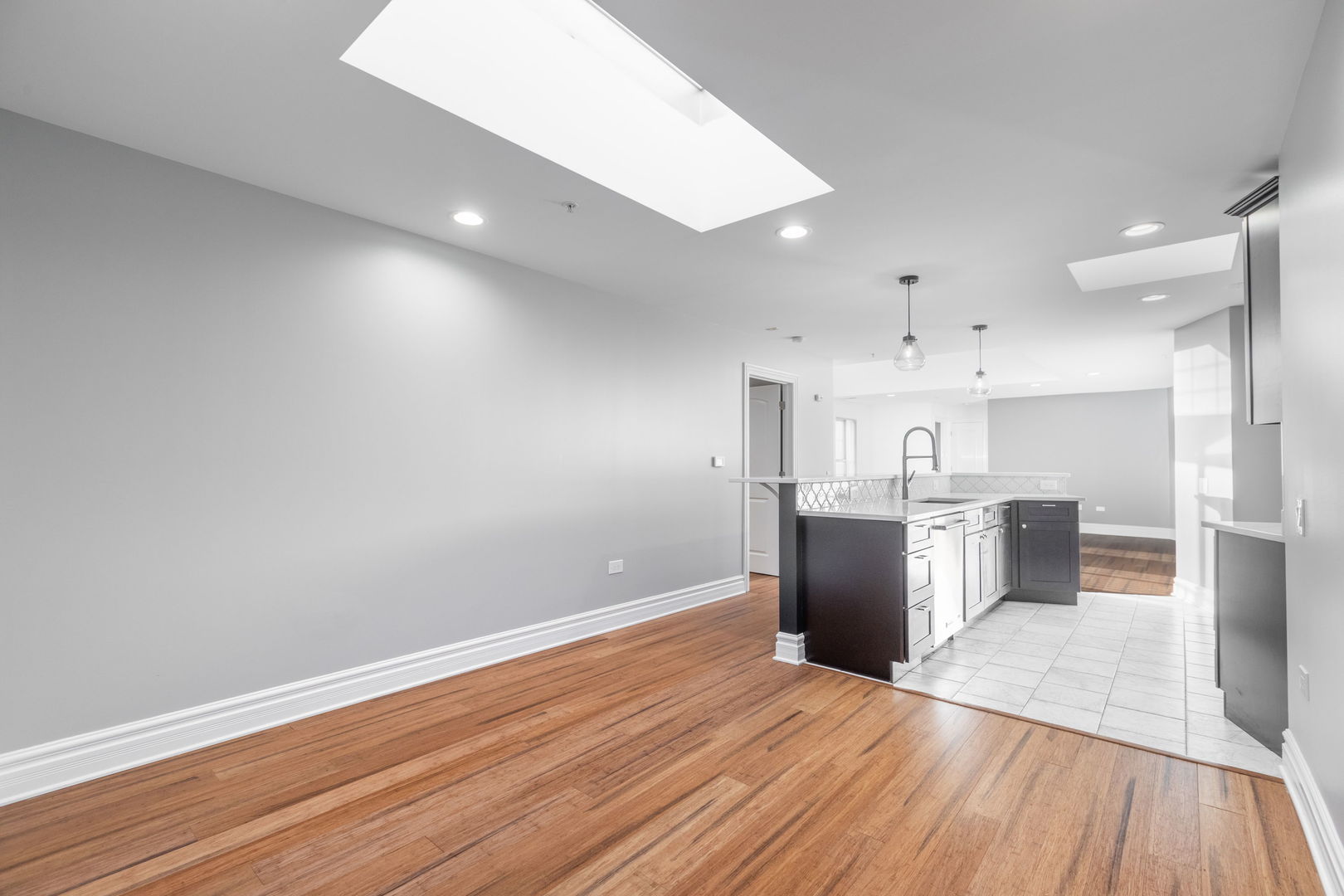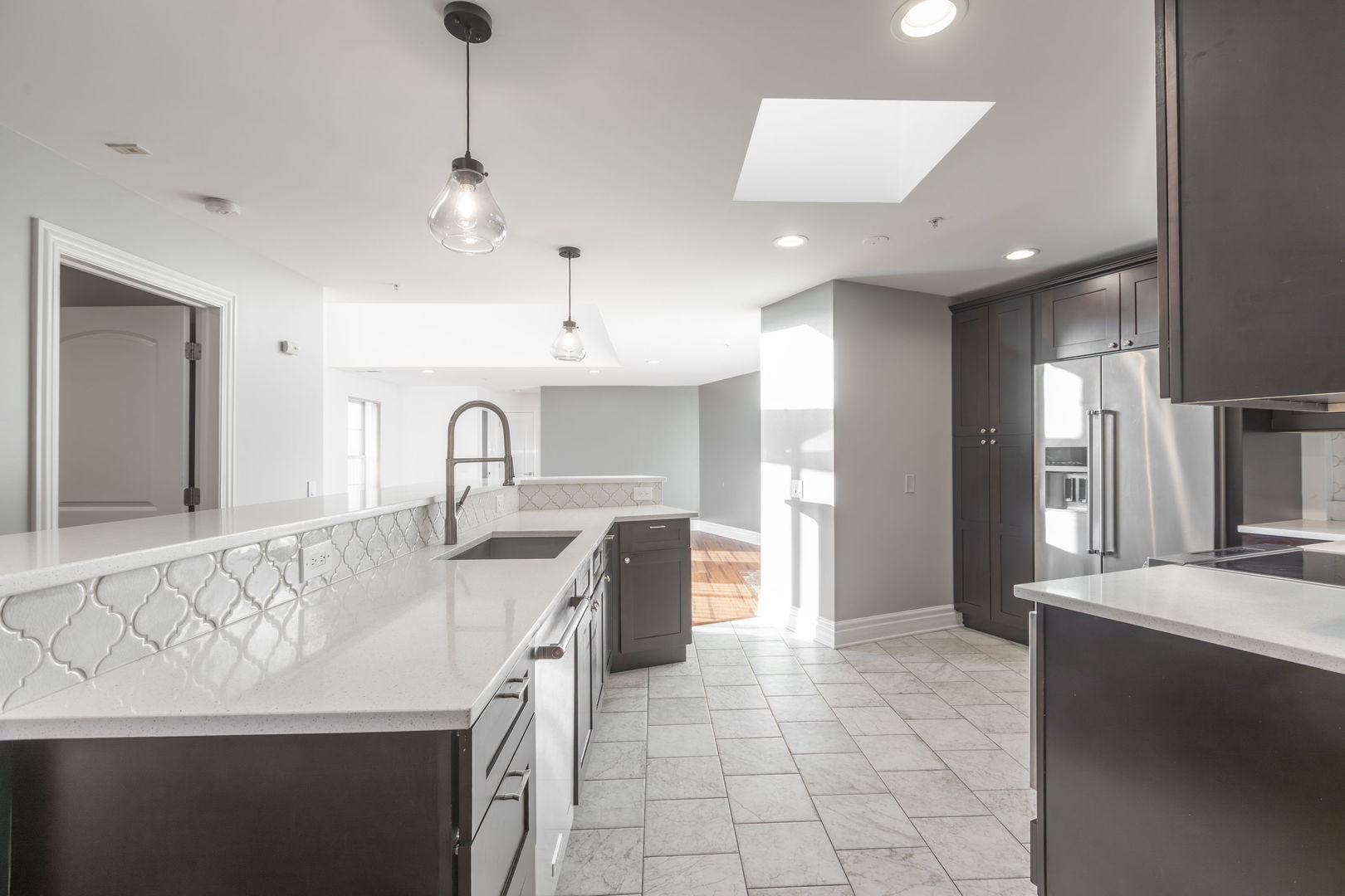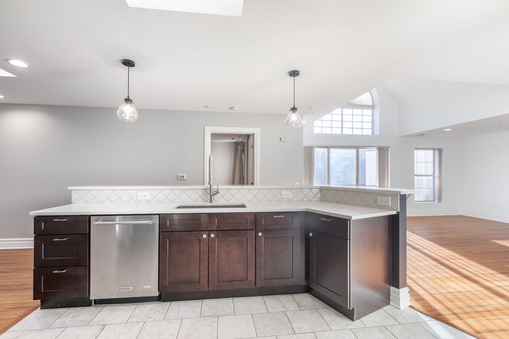 Welcome to one of the largest and most updated units in the heart of revitalized downtown Glenview-just steps from the Metra, boutique shopping, and a vibrant new restaurant scene. This stunning 2-bedroom, 2-bath condo offers an open-concept layout perfect for modern living. The beautifully renovated center kitchen features rich dark shaker cabinets, sleek quartz countertops, mosaic tile backsplash, and an oversized breakfast bar with ample seating-ideal for entertaining. The generous living room is filled with natural light and offers recessed lighting, a cozy gas fireplace, and access to a private Trex balcony. A separate dining area provides space for a full-sized table, offering flexibility for everyday living or hosting guests. The spacious primary suite includes a fully built-out walk-in closet and a stylish en-suite bathroom with a double vanity and walk-in shower. The second bedroom is perfect for guests, a home office, or both. Additional features include a large walk-in laundry room with full-size washer/dryer and storage cabinetry, a separate walk-in storage room, and two heated garage parking spots (47 & 48). Recent upgrades include a brand new building roof and new HVAC system for the unit. This move-in ready home combines size, style, and location-all within a secure, well-maintained building in one of the North Shore’s most desirable communities.