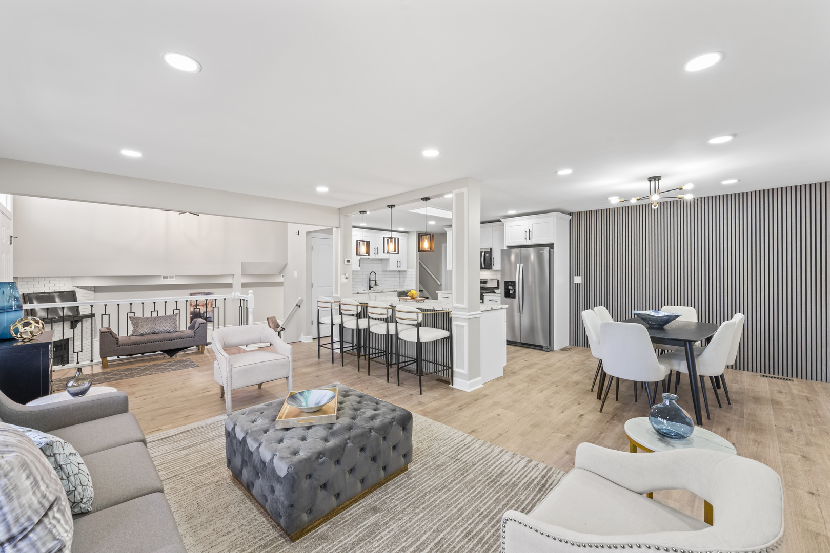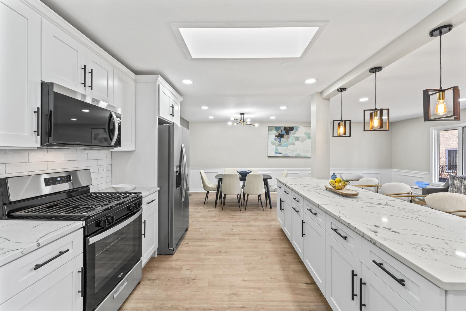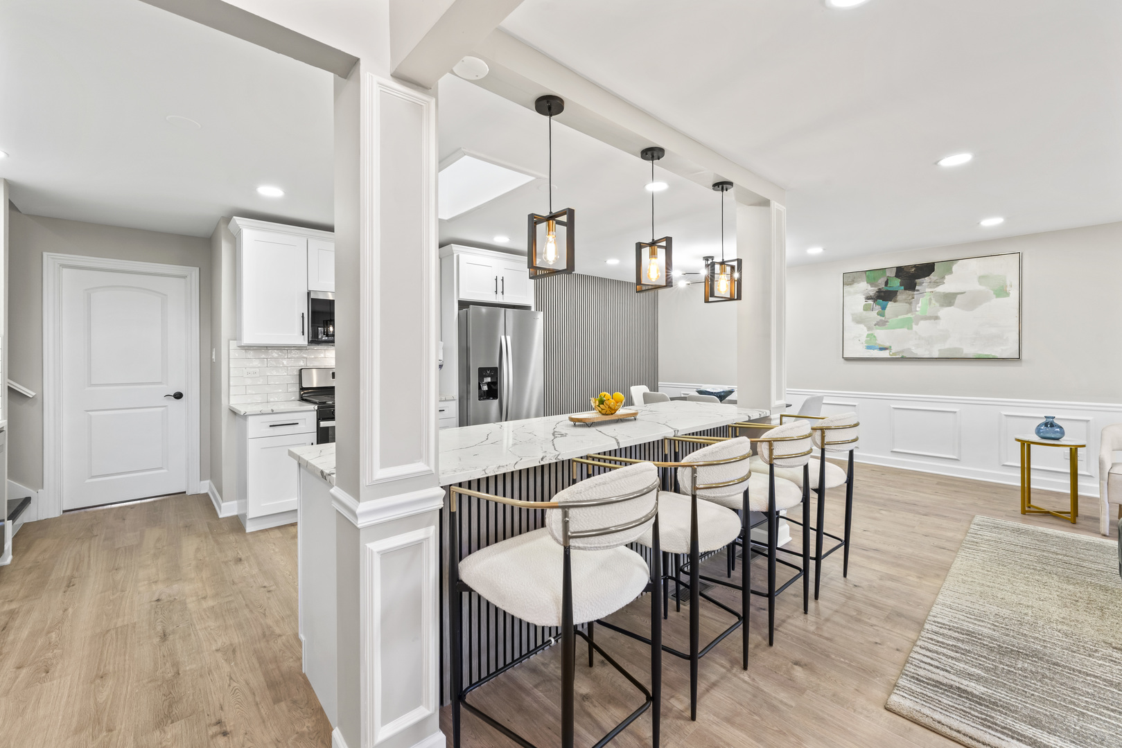 This BREATHTAKING and fully renovated tri-level townhome, nestled on a quiet cul-de-sac in the highly sought-after Eagle Ridge II community, offers the ultimate turn-key experience. Its prime location backs directly onto a serene, large park featuring a scenic walking trail. Every detail has been meticulously upgraded, starting with the installation of gorgeous new flooring throughout all levels and a fresh coat of paint. A crucial element of this top-to-bottom renovation includes all new trim and all new interior doors, upgraded to the modern 2-panel style, providing a clean, contemporary look throughout the entire residence. The open-concept layout highlights the HUGE and stunning new kitchen, designed for both luxury and utility, featuring amazing new white cabinets, a sophisticated white quartz countertop, and elegant tile backsplash, all complemented by a brand new stainless steel appliance package. The kitchen’s centerpiece is a massive 113-inch center island with a counter overhang, making it the perfect breakfast bar. Beyond the custom millwork, which includes elegant wainscoting and chair rail, the dining room boasts a stylish accent wall, adding depth and character to the space, and the living area features a very nice and cozy fireplace, perfect for cool evenings. The staircase has been modernized with new rail spindles. The entire electrical system has been modernized with new can lighting, designer light fixtures, and even new electric outlets and switches. The home features three spacious bedrooms, including a luxurious master suite, and two and a half completely brand new, custom-finished bathrooms, plus the added convenience of a laundry closet with a utility sink. For entertainment, the lower level boasts a newly installed wet bar. Storage is plentiful, with generous closet space throughout and the convenience of pull-down stairs in the 2.5-car attached garage for easy attic access. Enjoy low-maintenance living and an unbeatable location just minutes from shopping, dining, the Metra station, and easy access to the interstate. This is a complete, amazing transformation offering true luxury living in the suburbs.