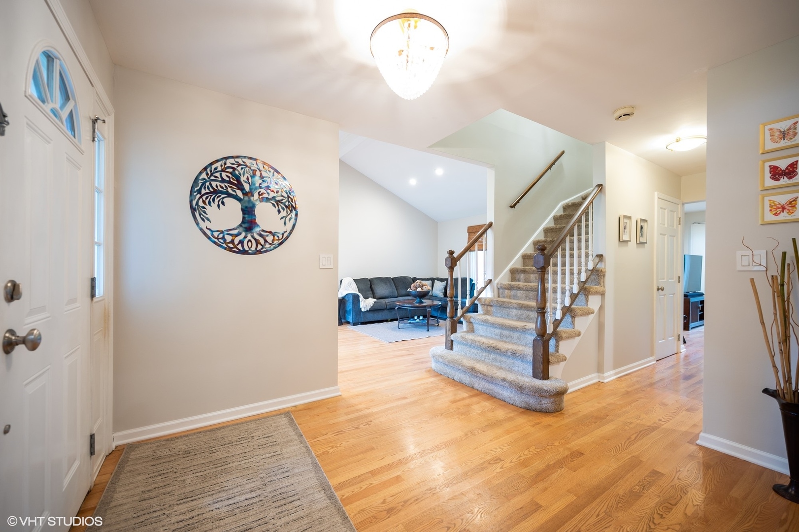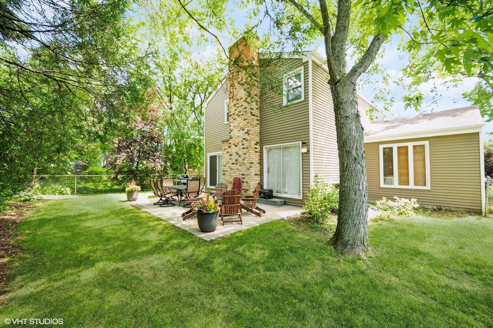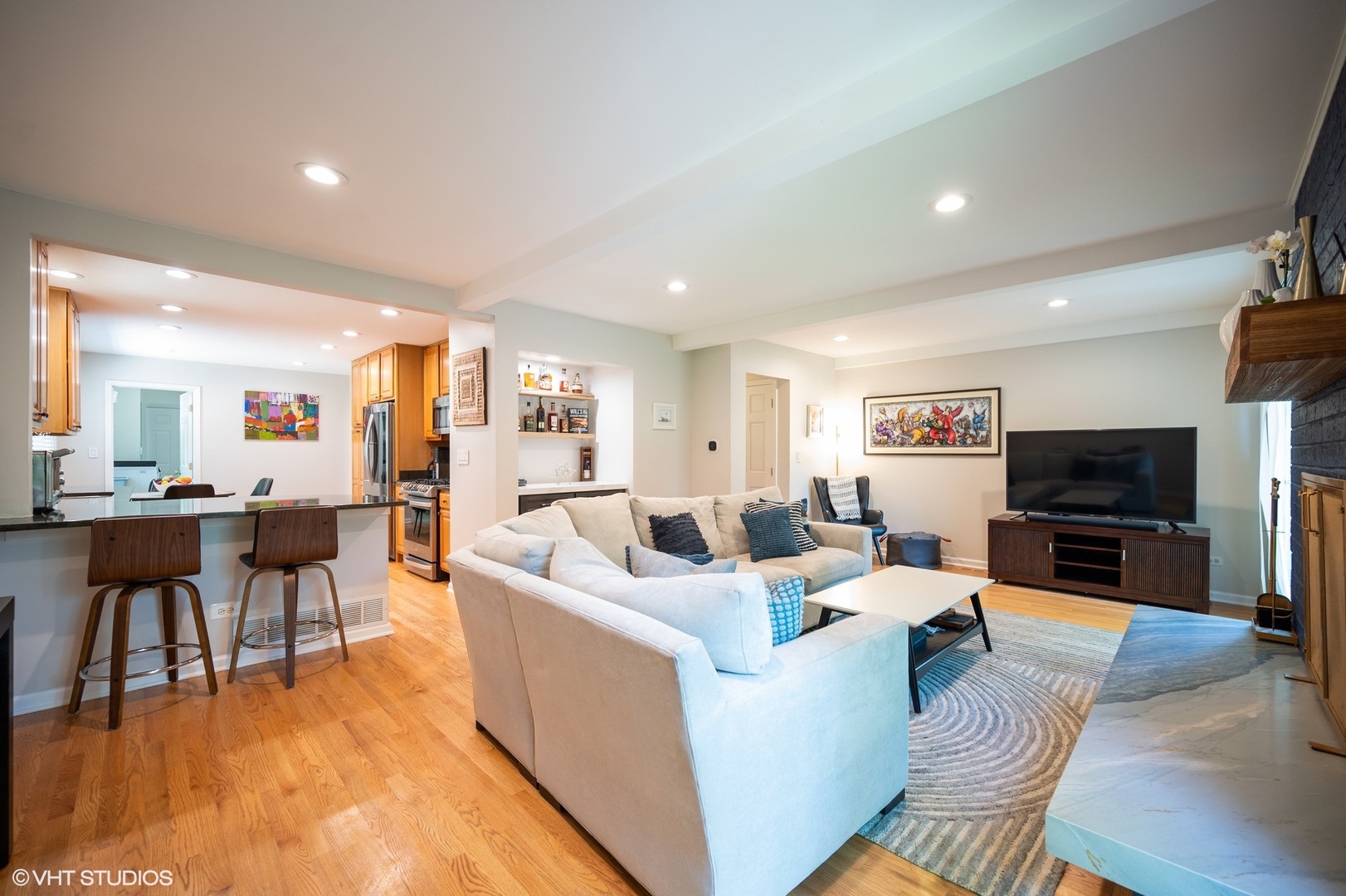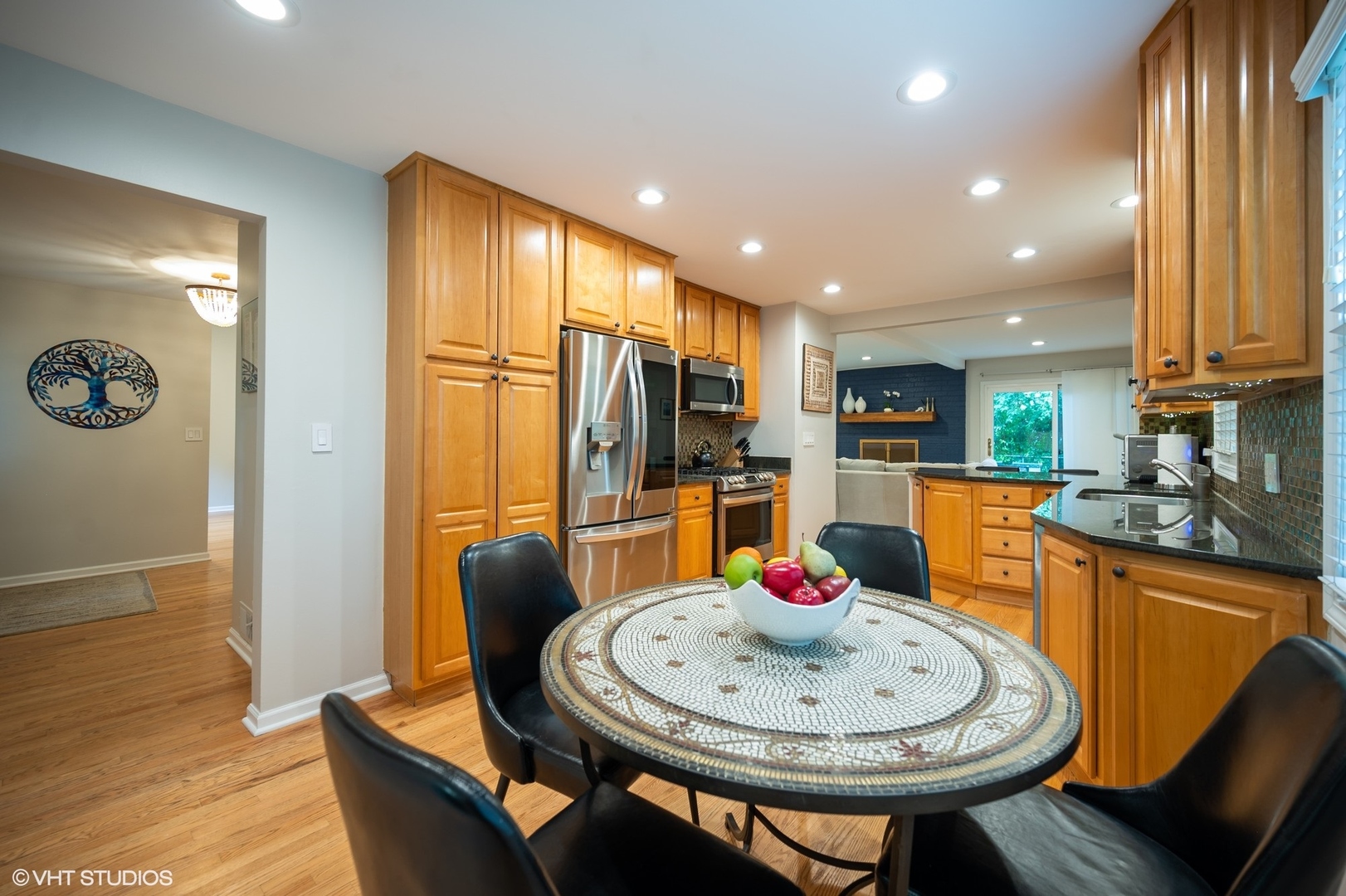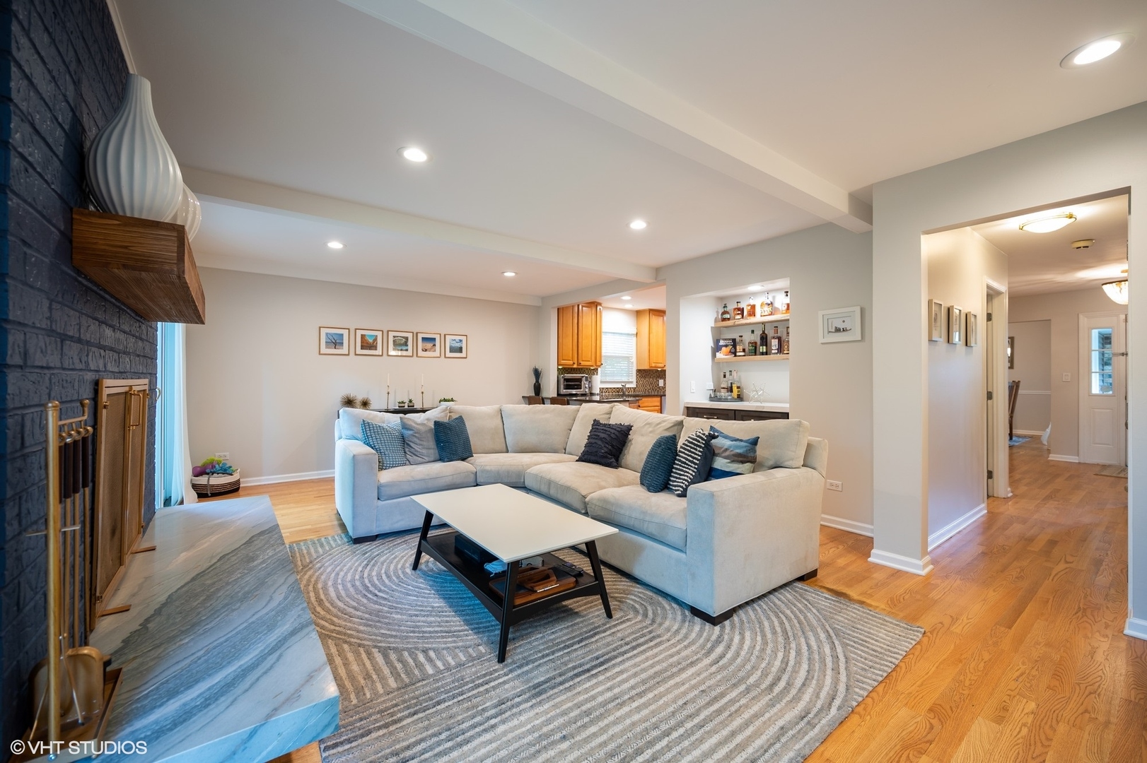 Prepare to fall in love with this beautifully updated & move-in ready colonial located on a quiet street in popular Sherwood Forest. An immaculate brick paver front walk leads to a charming, covered porch & the front door opens to a graciously sized & welcoming foyer. The 1st floor boasts gorgeous hardwood flooring, recessed lighting, and a terrific circular floor plan for easy entertaining and daily living. Fabulous eat-in kitchen features 42″ cabinets, granite countertops, newer stainless steel LG appliances including a French door fridge/freezer, 5 burner gas oven/range, microwave (2019) and Bosch dishwasher (2021) with a generously sized table area plus a peninsula with stool seating – all open to the family room. The stunning family room has a striking brick surround wood burning fireplace w/ a gas starter, gorgeous quartzite hearth, a dramatic charcoal colored dry bar (plumbed to be a wet bar) with quartz countertop & floating wood shelving, and double sliding glass doors overlooking the paver patio & fenced backyard. Sunny & spacious living room w/ vaulted ceiling, formal dining room w/ chair rail molding, neutral/updated powder room, and convenient 1st floor laundry/mud room with brand new LG front load W/D (2025), laundry chute, exterior door to a separate dog run and access to the oversized attached garage outfitted with an EV charger. The roomy primary suite features an organized WIC and updated bath w/ Carrera marble floors, handsome navy “his & her” vanities, glass enclosed shower and LED/anti-fog mirrors. Ample secondary bedrooms all with large, organized closets and share a big hall bath with dual white sink vanities w/ marble counters. The basement is finished with luxury vinyl plank flooring in both the recreation room & office, has a huge mechanical/storage room plus two concrete crawl spaces for additional storage. Other upgrades include a brand-new roof (2025), new siding (2022), updated HVAC (2015) and easy access to parks, downtown HP & downtown Deerfield, Ravinia, Lake MI, transportation, shopping, recreation and so much more.