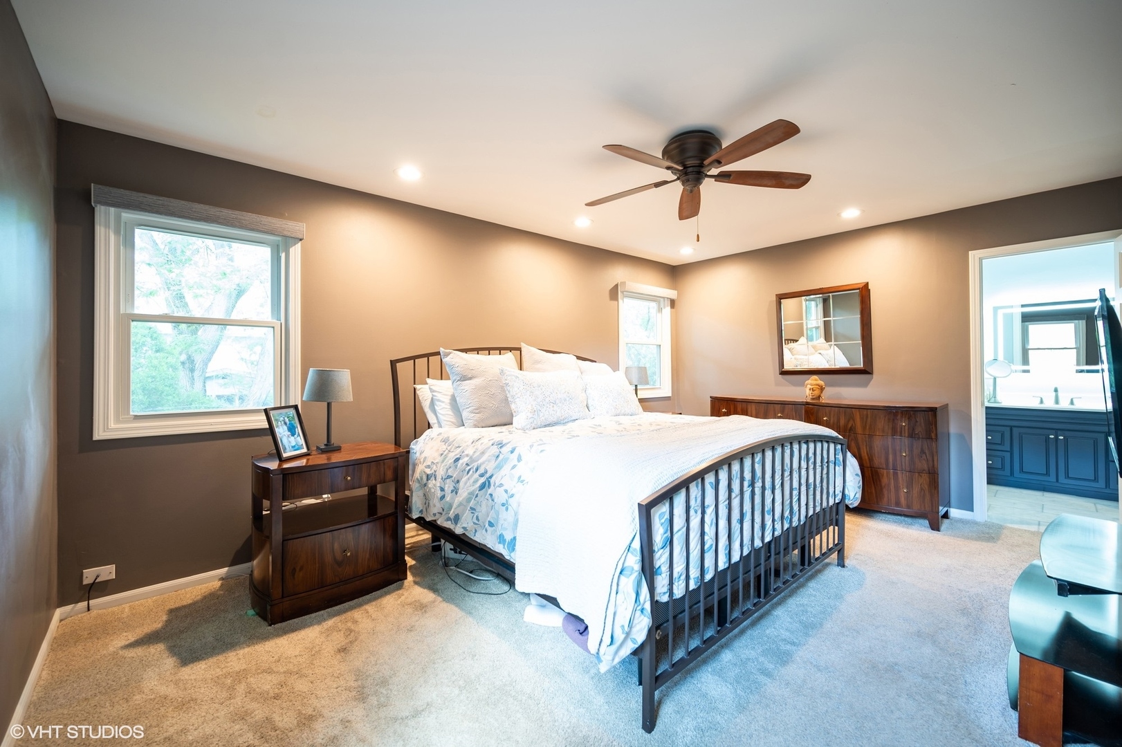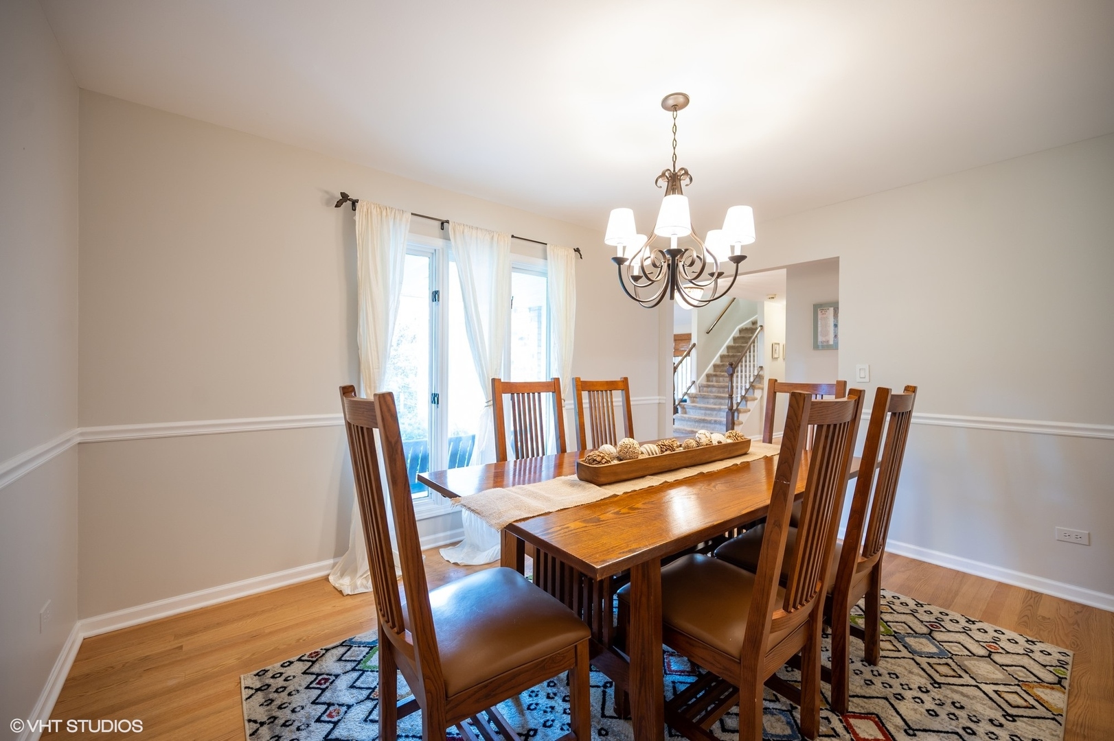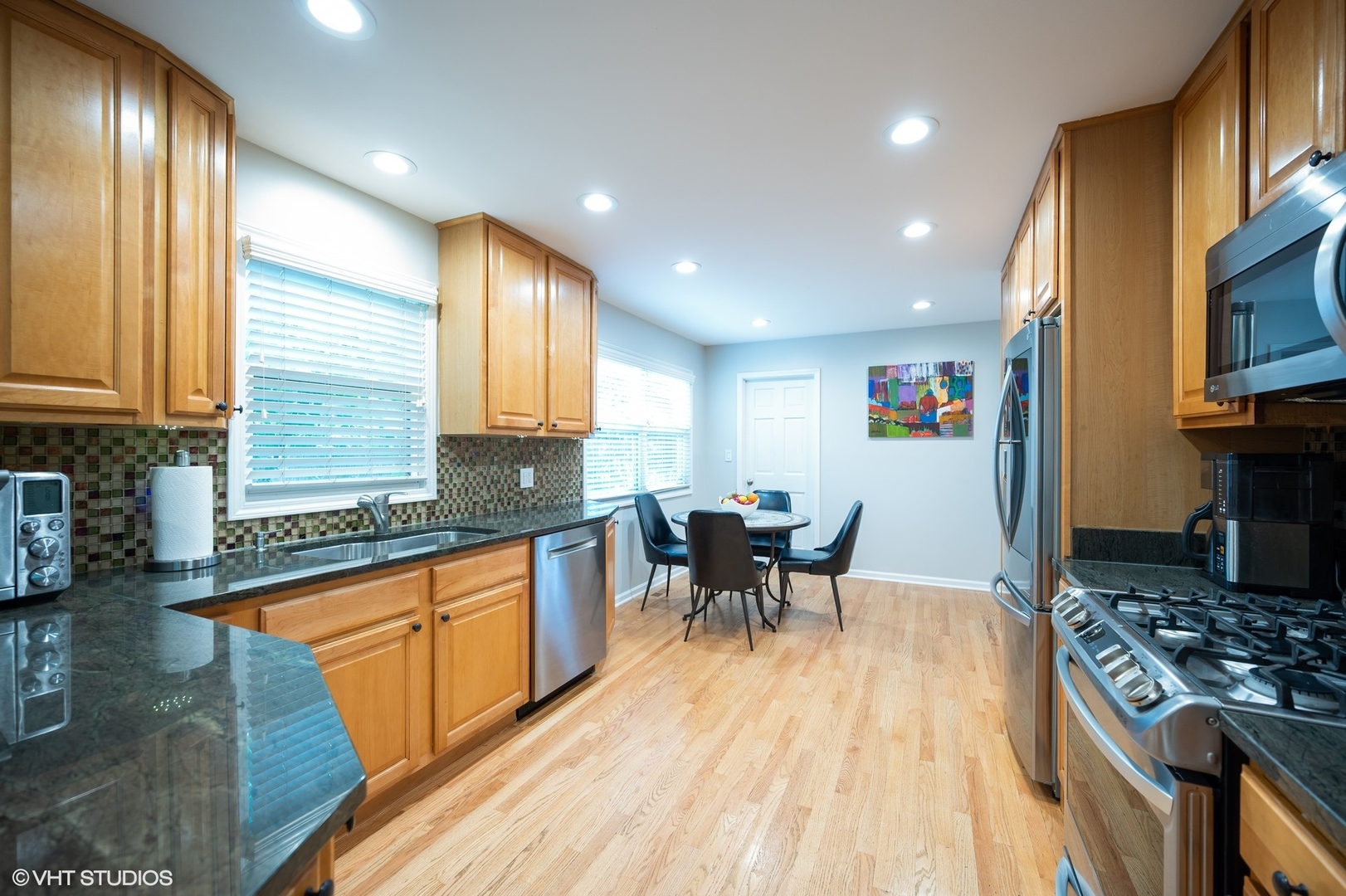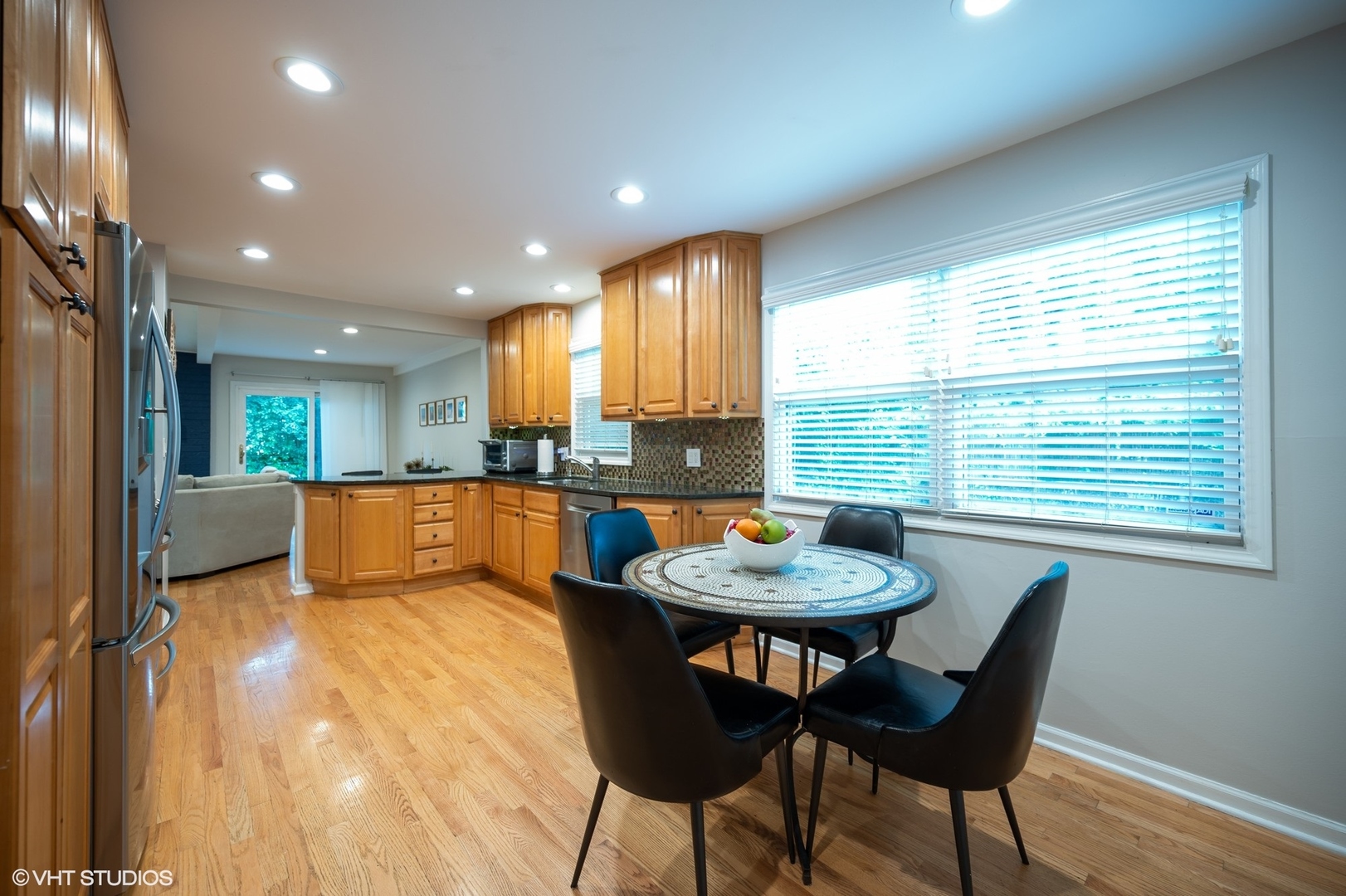 Prepare to fall in love with this beautifully updated & move-in ready colonial located on a quiet street in popular Sherwood Forest. An immaculate brick paver front walk leads to a charming, covered porch & the front door opens to a graciously sized & welcoming foyer. The 1st floor boasts gorgeous hardwood flooring, recessed lighting, and a terrific circular floor plan for easy entertaining and daily living. Fabulous eat-in kitchen features 42″ cabinets, granite countertops, newer stainless steel LG appliances including a French door fridge/freezer, 5 burner gas oven/range, microwave (2019) and Bosch dishwasher (2021) with a generously sized table area plus a peninsula with stool seating – all open to the family room. The stunning family room has a striking brick surround wood burning fireplace w/ a gas starter, gorgeous quartzite hearth, a dramatic charcoal colored dry bar (plumbed to be a wet bar) with quartz countertop & floating wood shelving, and double sliding glass doors overlooking the paver patio & fenced backyard. Sunny & spacious living room w/ vaulted ceiling, formal dining room w/ chair rail molding, neutral/updated powder room, and convenient 1st floor laundry/mud room with brand new LG front load W/D (2025), laundry chute, exterior door to a separate dog run and access to the oversized attached garage outfitted with an EV charger. The roomy primary suite features an organized WIC and updated bath w/ Carrera marble floors, handsome navy “his & her” vanities, glass enclosed shower and LED/anti-fog mirrors. Ample secondary bedrooms all with large, organized closets and share a big hall bath with dual white sink vanities w/ marble counters. The basement is finished with luxury vinyl plank flooring in both the recreation room & office, has a huge mechanical/storage room plus two concrete crawl spaces for additional storage. Other upgrades include a brand-new roof (2025), new siding (2022), updated HVAC (2015) and easy access to parks, downtown HP & downtown Deerfield, Ravinia, Lake MI, transportation, shopping, recreation and so much more.