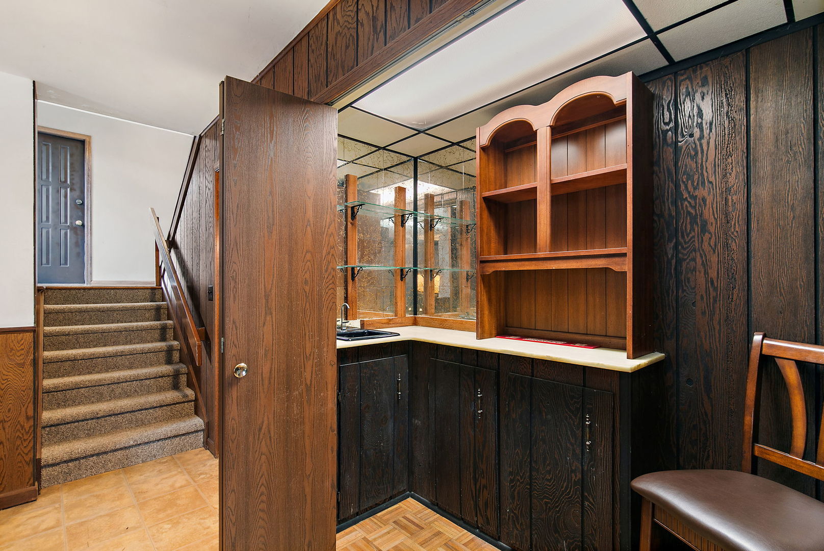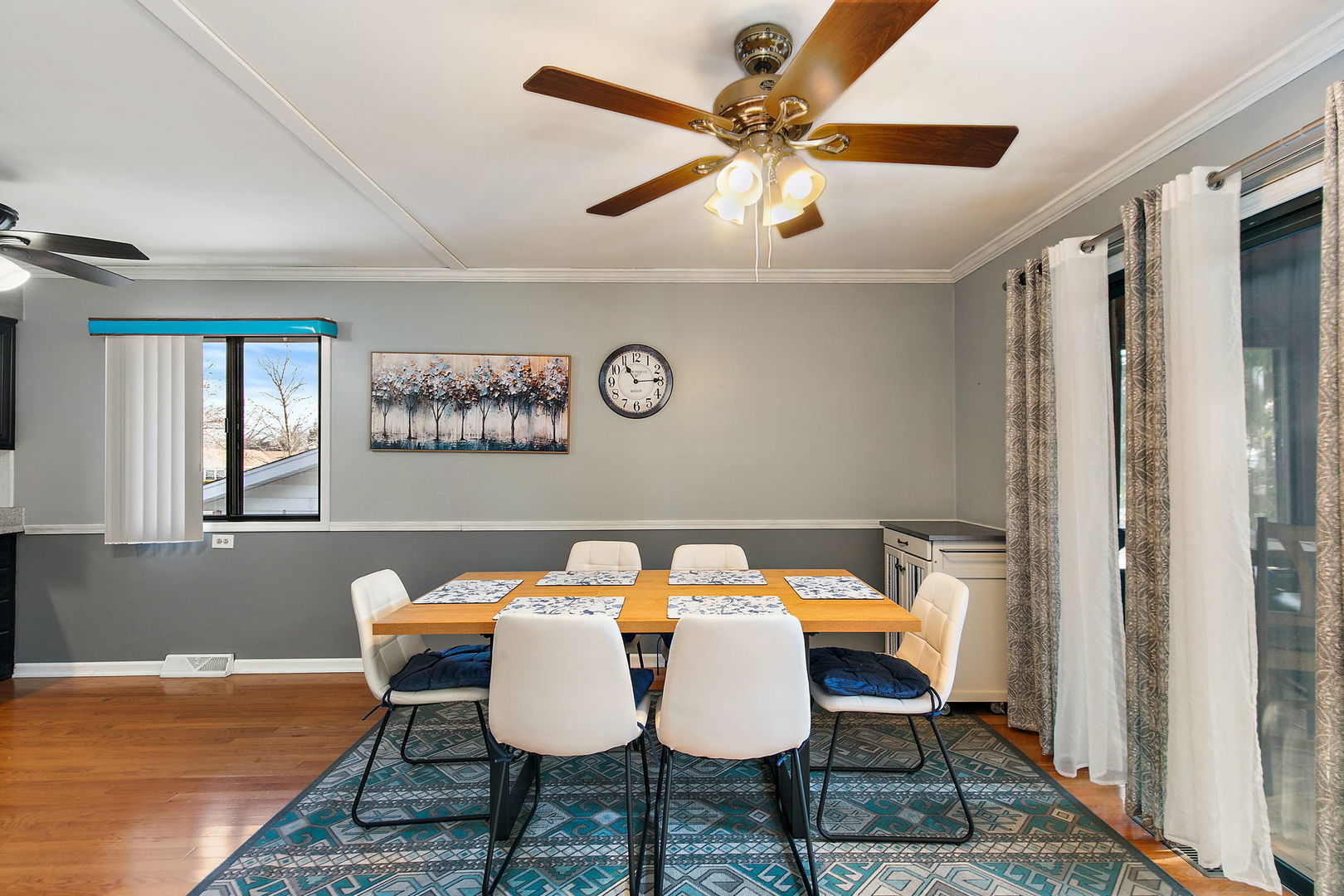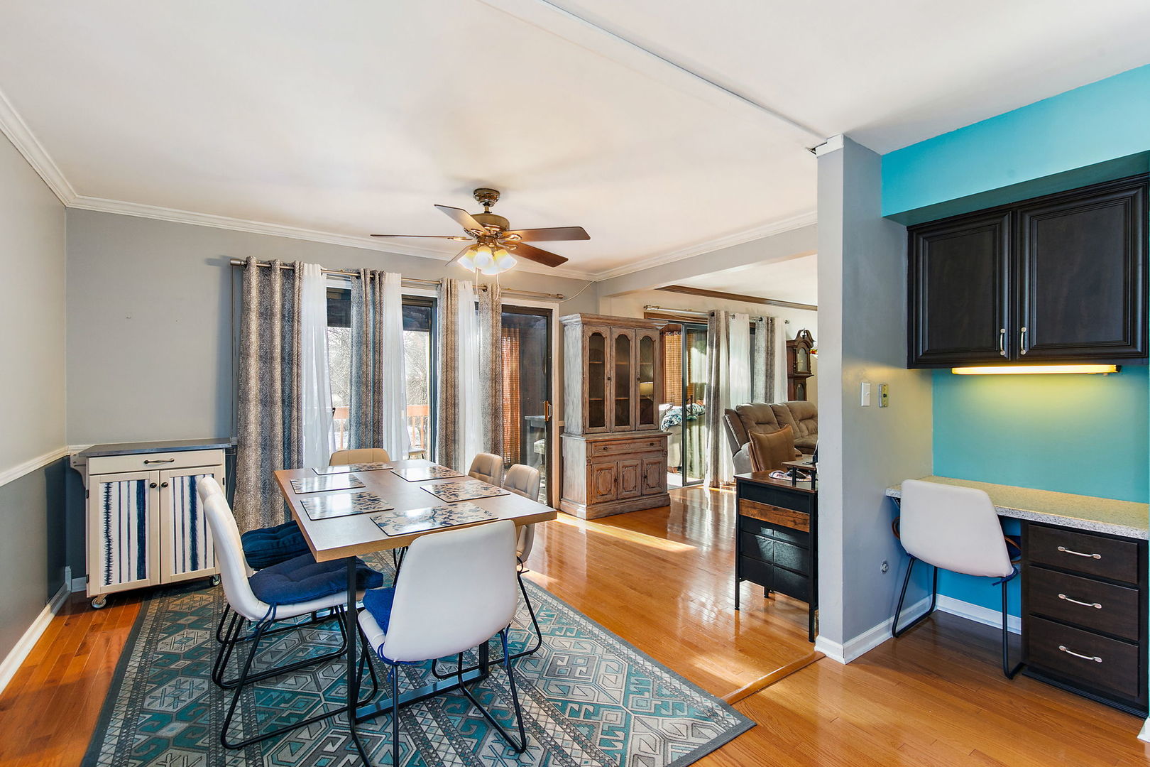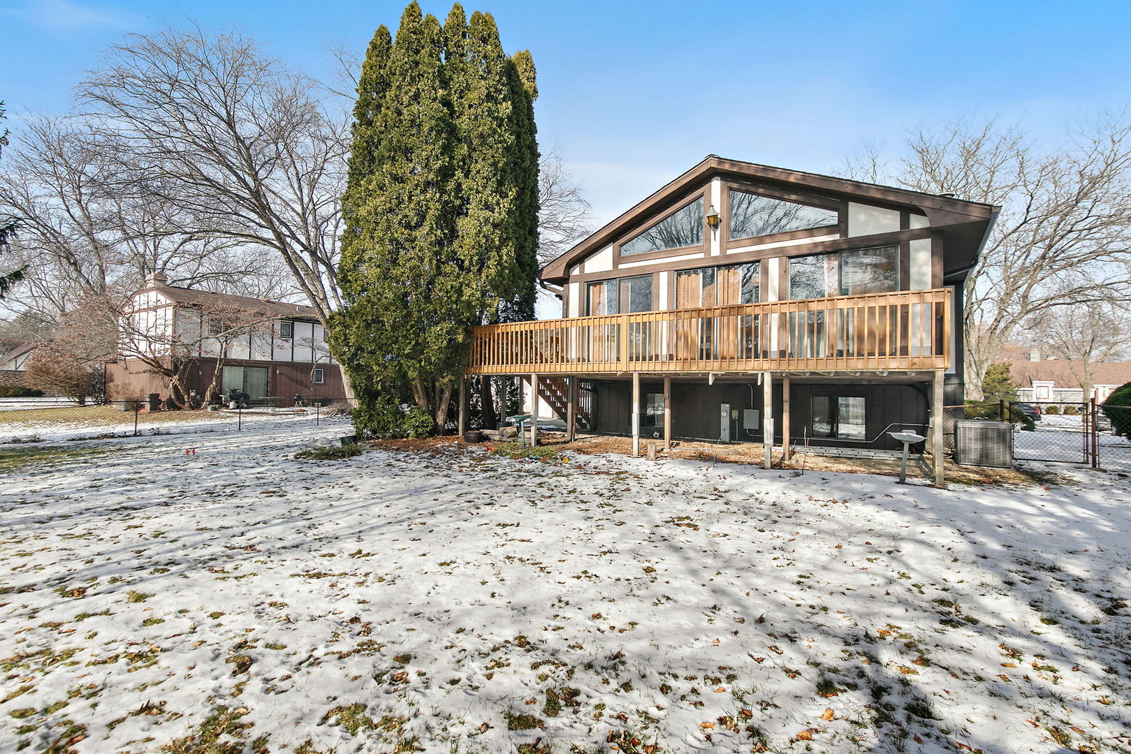 Well maintained by the original owners, this beautiful 5-bedroom split-level home is tucked away on a quiet cul-de-sac in the desirable Country Knolls subdivision. French doors welcome you into the inviting foyer with a sliding glass door to the backyard and leads up to the main level, featuring a spacious living room with crown molding and another slider to the sunroom. The kitchen offers hardwood flooring, stainless steel appliances, abundant cabinet and counter space, a huge pantry, planning desk, Corian countertops, and opens to the dining room with sliding doors leading to the sunroom. The sunroom boasts a vaulted wood ceiling, multiple sliding doors to the deck, and picturesque views of the backyard. The primary bedroom includes a walk-in closet, an additional storage closet, and a private en-suite bath, while two additional bedrooms and a full bath complete the upper level. The finished lookout basement expands the living space with a large family room featuring a cozy stone fireplace and wet bar, a versatile game/rec room that could be converted to an additional bedroom, two more bedrooms, a full bath with a soaking tub, a laundry room with utility sink and storage cabinets, and a separate storage area. Outside, enjoy relaxing on the expansive deck overlooking the private fenced yard. Ideally located near Randall Road with convenient access to shopping, dining, and the interstate, this home offers space, comfort, and an unbeatable location-truly a great place to call home.